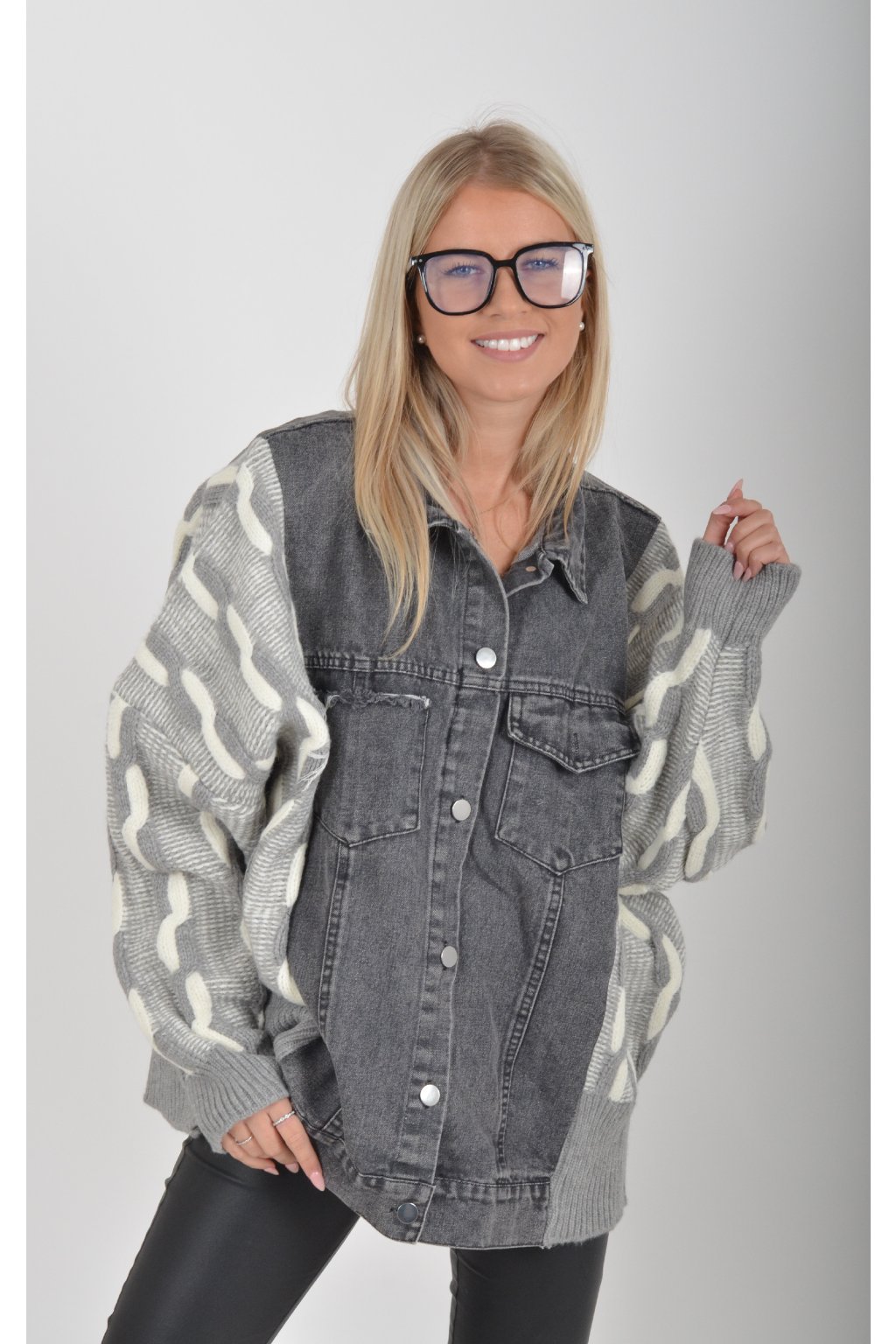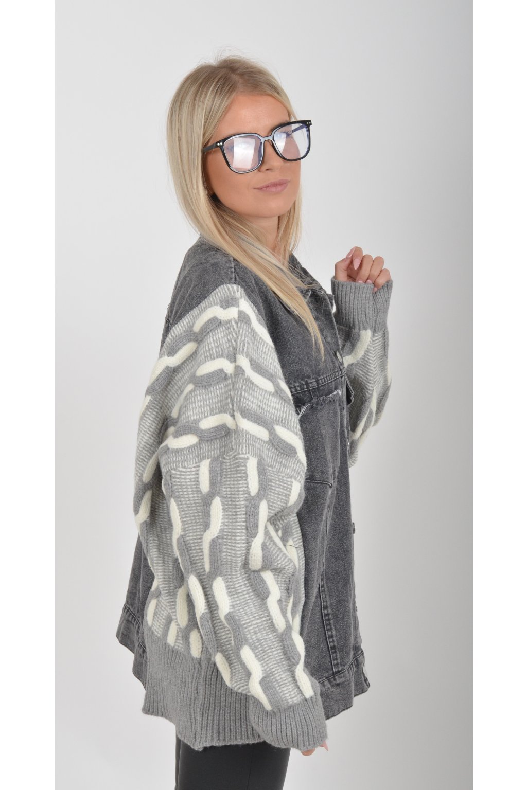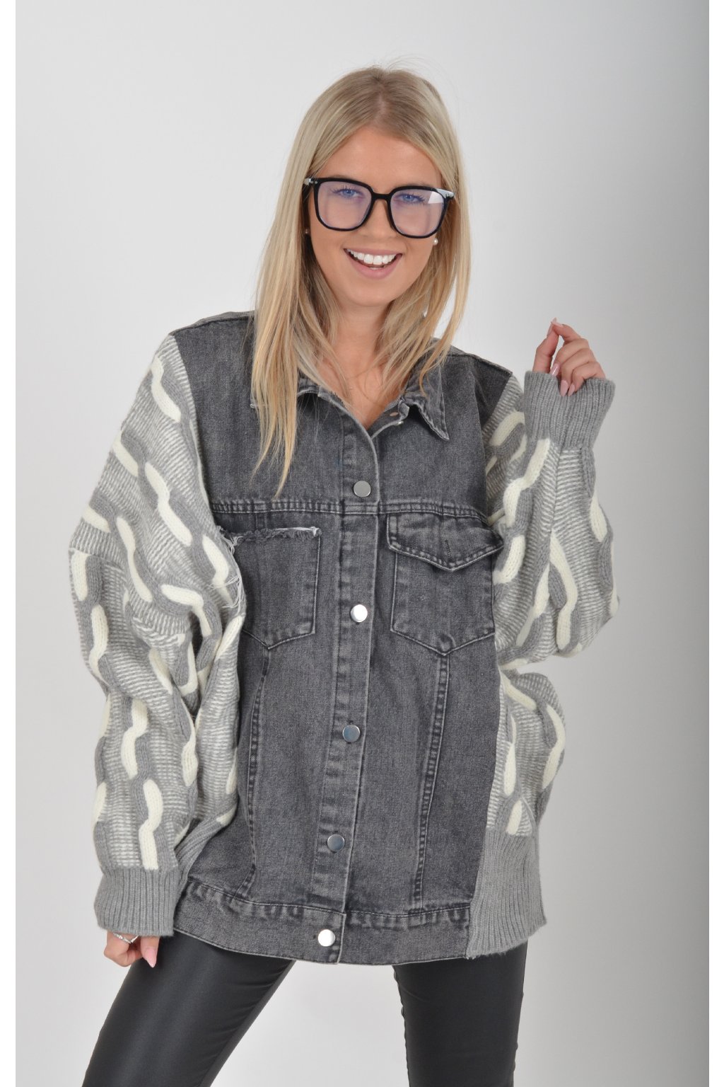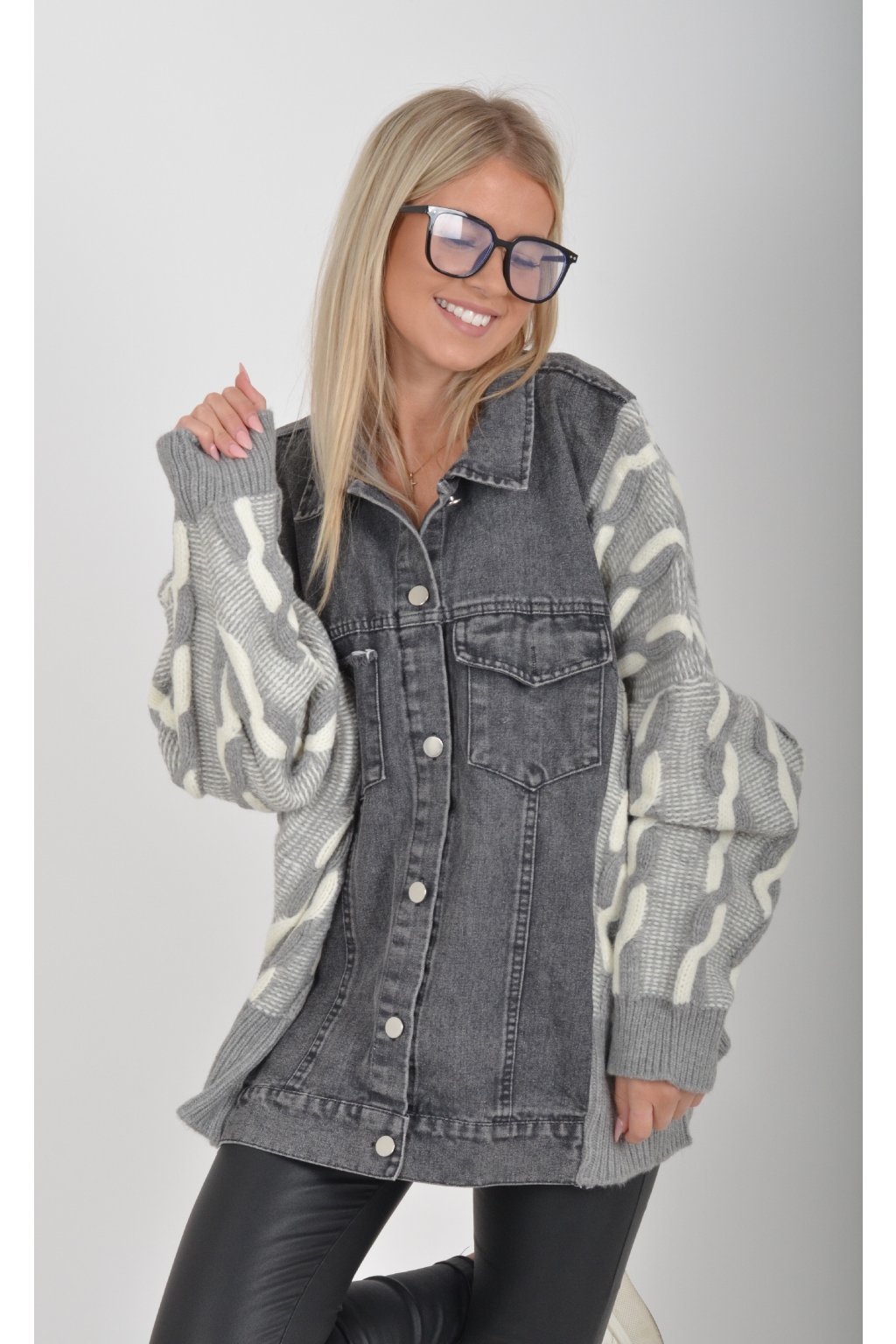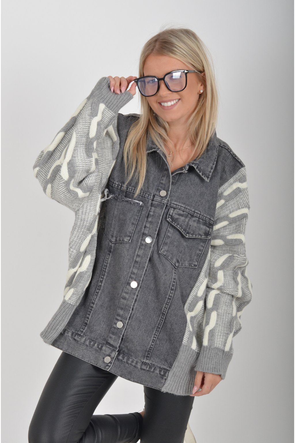 Přechodová oversize bunda s kombinací materiálu džínoviny a úpletu. Má náprsní kapsy a zapínání na knoflíky. Skvěle se hodí jak džínům, tak i k legínám.