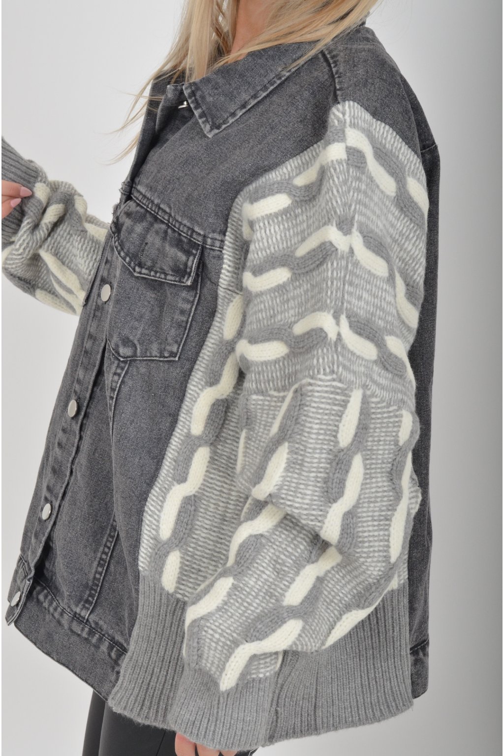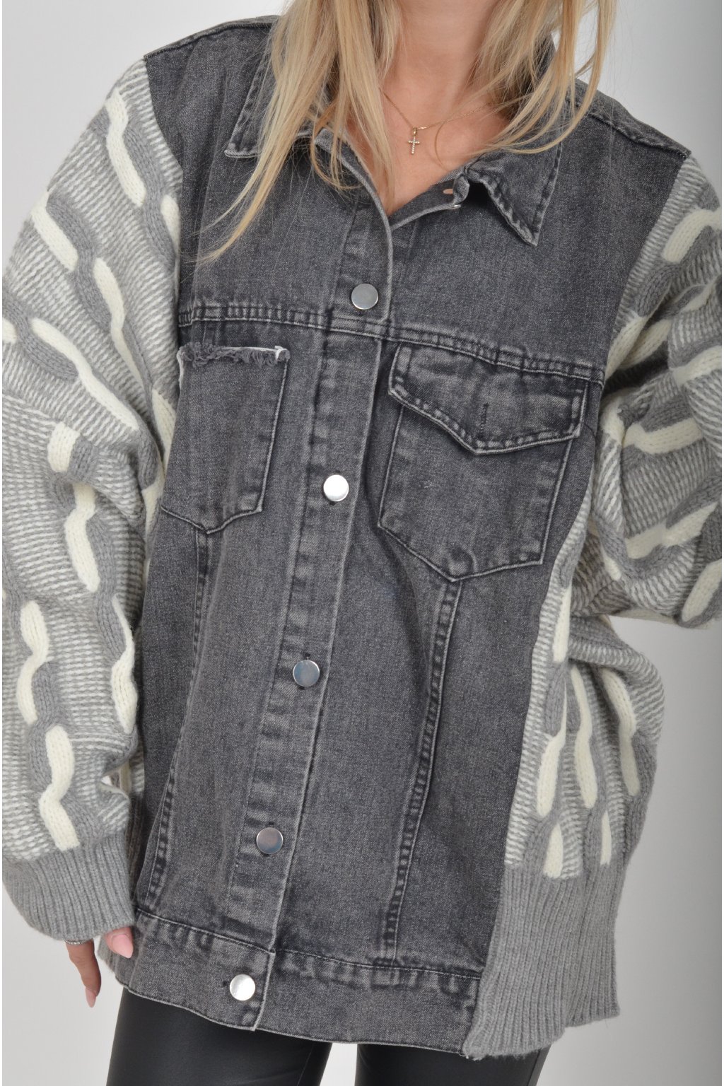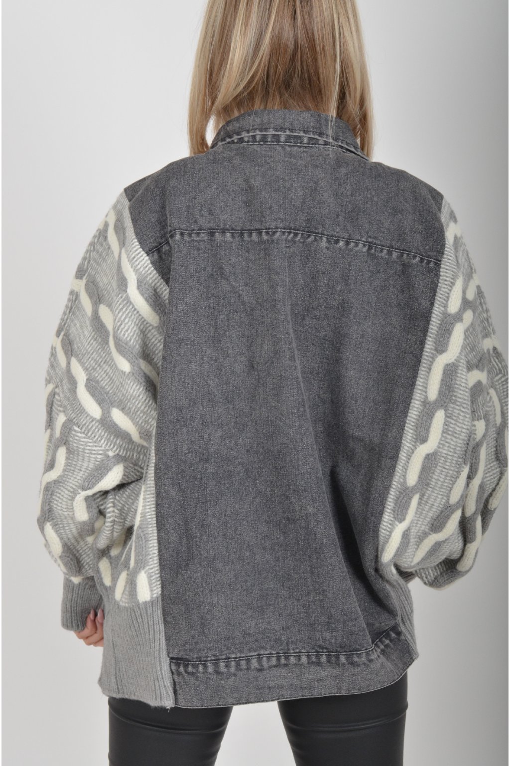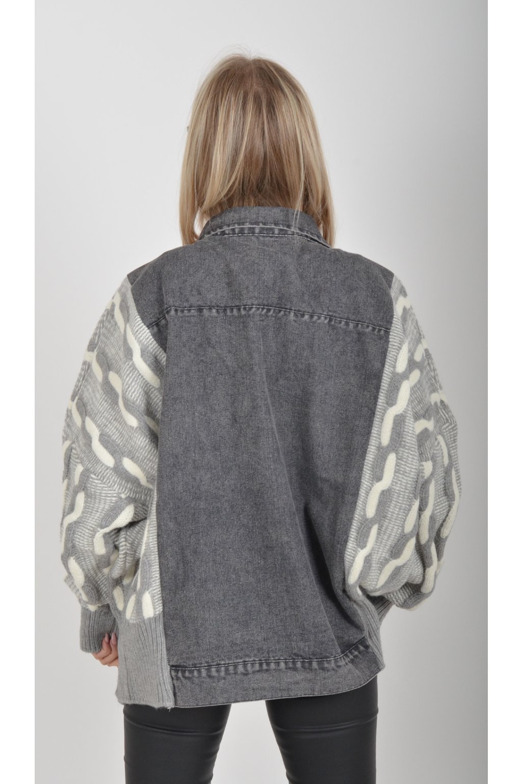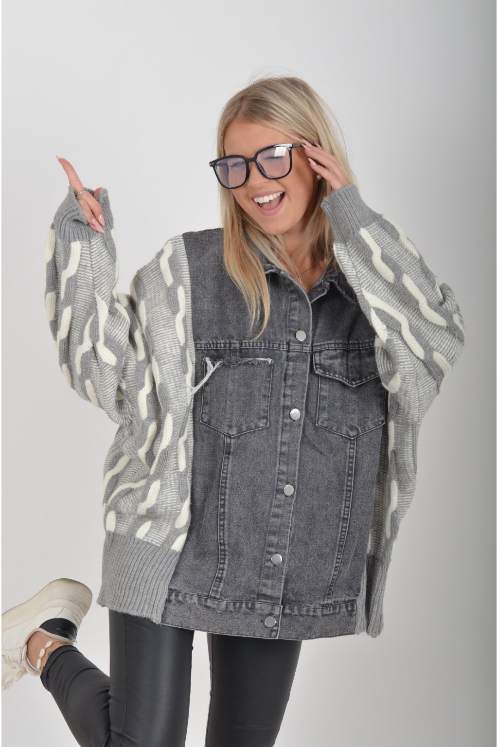 Přechodová oversize bunda s kombinací materiálu džínoviny a úpletu. Má náprsní kapsy a zapínání na knoflíky. Skvěle se hodí jak džínům, tak i k legínám.