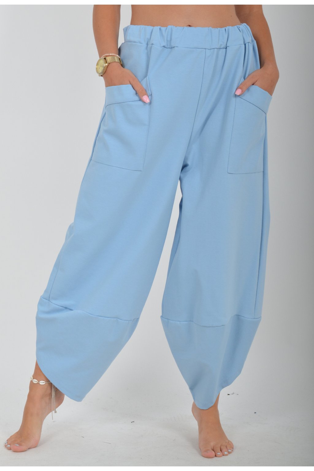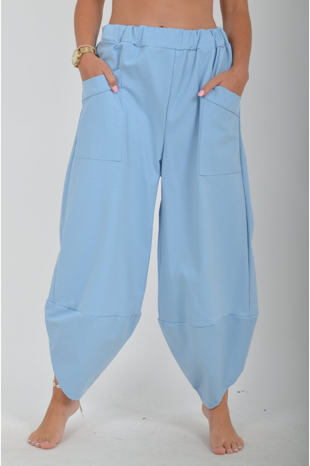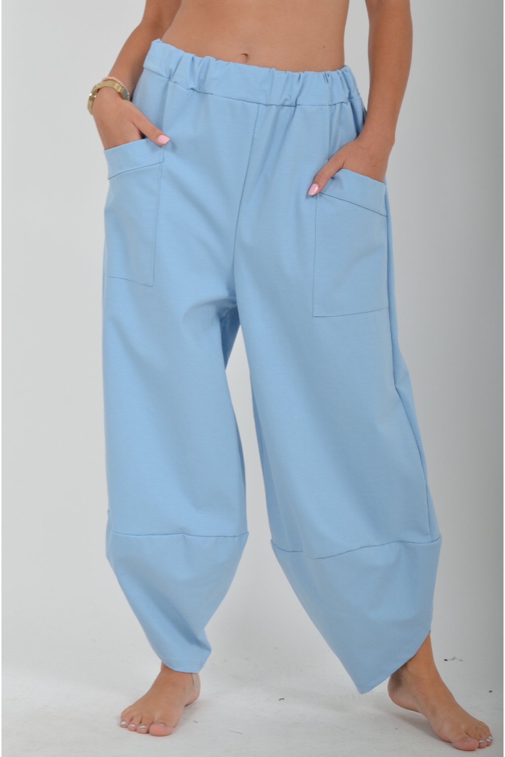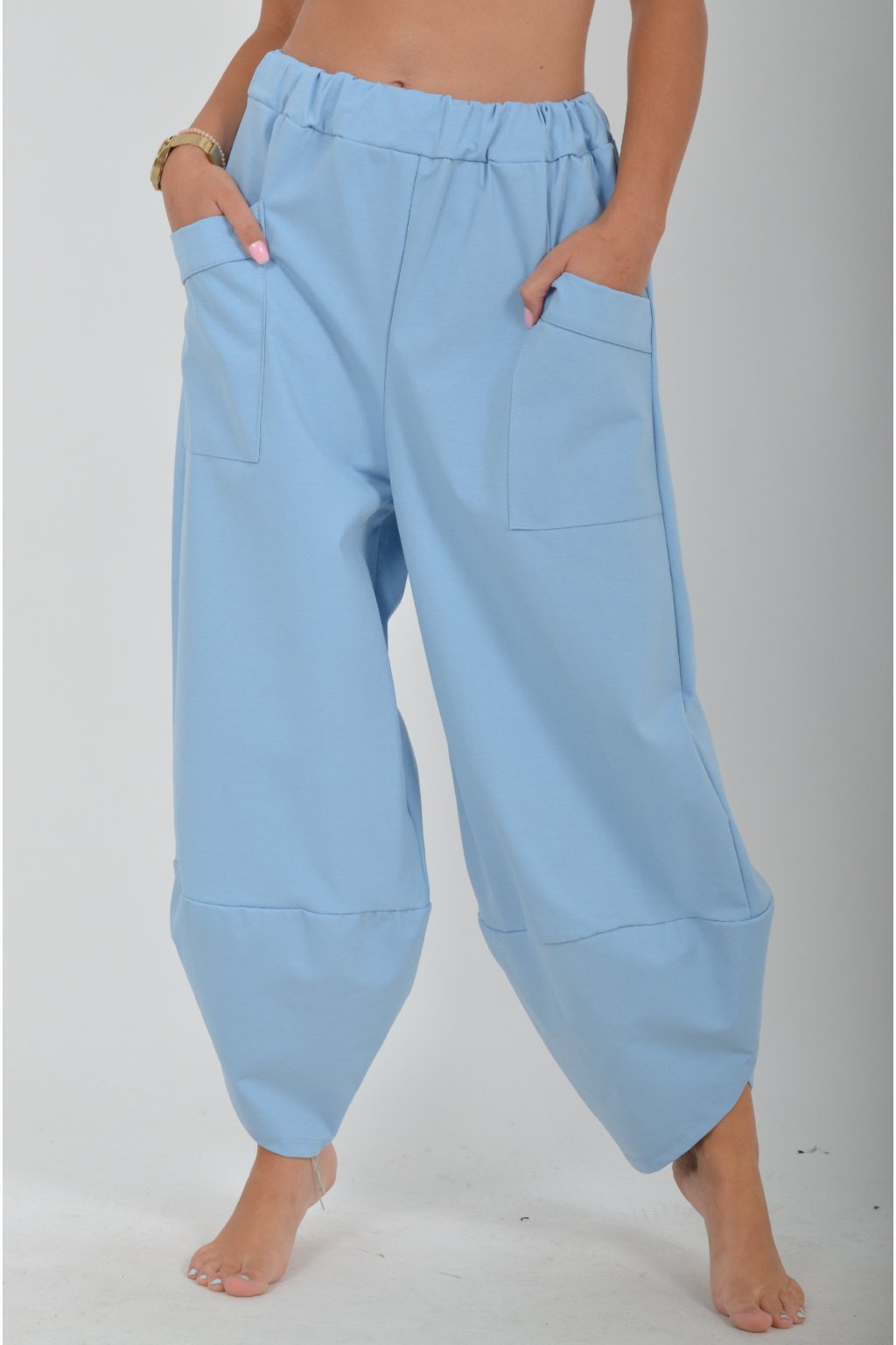 Volnější kalhoty teplákového stylu s kapsami v přední části. Mají v pase zapracovanou gumu a jsou velice příjemné pro pohodlné nošení.
