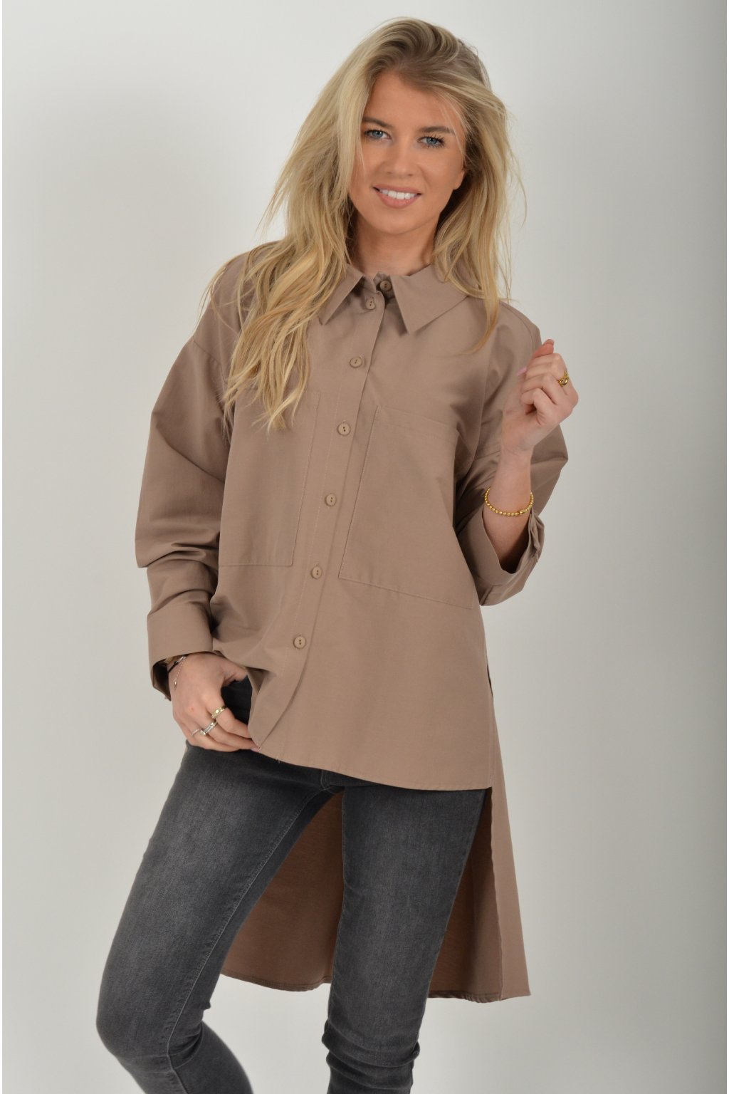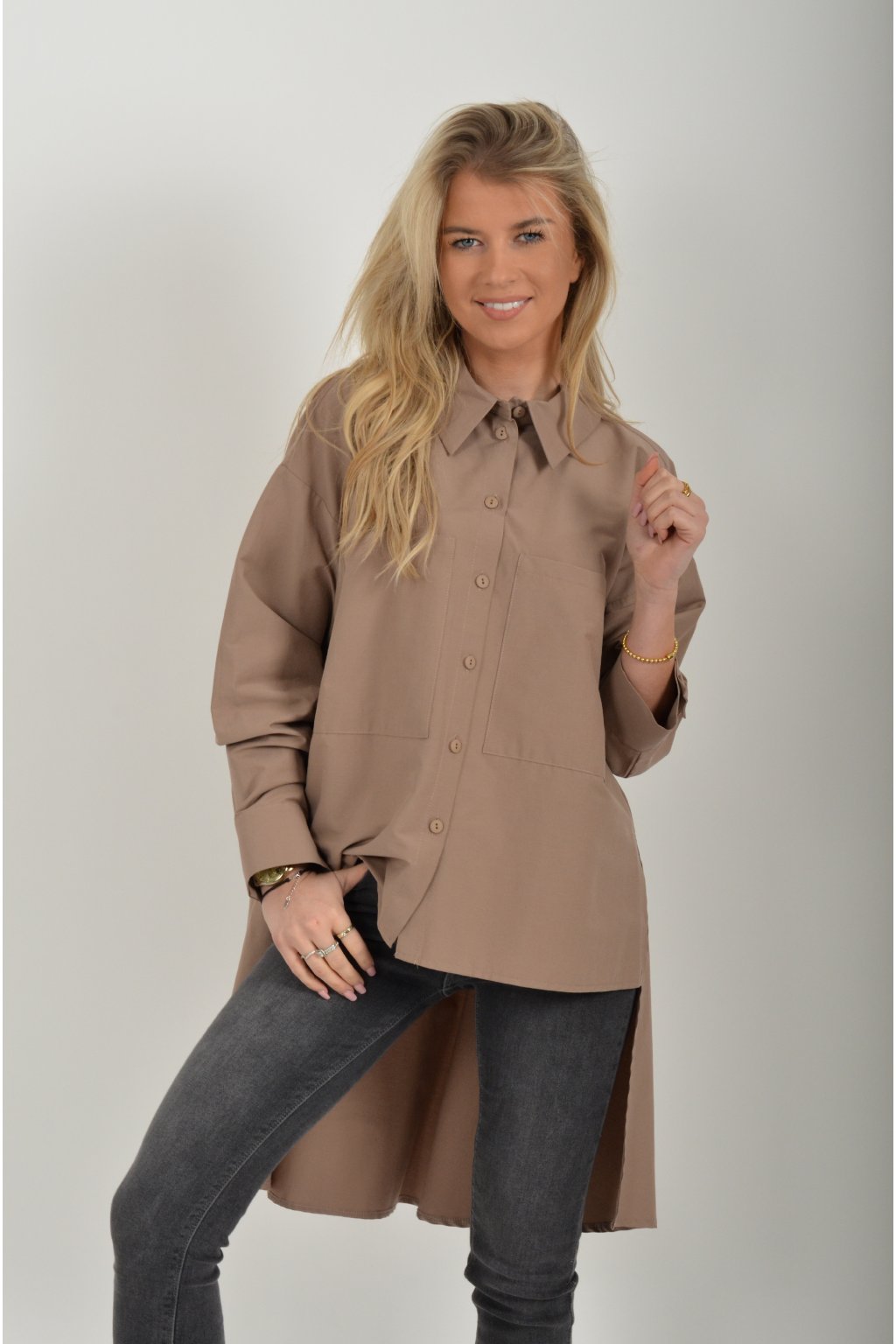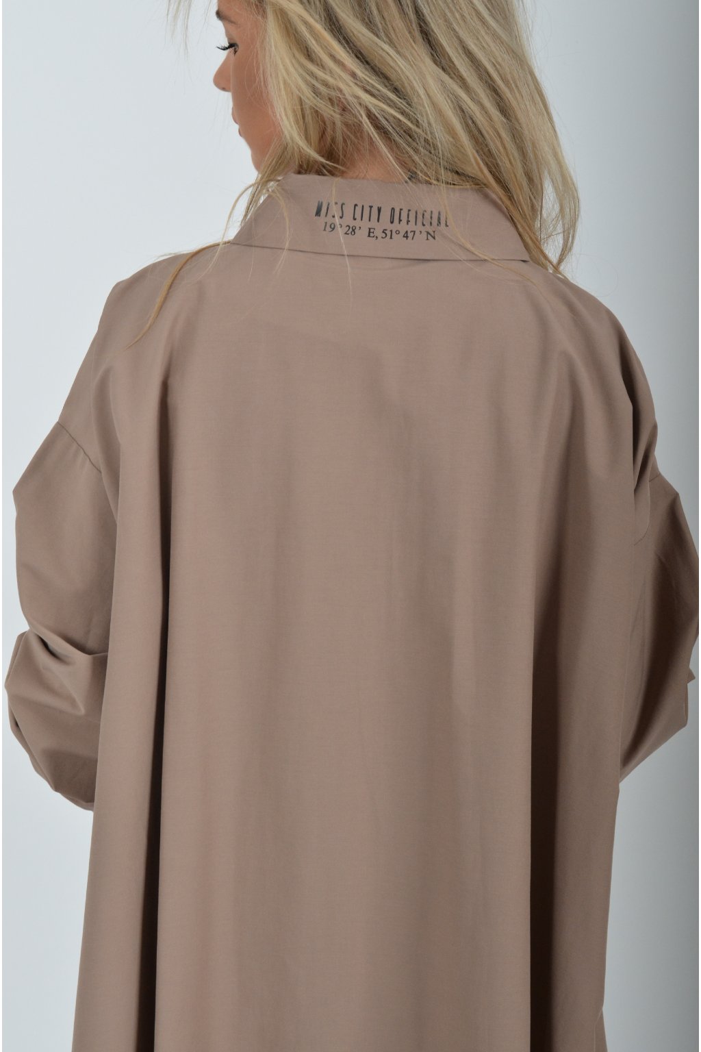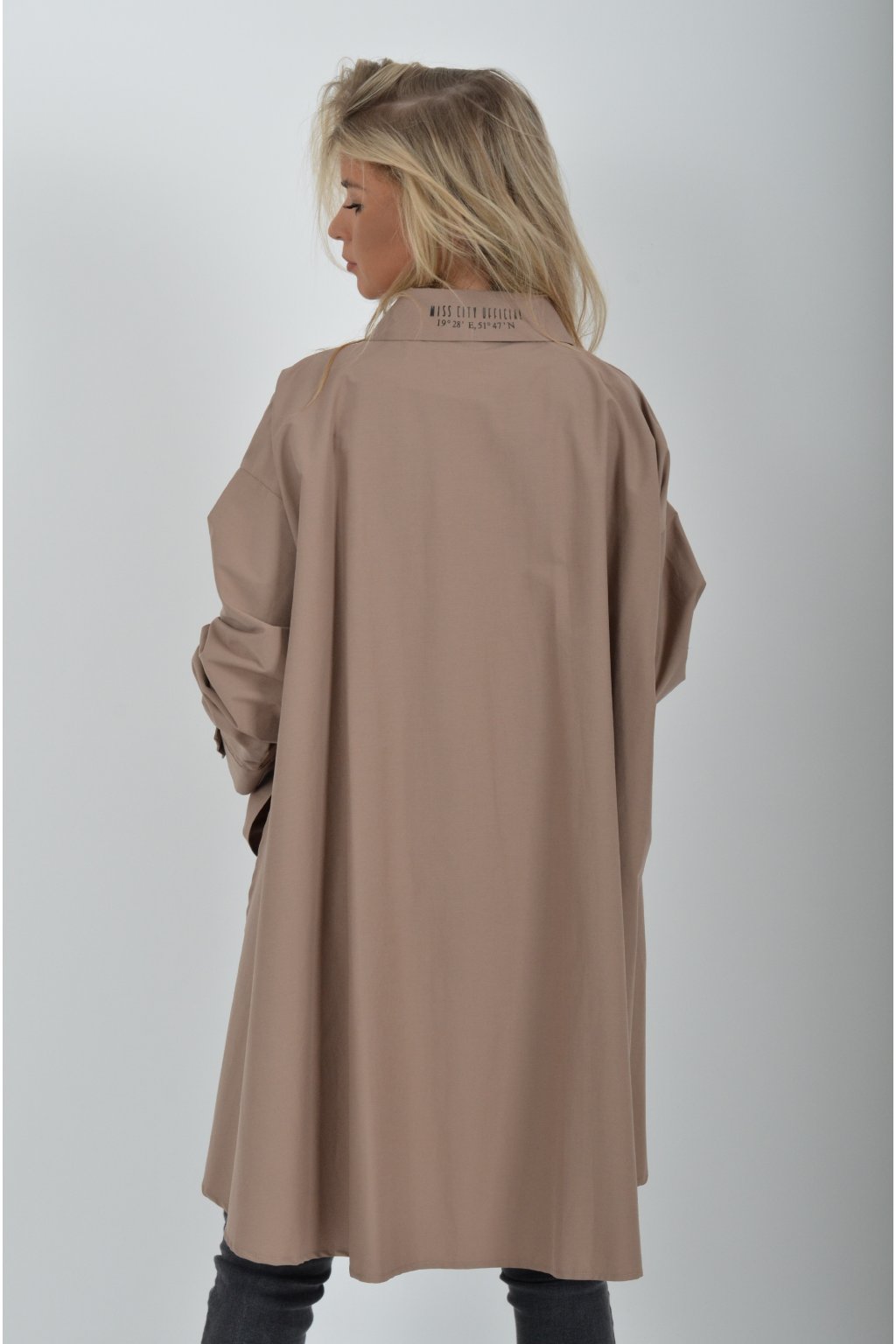 Luxusní košile atypického áčkového střihu s límečkem od značky Miss City Official. Zadní část košile je výrazně delší než přední, čímž optický prodlouží postavu. Má náprsní kapsy a dlouhý rukáv. Zapínání je na knoflíky. Košile je vyrobena z velice příjemného materiálu. Je vhodná jak džínům, tak k legínám. Hodí se jak do společnosti, tak i ke každodennímu nošení.