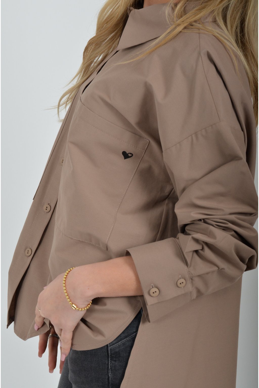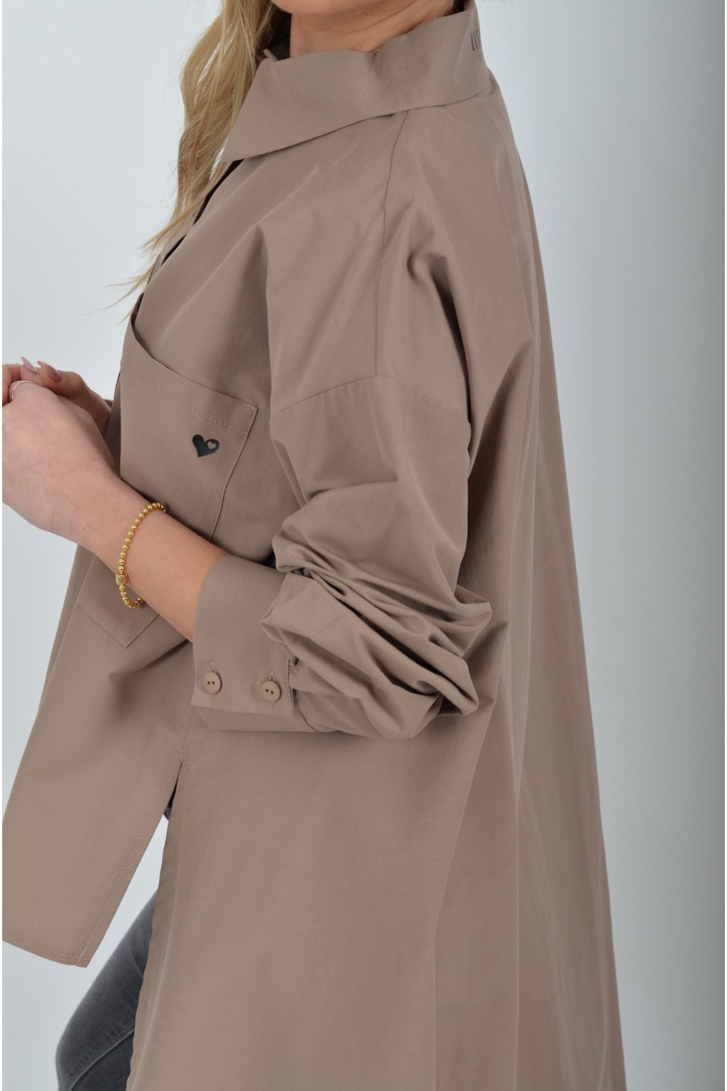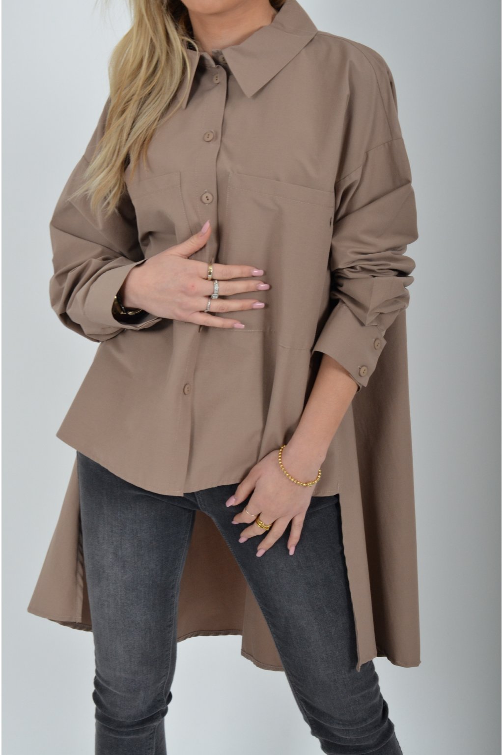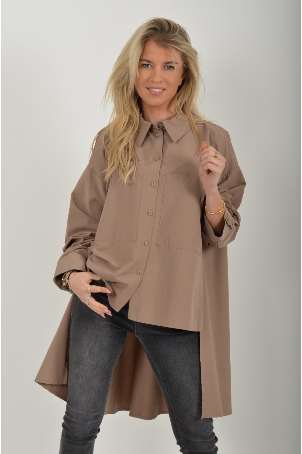 Luxusní košile atypického áčkového střihu s límečkem od značky Miss City Official. Zadní část košile je výrazně delší než přední, čímž optický prodlouží postavu. Má náprsní kapsy a dlouhý rukáv. Zapínání je na knoflíky. Košile je vyrobena z velice příjemného materiálu. Je vhodná jak džínům, tak k legínám. Hodí se jak do společnosti, tak i ke každodennímu nošení.