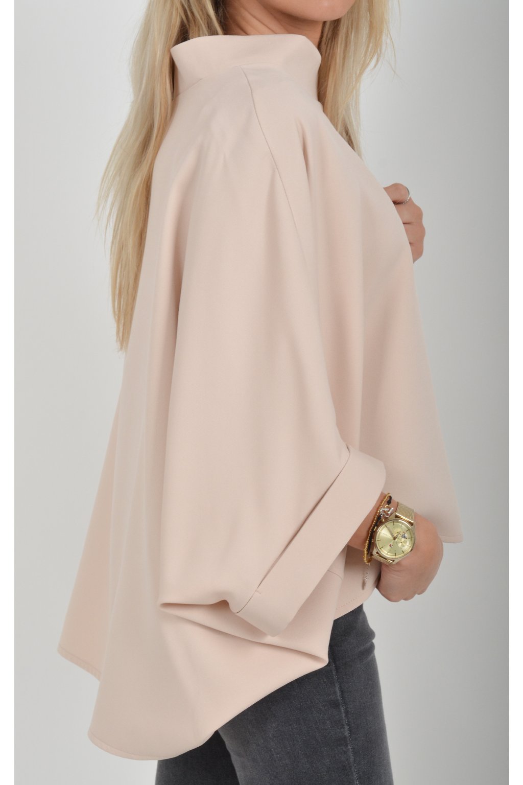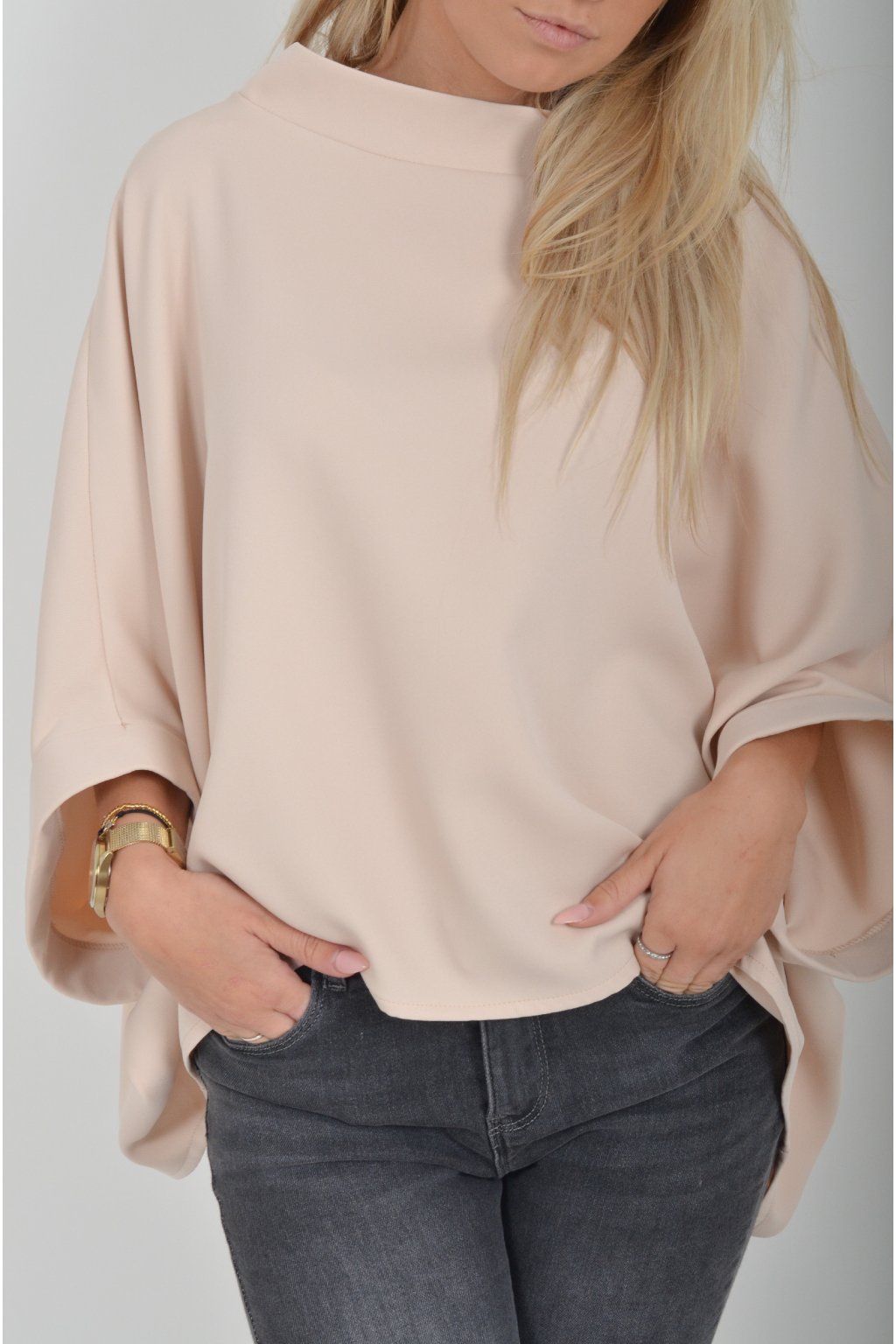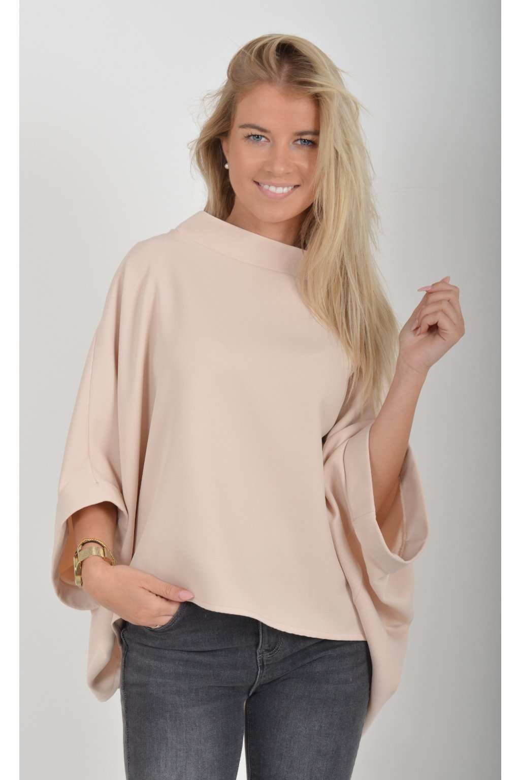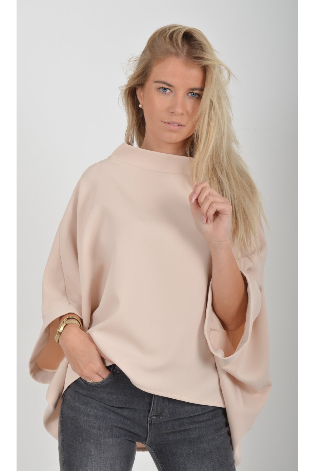 Halenka s netopýřím rukávem vhodná jak pro společenské události, tak i volnočasové nošení. Je vyrobena z velice příjemného a pevného materiálu. Přední část halenky je kratší než zadní. Je volnějšího střihu.