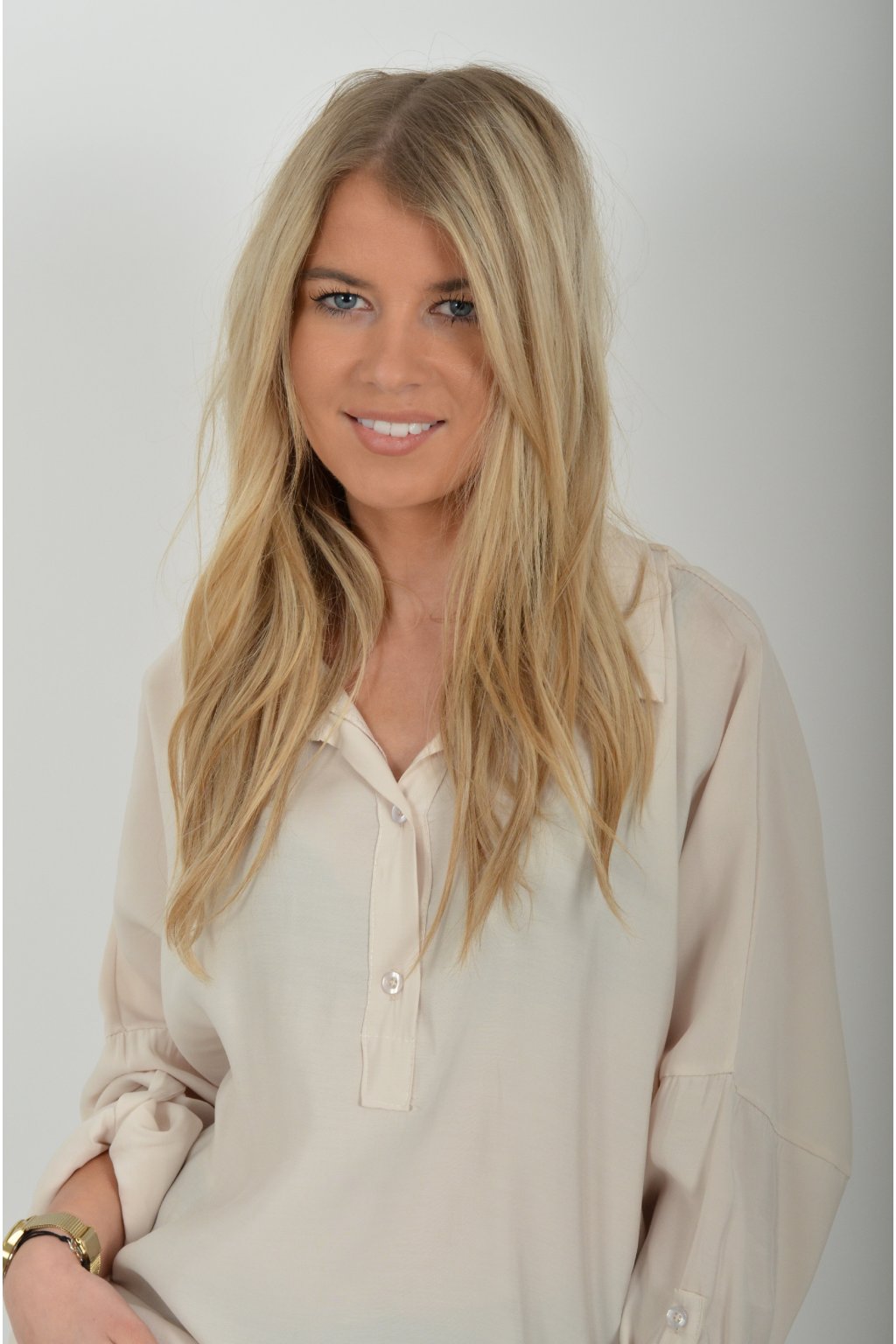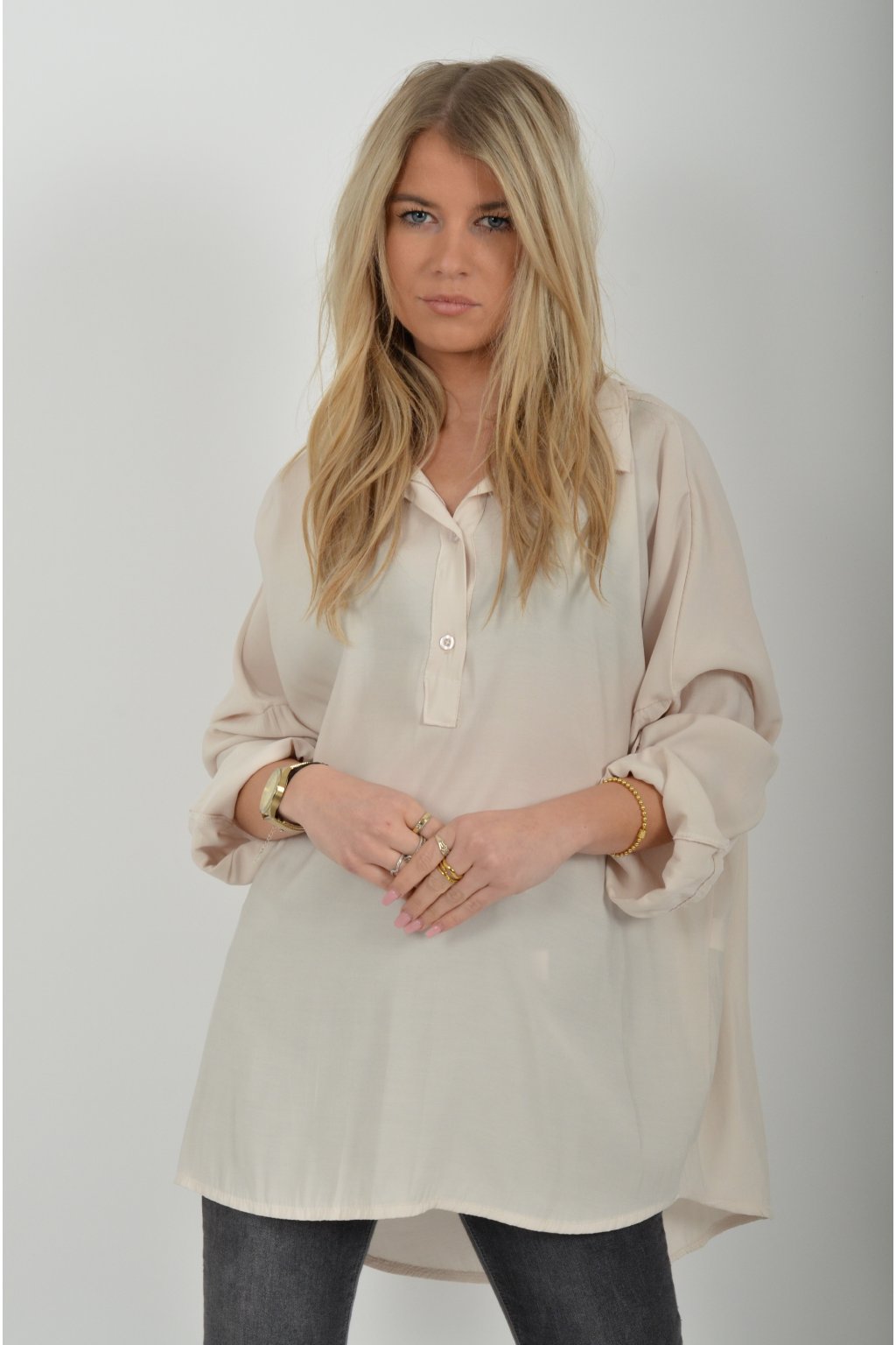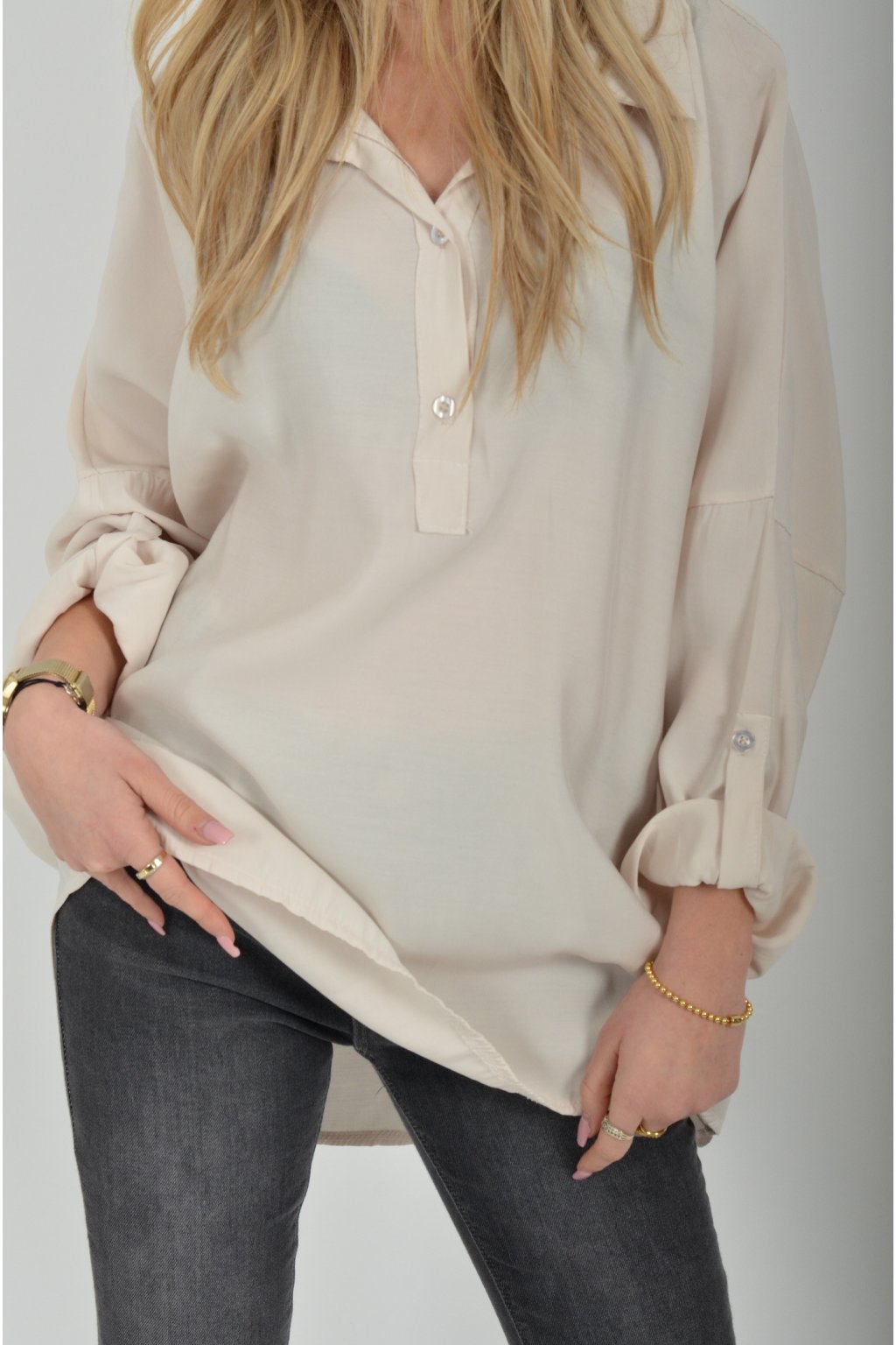 Halenka s 3/4 rukávem, který lze pomocí knoflíku jednoduše zkrátit. Je vyrobena z velice lehounkého, příjemného a jemného materiálu. Přední část halenky je kratší než zadní.