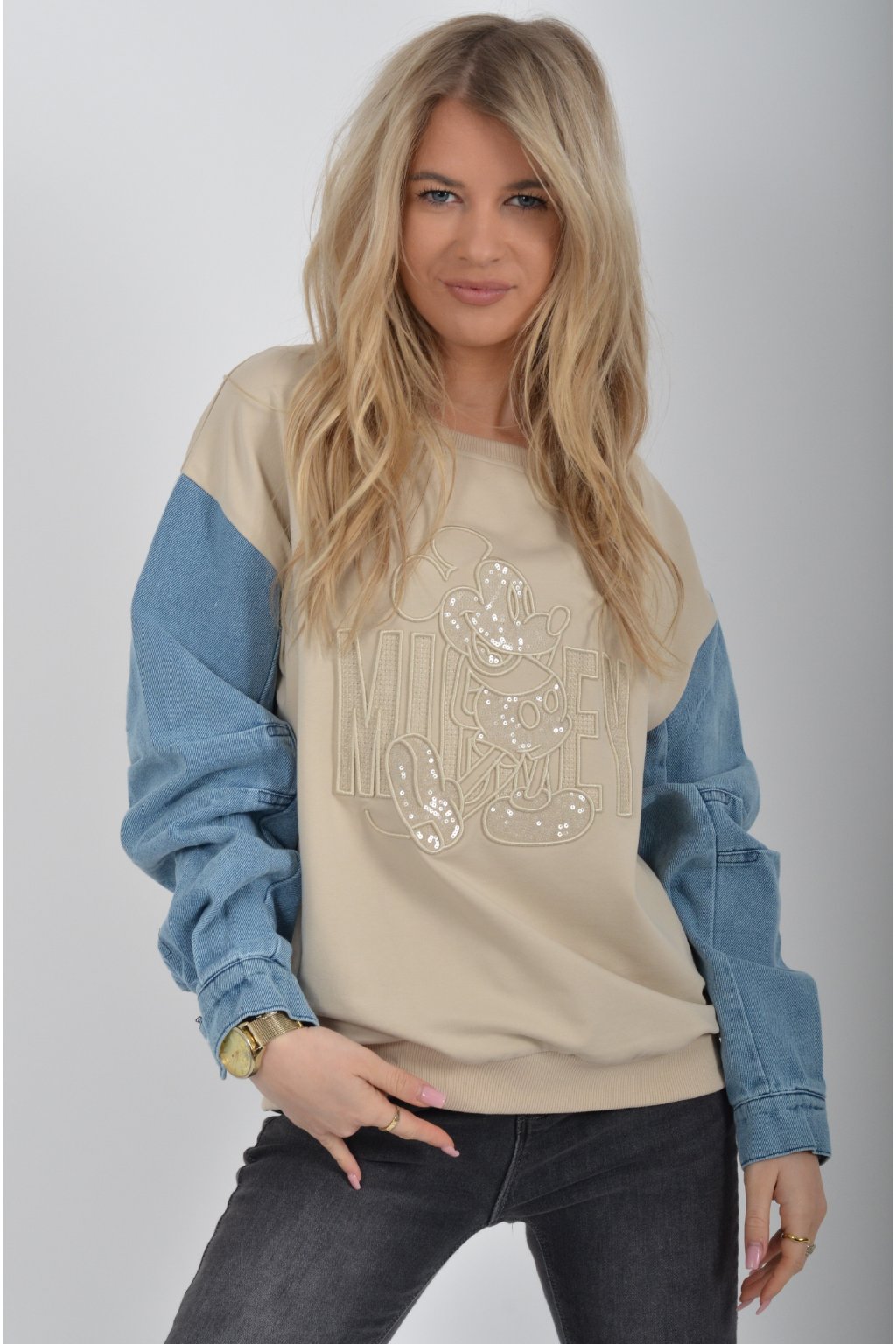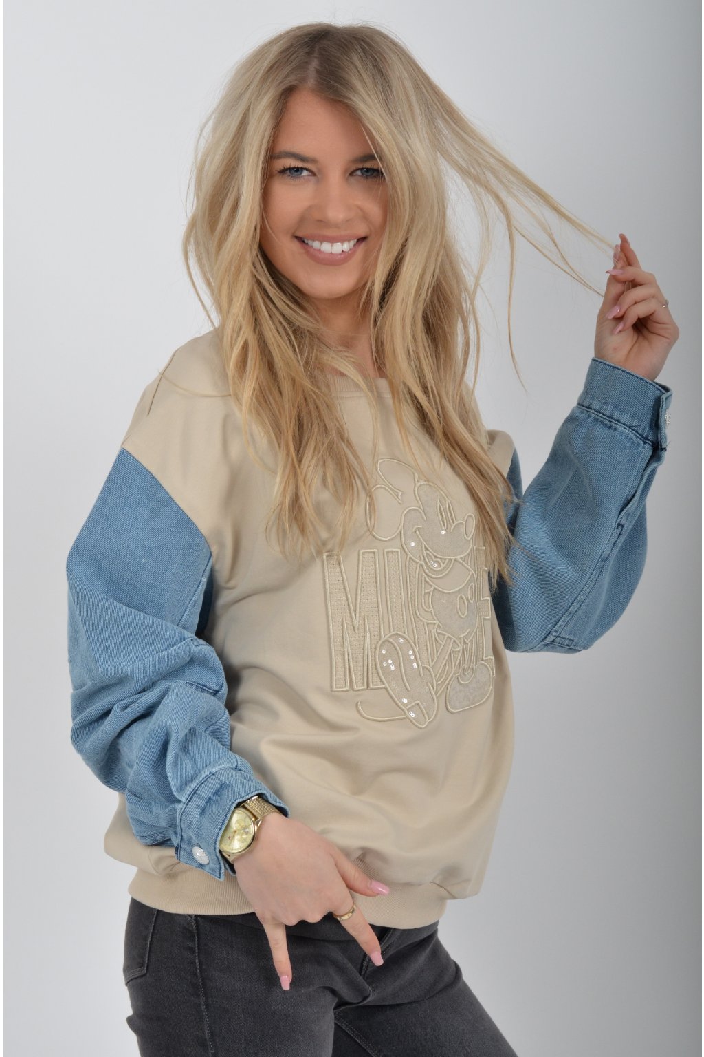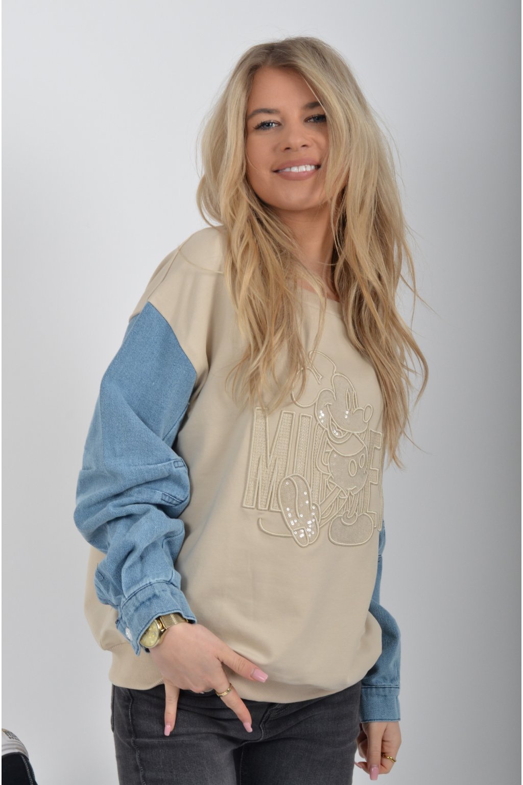 Mikina turecké značky Megi s dlouhým džínovým rukávem, a vyšívaným vzorem Mickey Mouse. Je ideální pro nošení do jarního počasí. Mikina je vyrobena z velice kvalitní turecké bavlny. Ve spodní části je do rantlu.