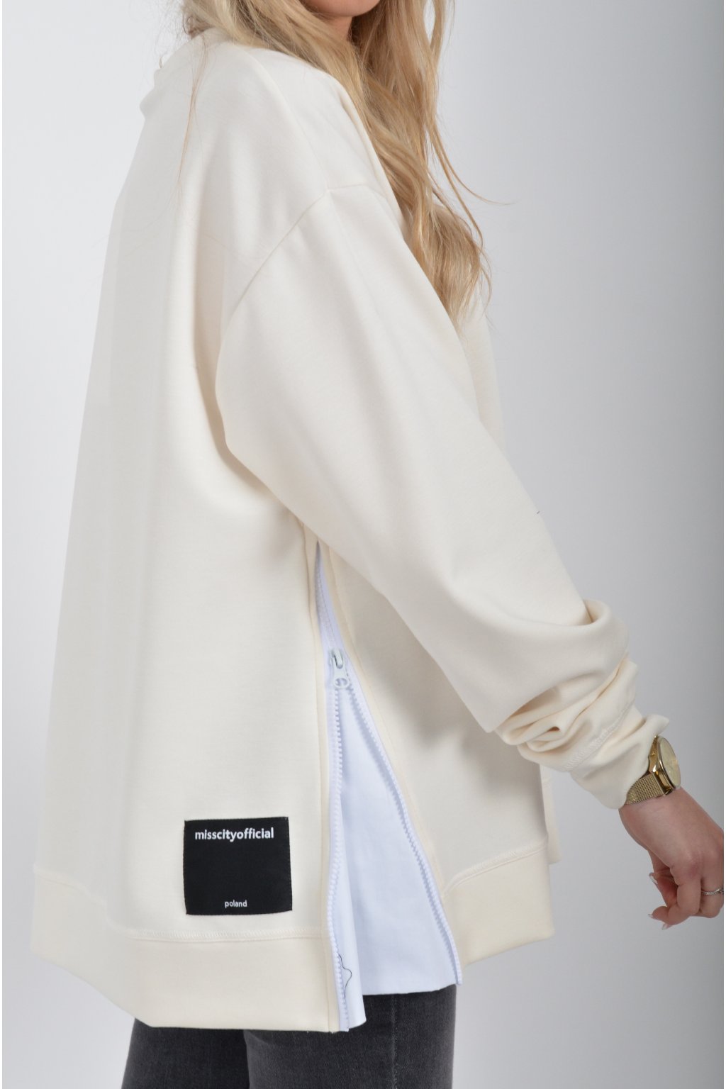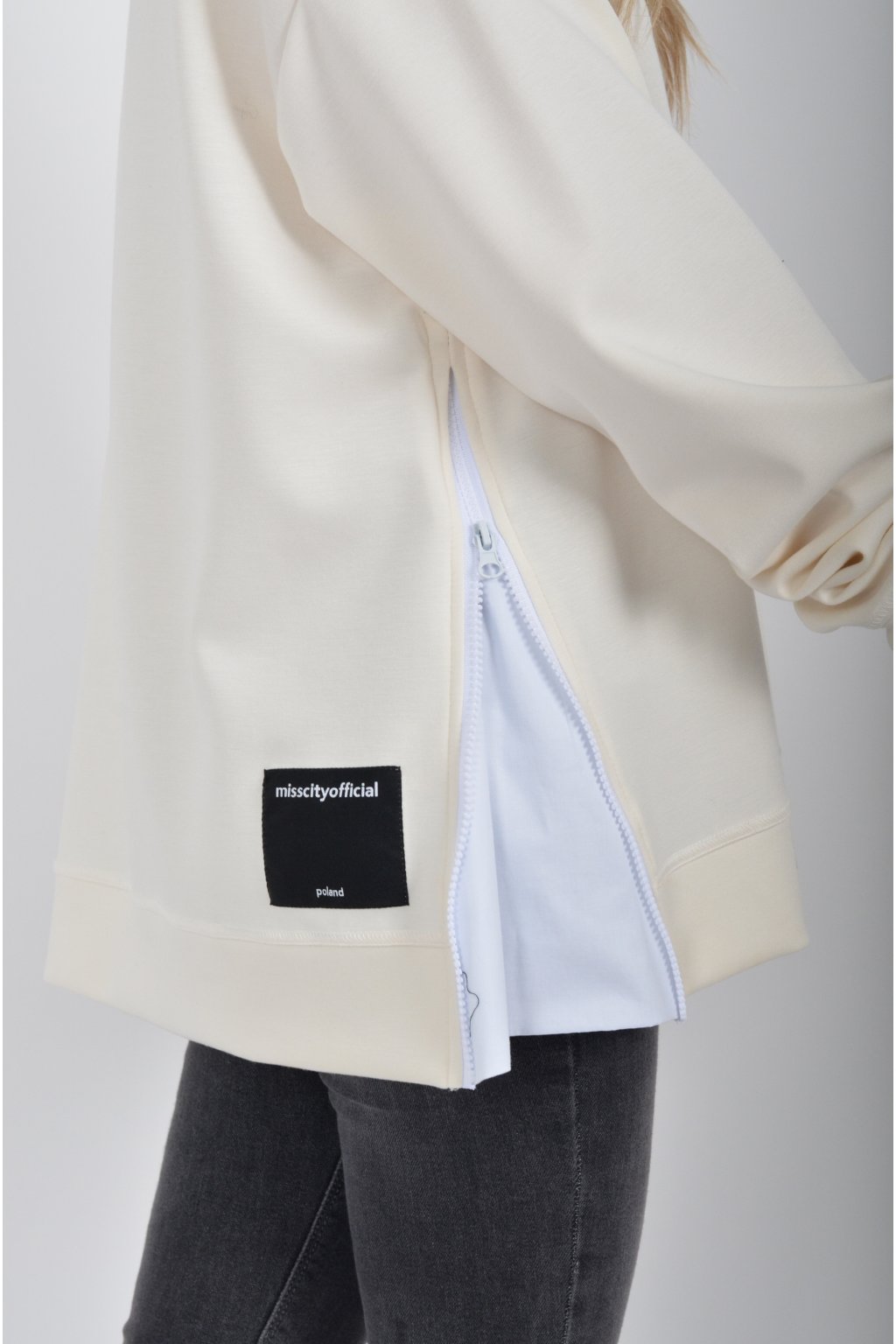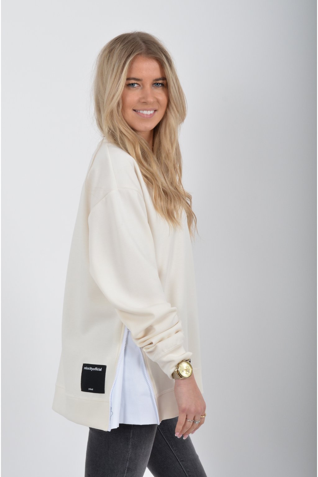 Mikina značky Miss City Official. Je vyrobena z velice příjemného materiálu. Na bocích má zipy, pomocí kterých lze udělat na halence rozparky.