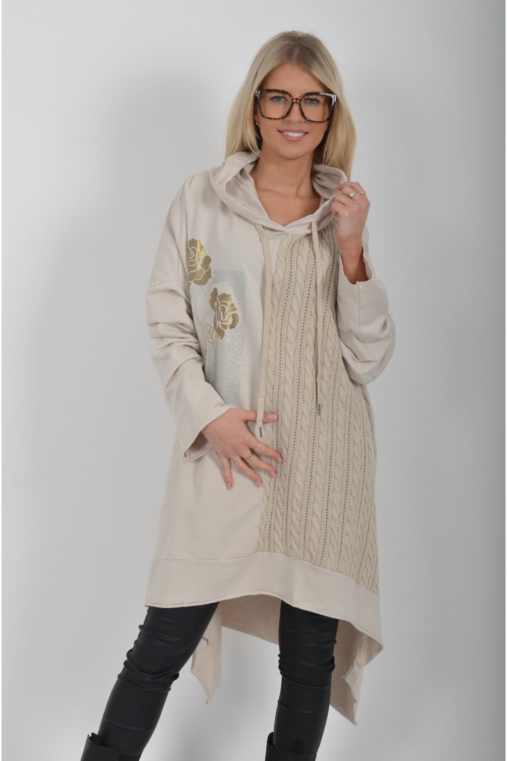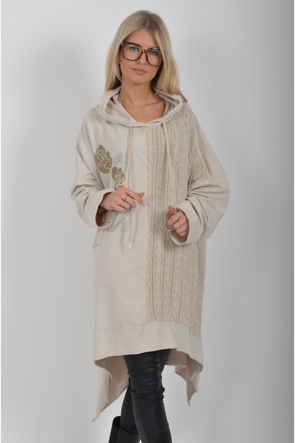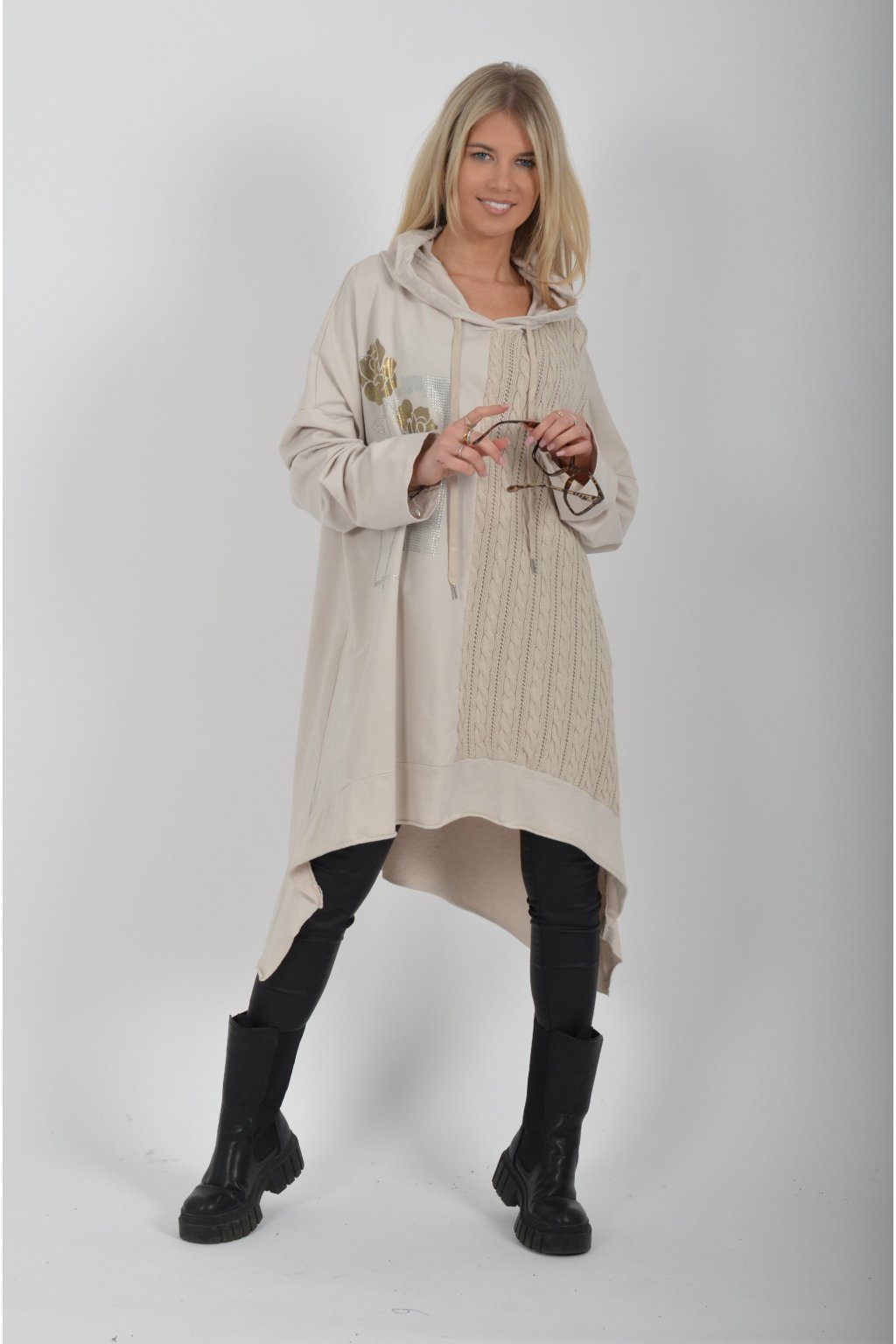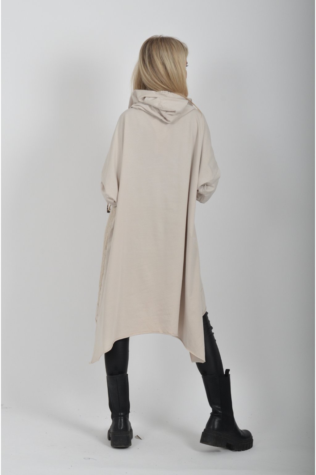 Volnější tunika áčkového střihu s materiálovou kombinací příjemné bavlny a pleteniny. Tunika má dlouhý rukáv a kapuci. Je vhodná jak k džínům, tak i legínám.