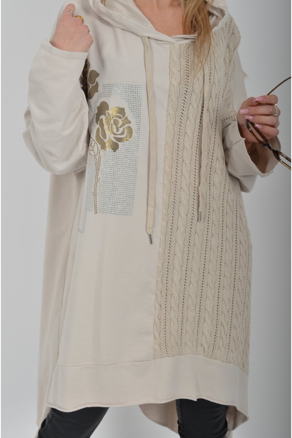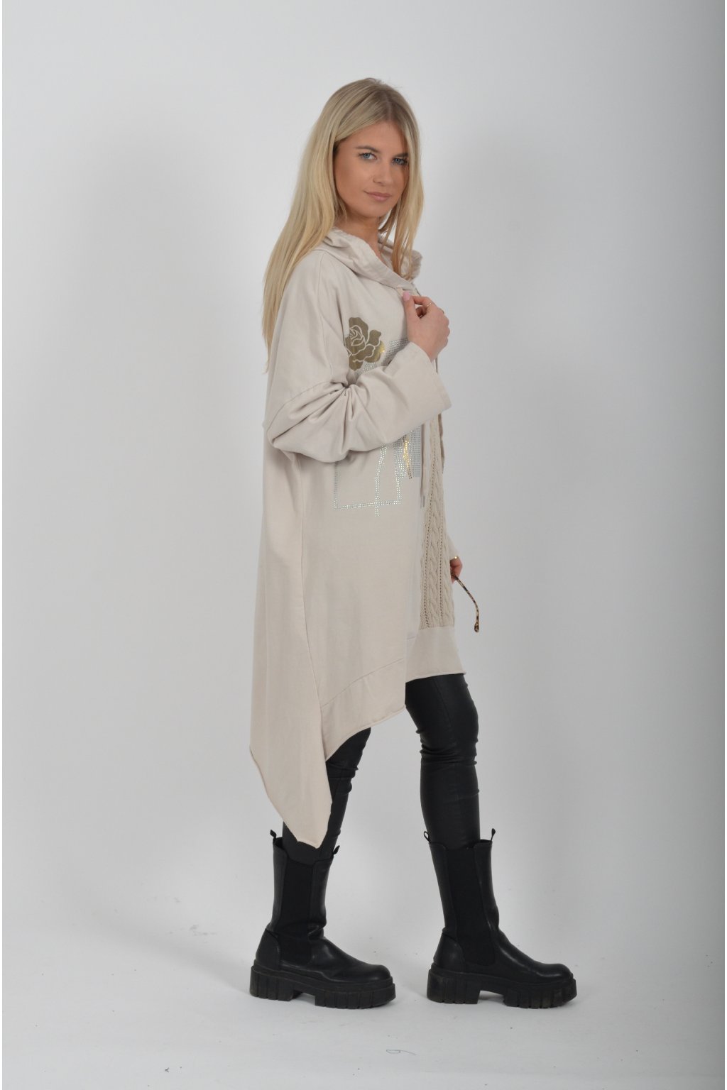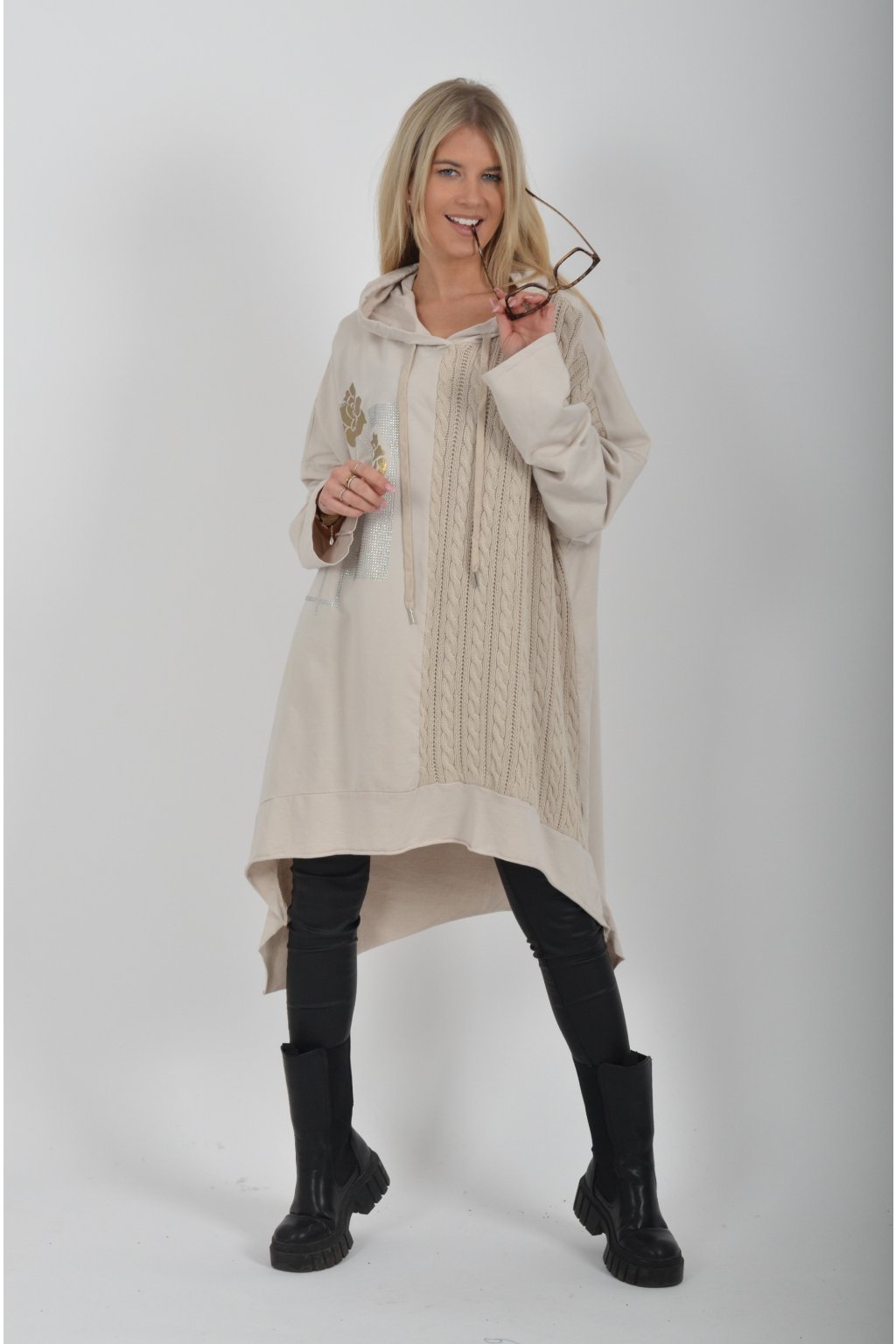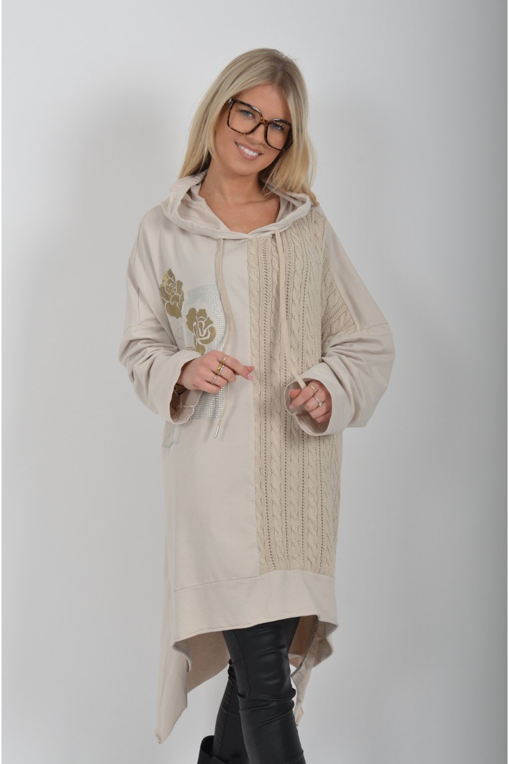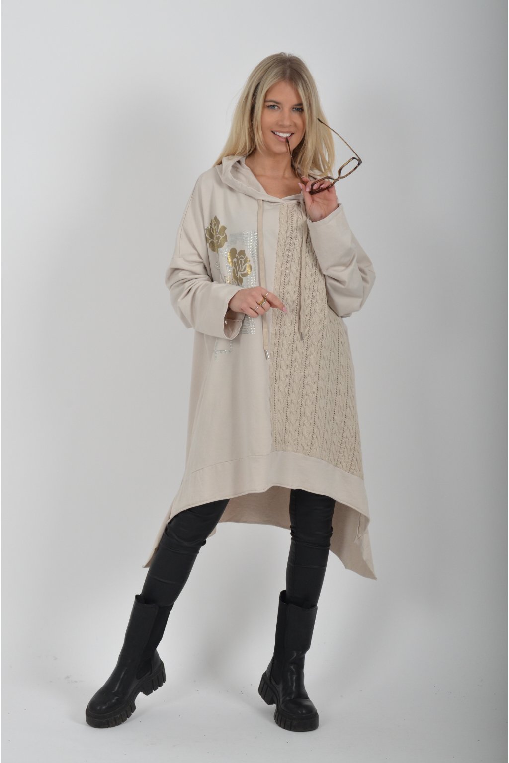 Volnější tunika áčkového střihu s materiálovou kombinací příjemné bavlny a pleteniny. Tunika má dlouhý rukáv a kapuci. Je vhodná jak k džínům, tak i legínám.