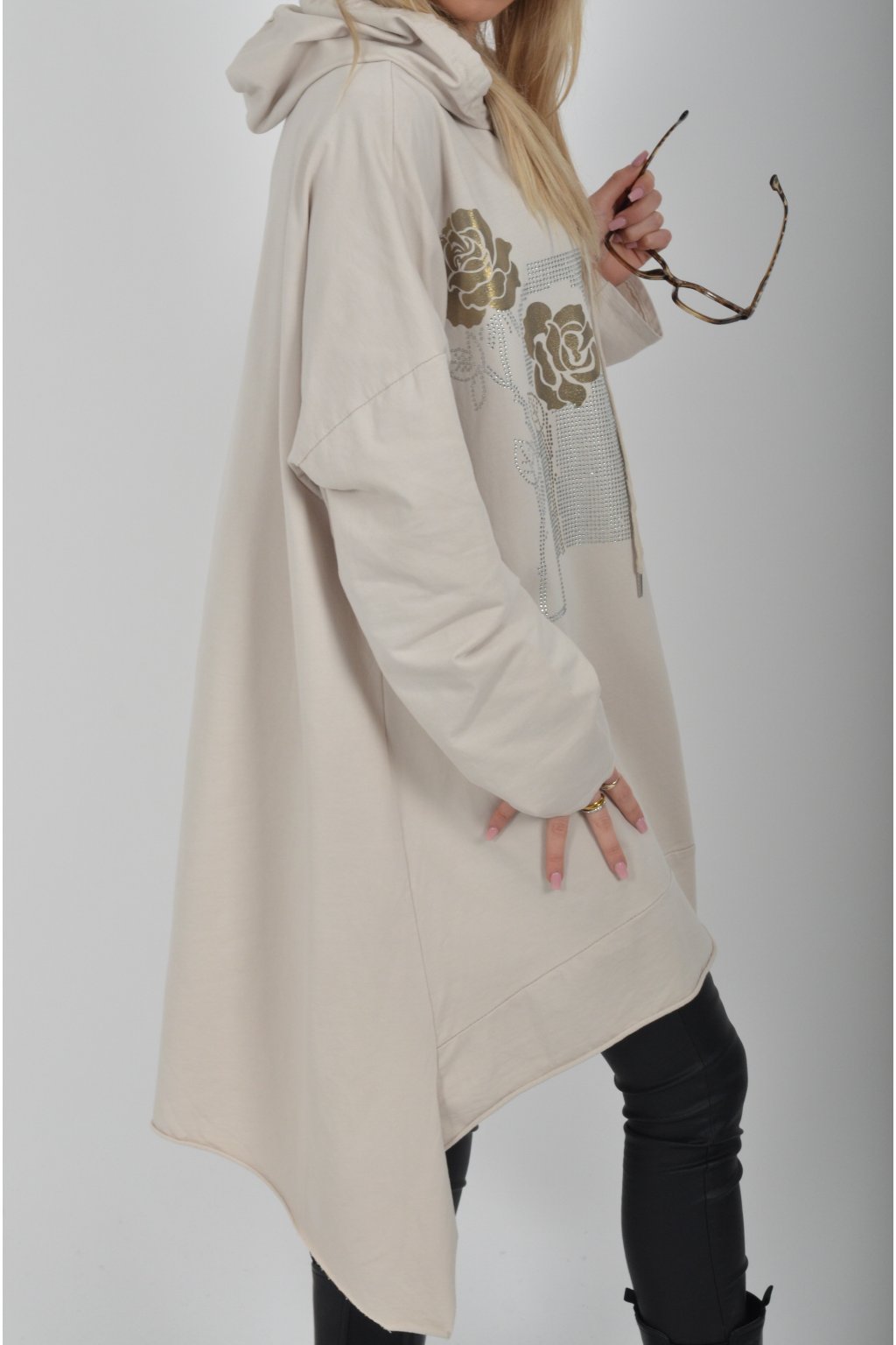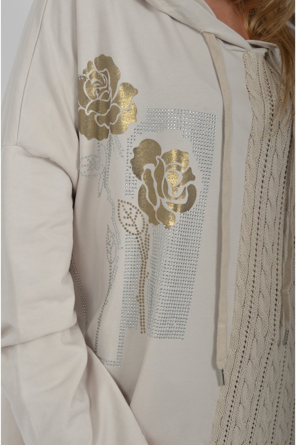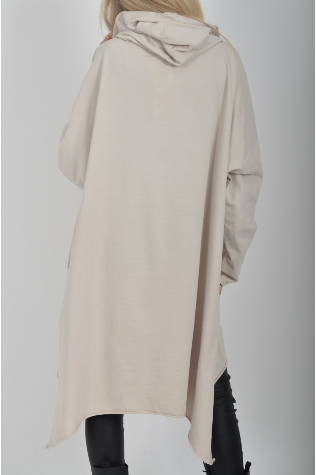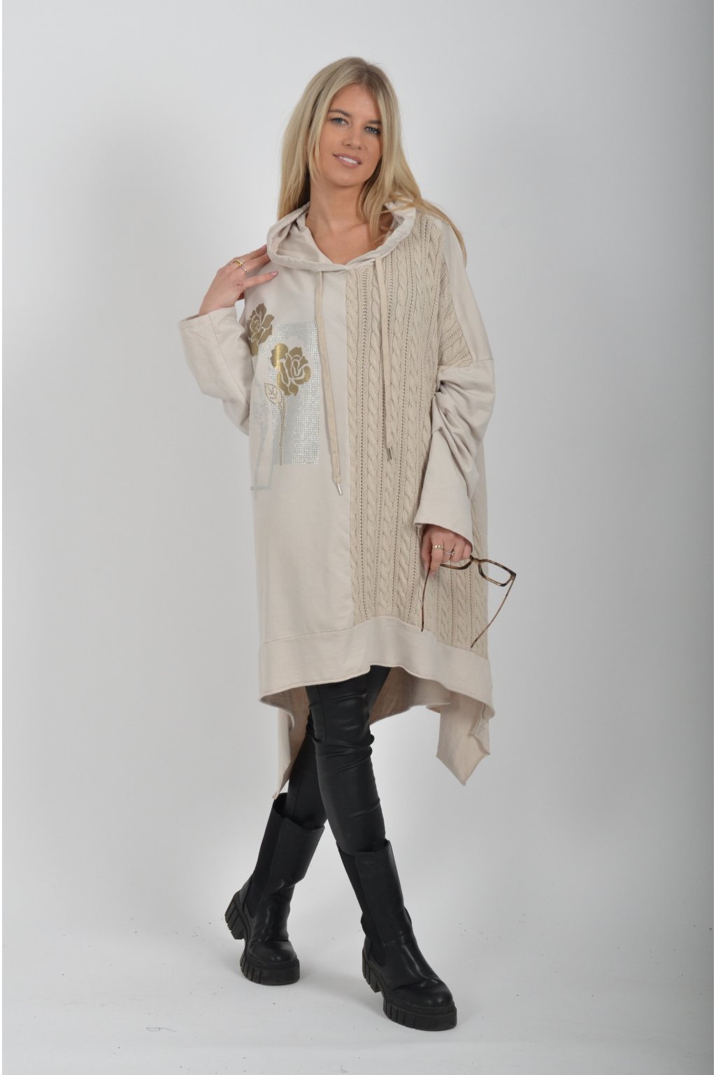 Volnější tunika áčkového střihu s materiálovou kombinací příjemné bavlny a pleteniny. Tunika má dlouhý rukáv a kapuci. Je vhodná jak k džínům, tak i legínám.