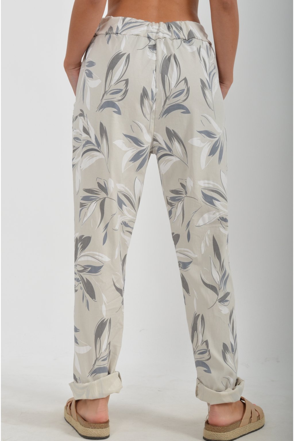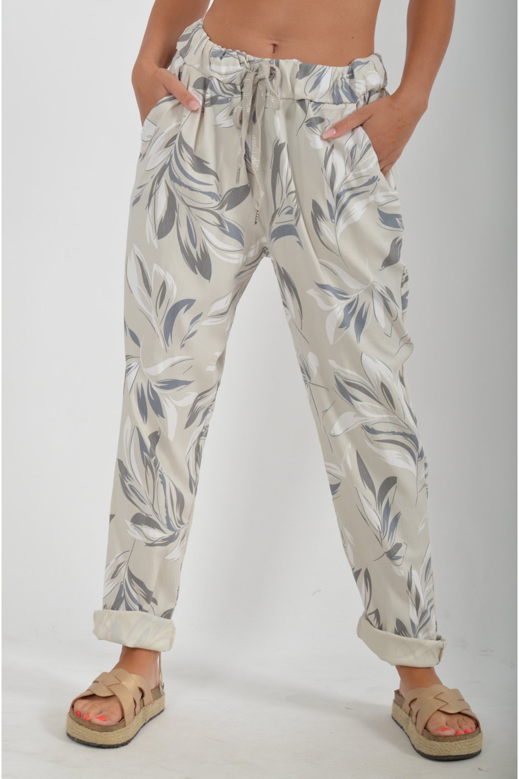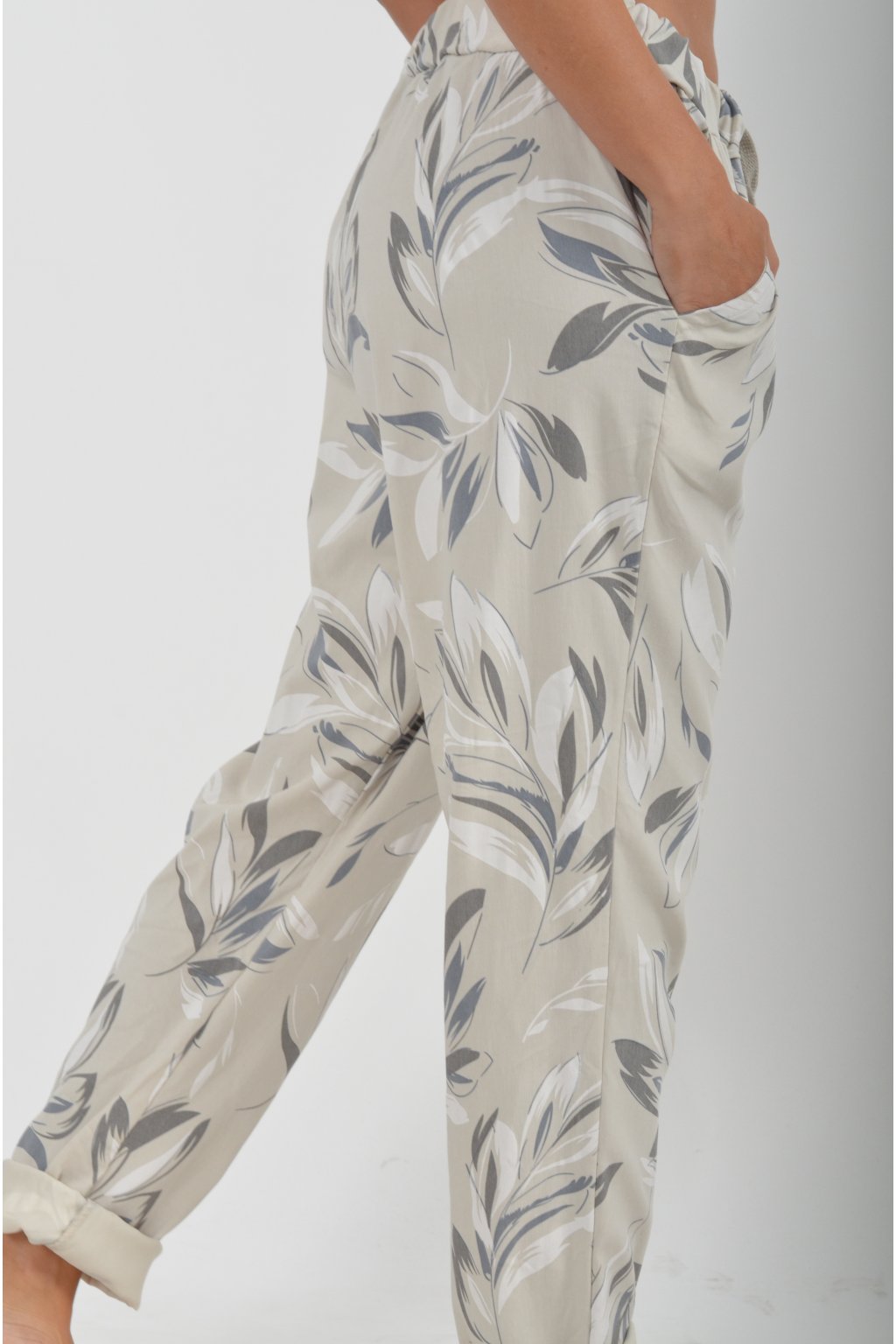 Vzorované kalhoty s kapsami na bocích, které se krásně přizpůsobí postavě, díky podílu elastanu. Jsou vhodné pro každodenní nošení. V pase je zapracovaná guma a tkanička pro libovolné stažení.