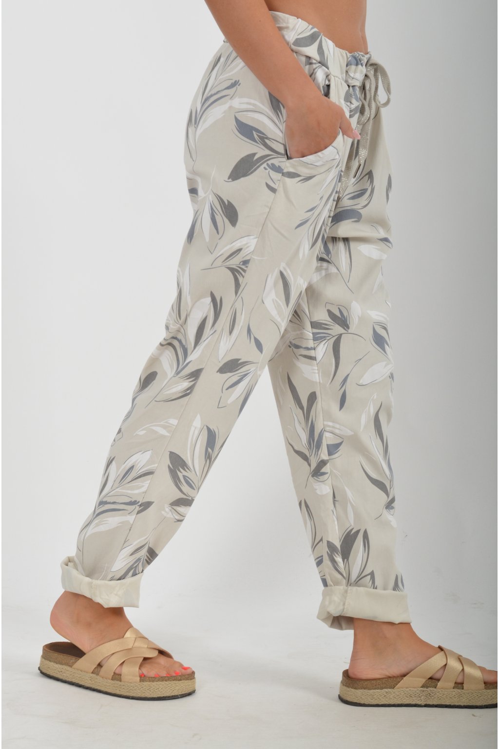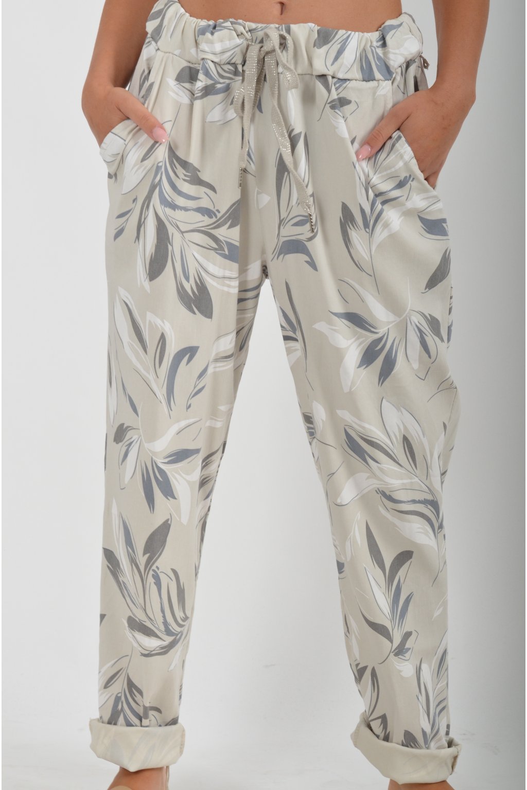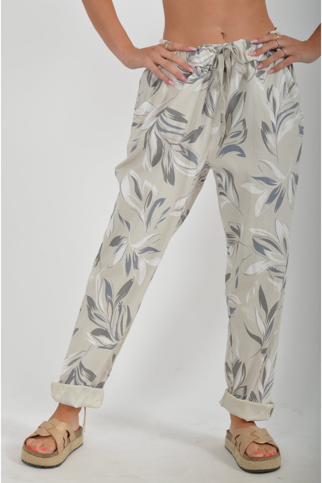 Vzorované kalhoty s kapsami na bocích, které se krásně přizpůsobí postavě, díky podílu elastanu. Jsou vhodné pro každodenní nošení. V pase je zapracovaná guma a tkanička pro libovolné stažení.