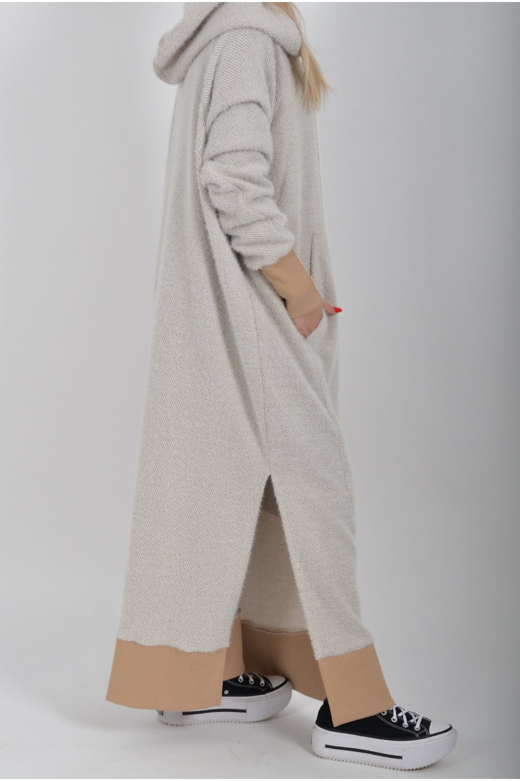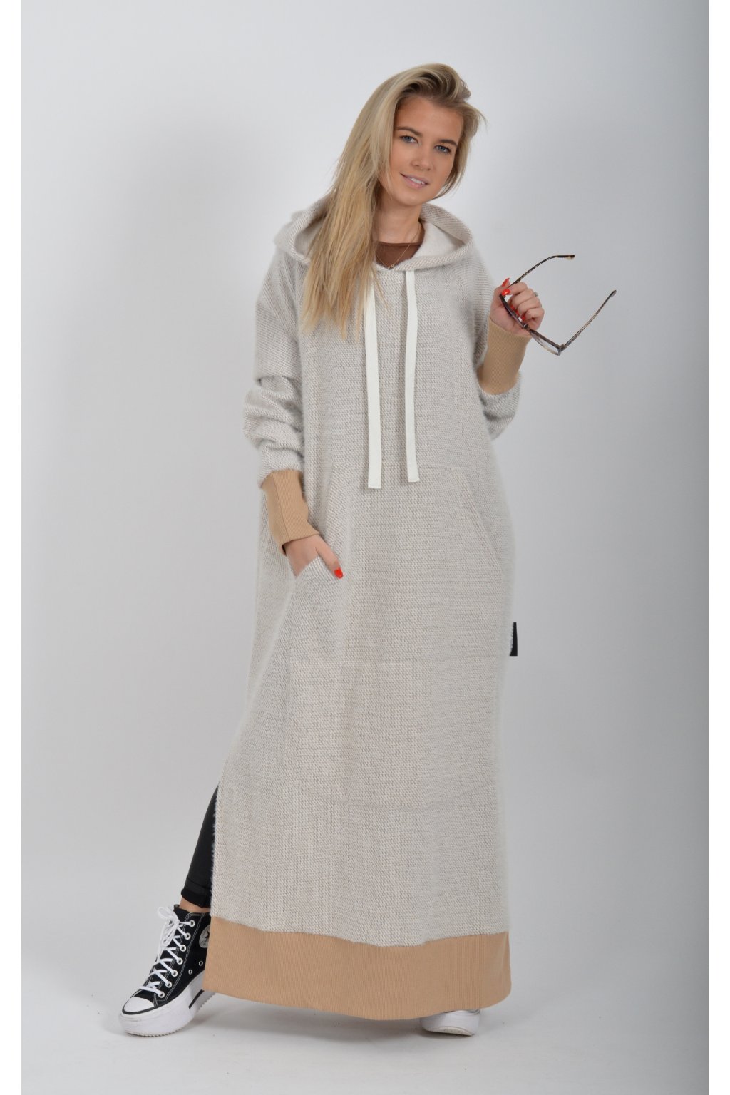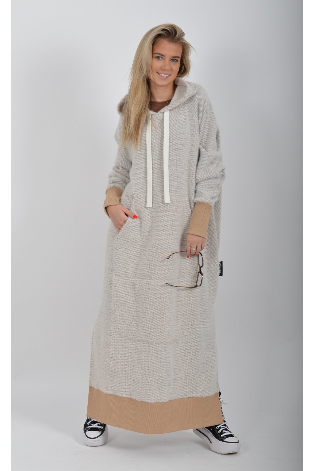 Mikinové dlouhé šaty značky Miss City Official. Šaty mají rovný střih, rozparky, dlouhý rukáv a kapuci. V přední části je našitá klokaní kapsa. Jsou vyrobené z velice příjemného, kvalitního a lehce zatepleného materiálu.