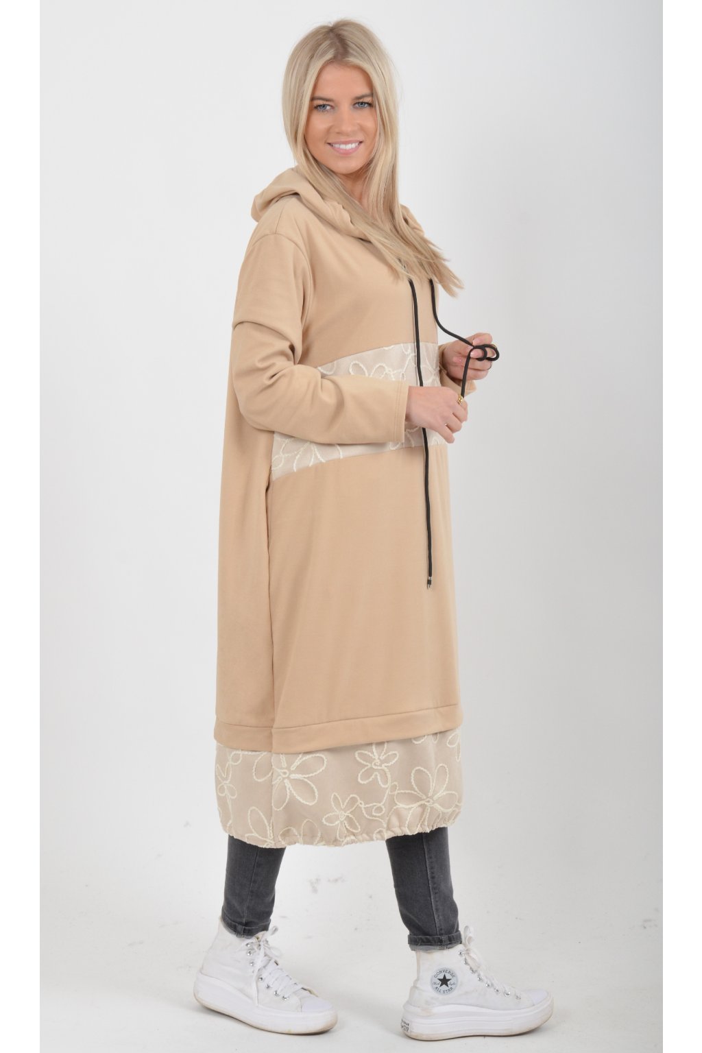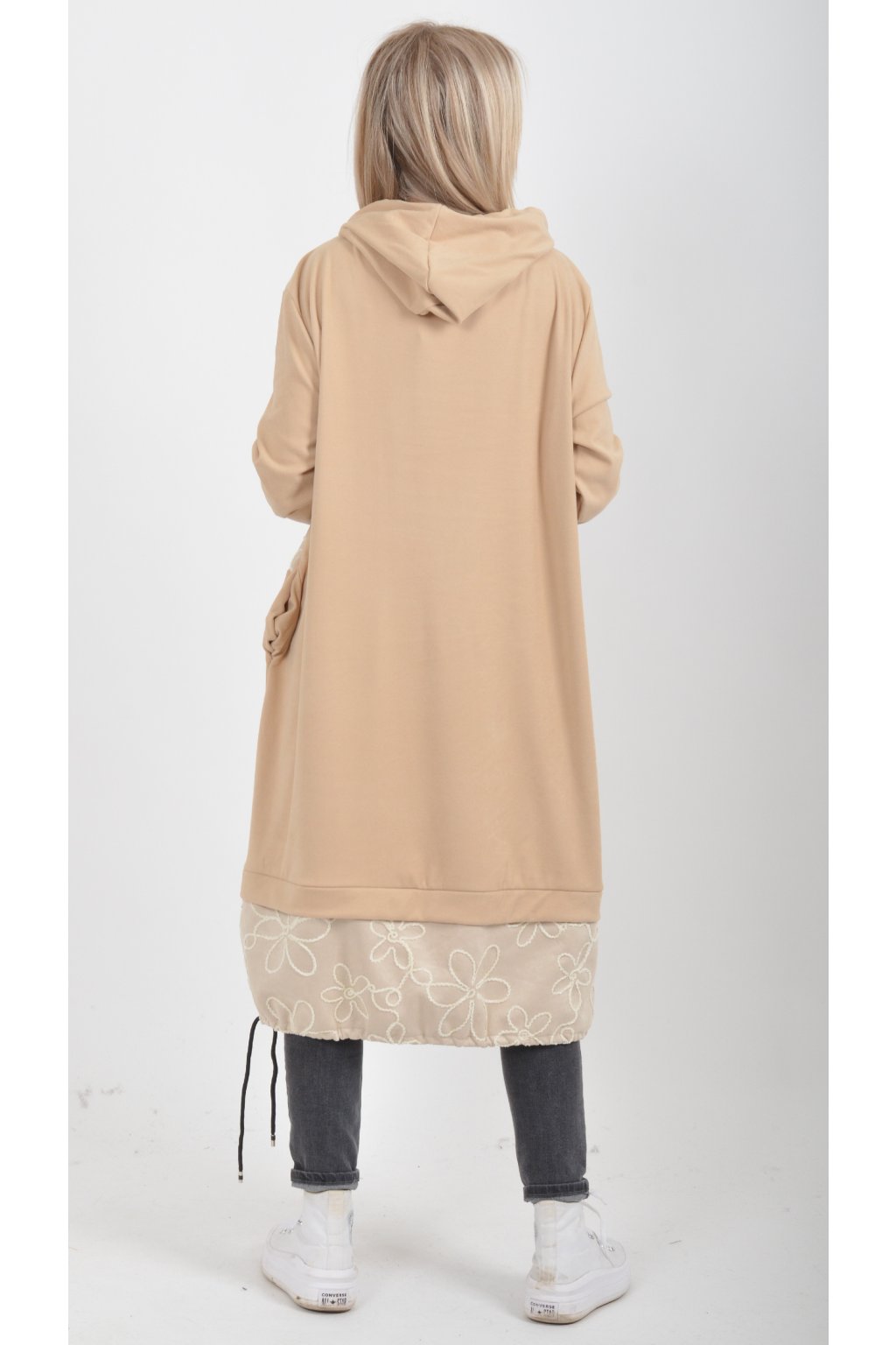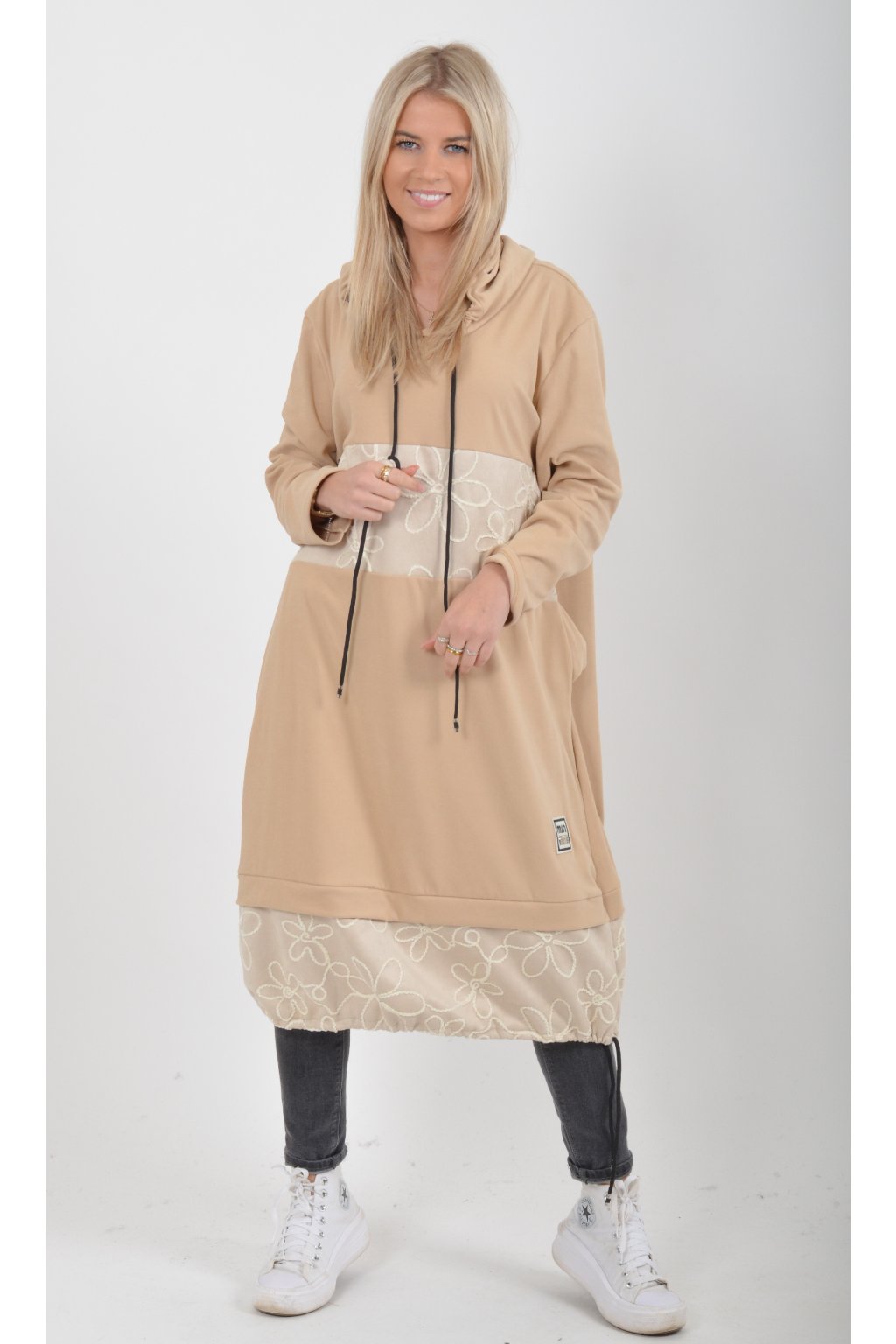 Mikinové šaty s kapucí zdobené vyšívanými kytkami. Mají áčkový střih, dlouhý rukáv a na bocích kapsy. Ve spodní části mají zapracovanou tkaničku pro libovolné stažení. Jsou vyrobené z velice příjemného a lehce zatepleného materiálu.