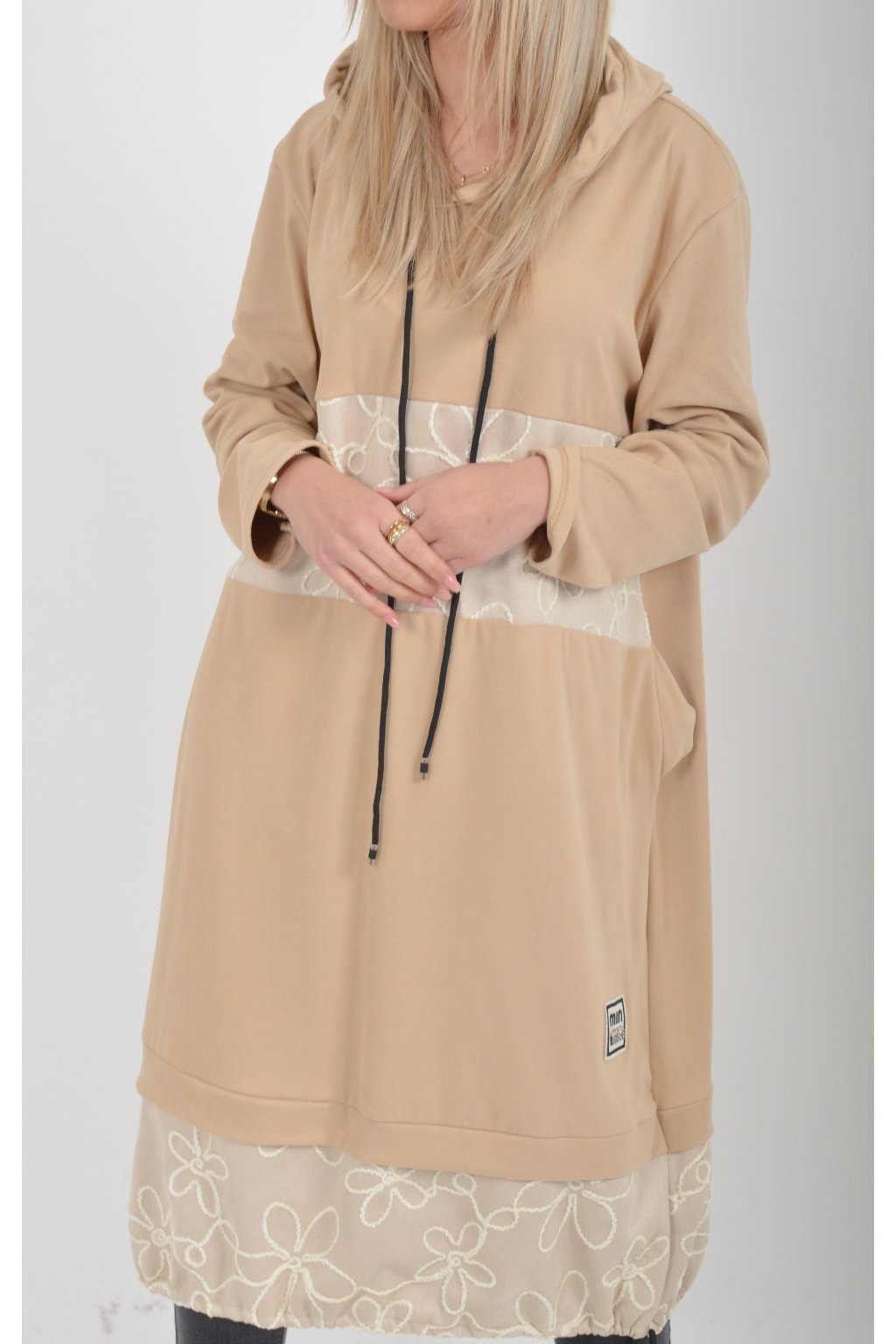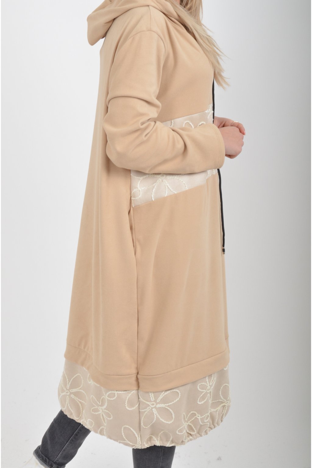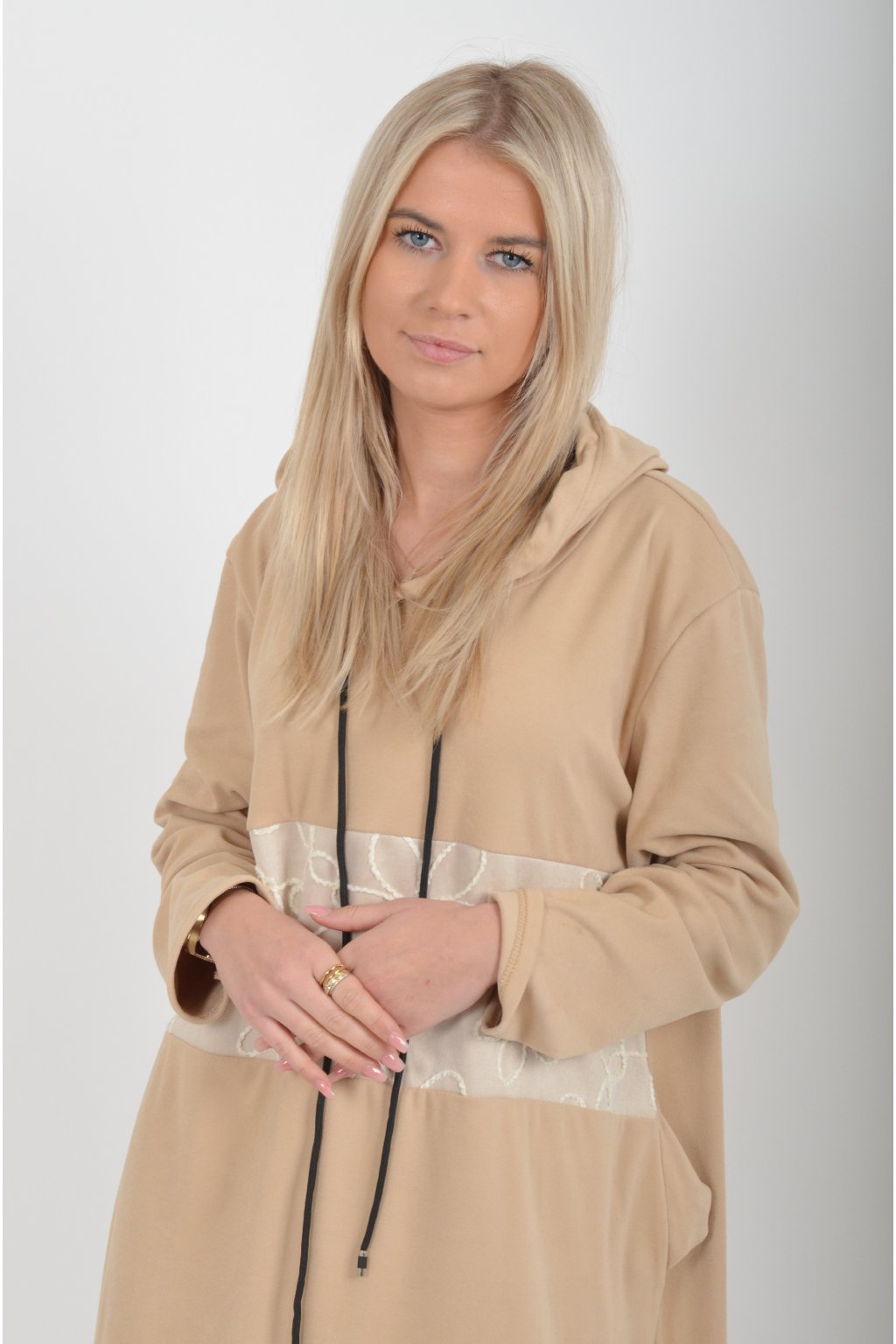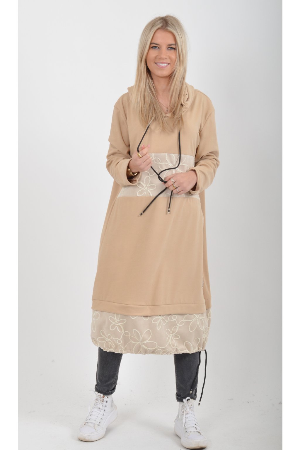 Mikinové šaty s kapucí zdobené vyšívanými kytkami. Mají áčkový střih, dlouhý rukáv a na bocích kapsy. Ve spodní části mají zapracovanou tkaničku pro libovolné stažení. Jsou vyrobené z velice příjemného a lehce zatepleného materiálu.