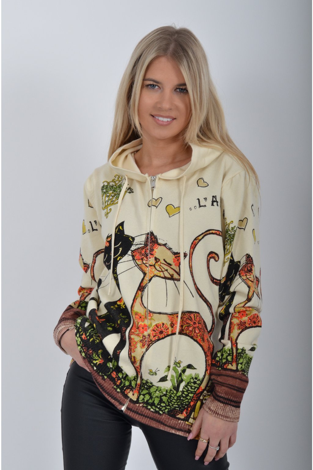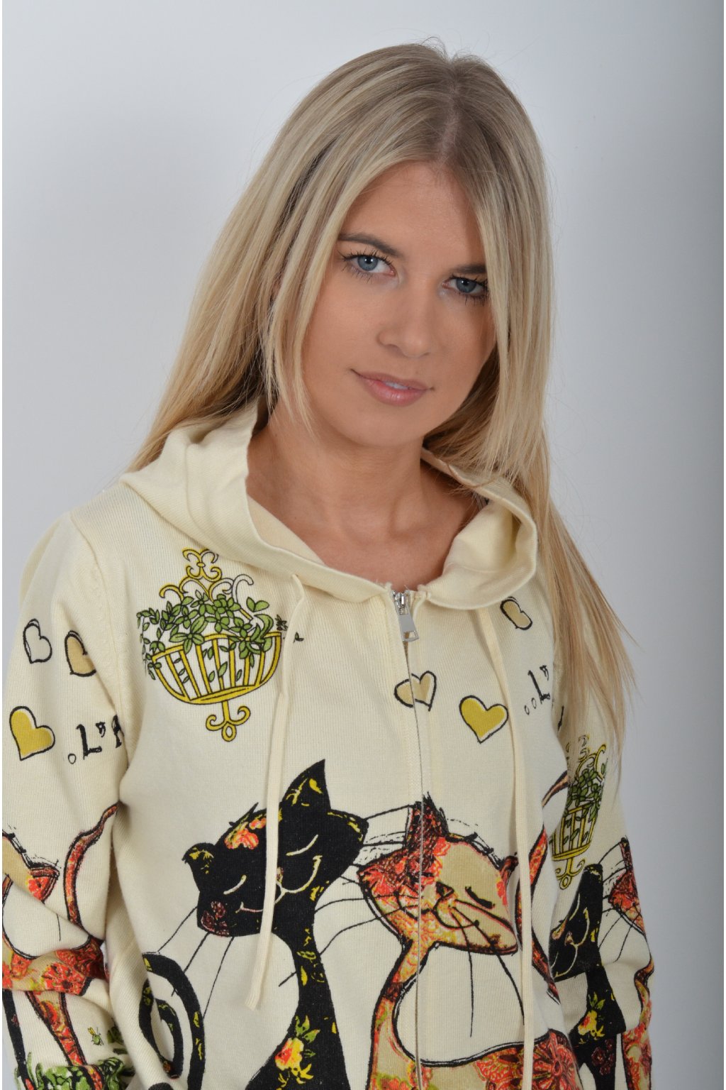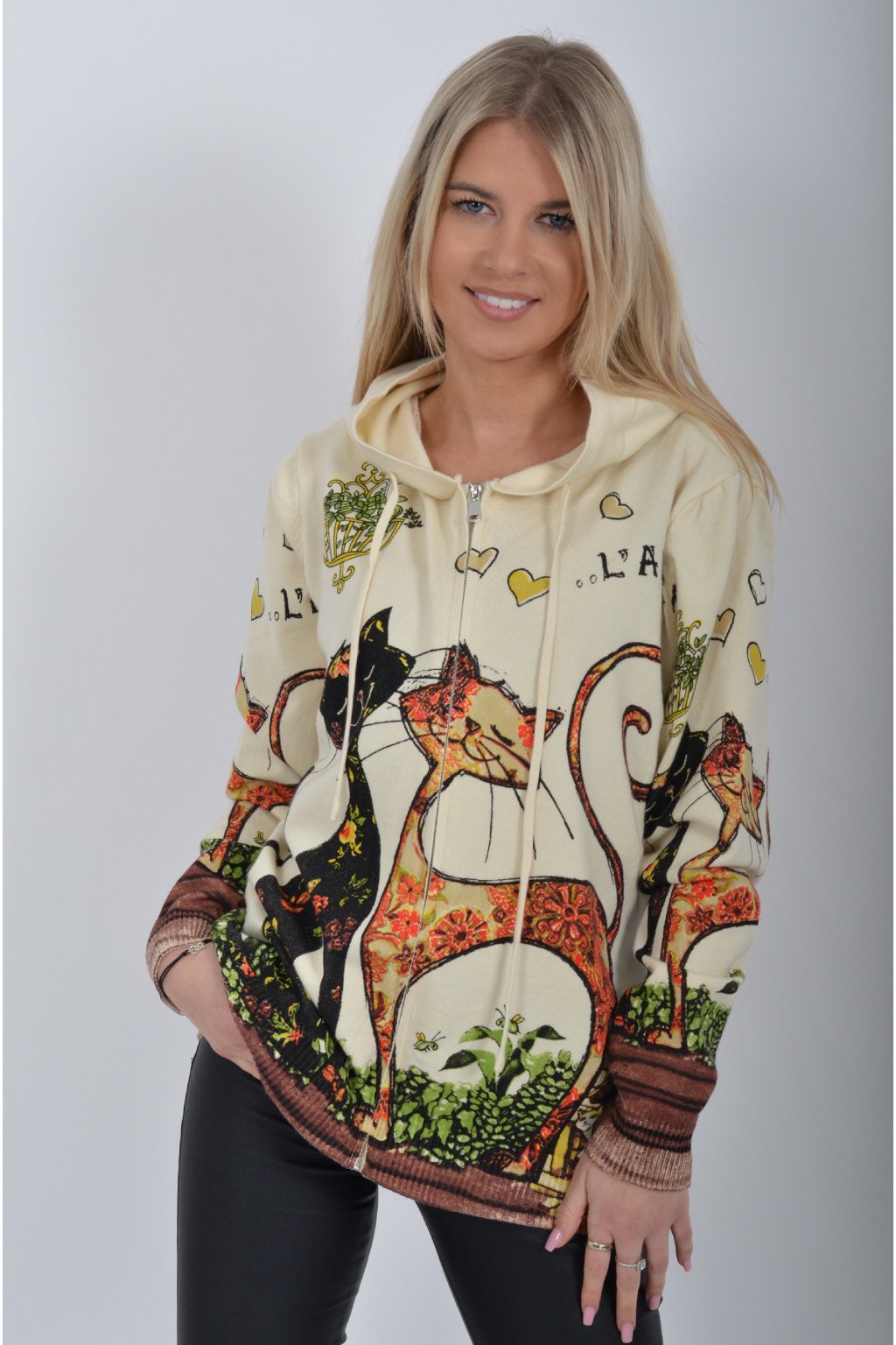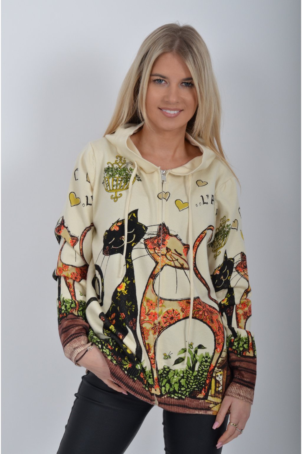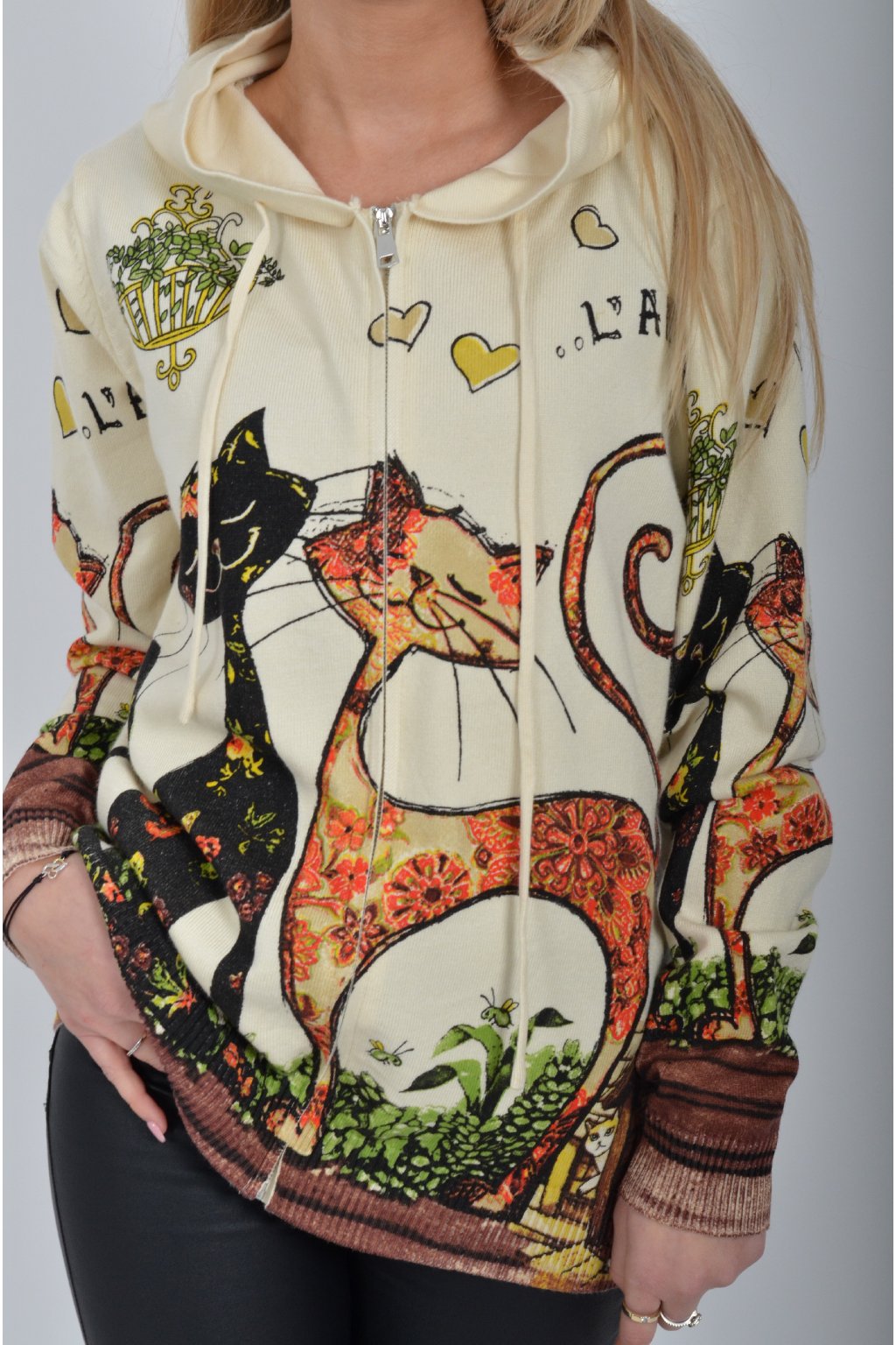 Svetr se zapínáním na zip a kapucí vyrobený z velice příjemného a heboučkého materiálu. Má krásný kočičí vzor. Materiál je průžný.
