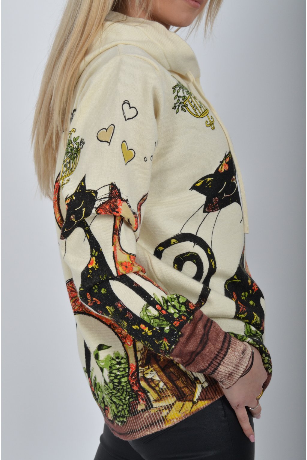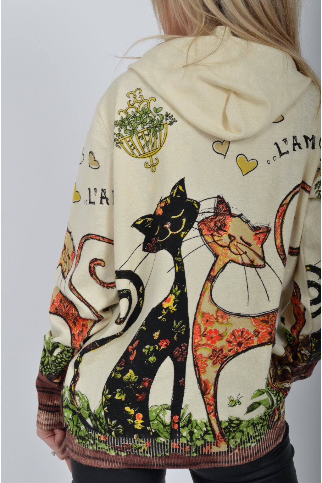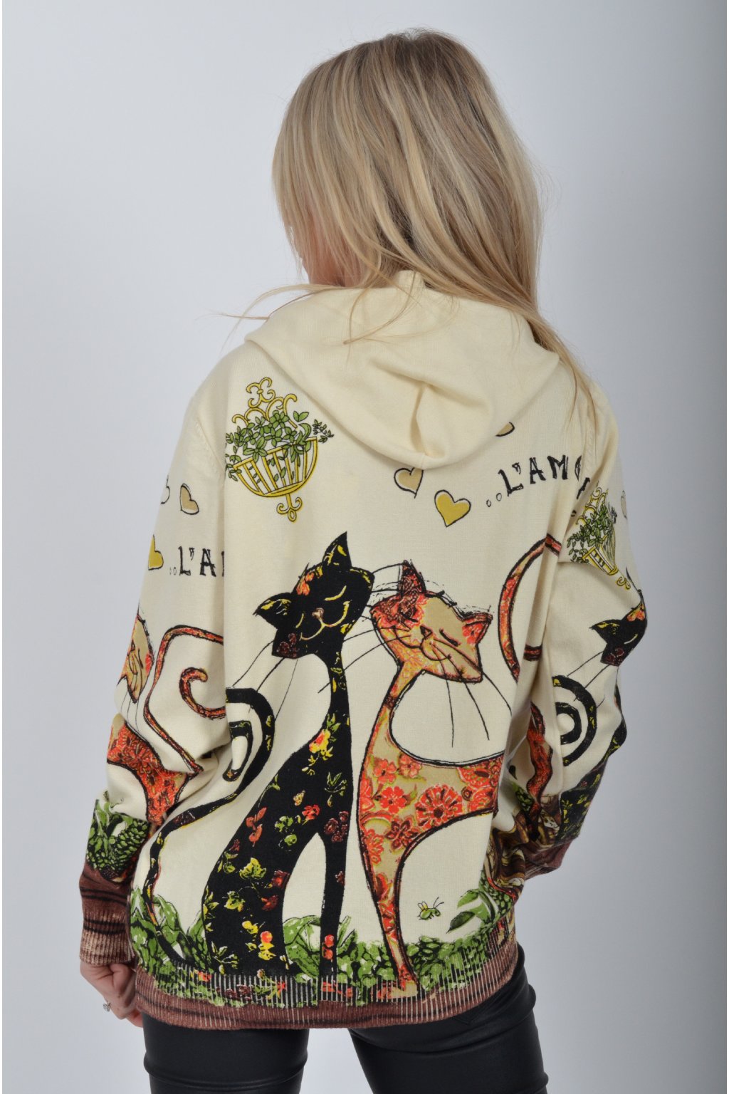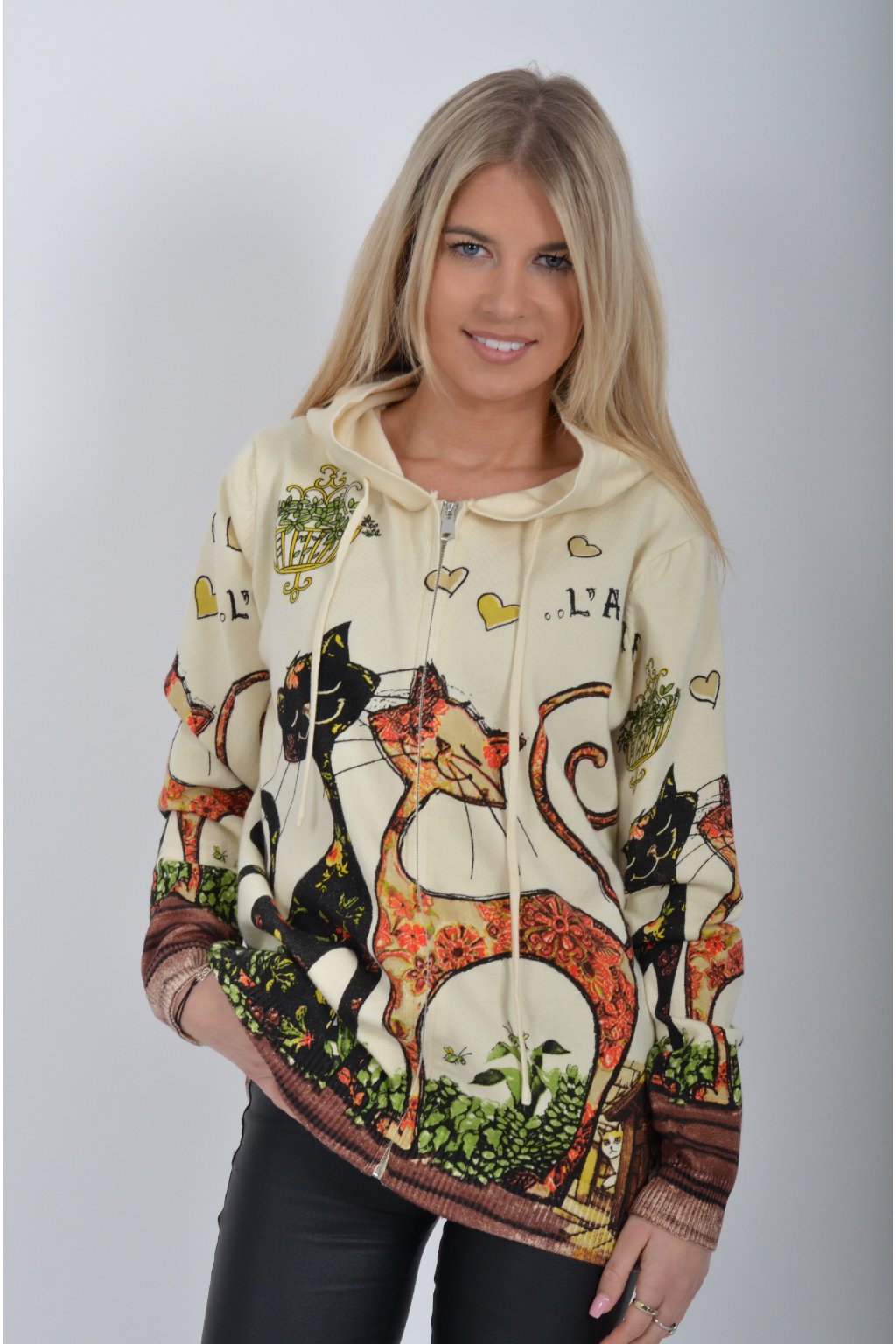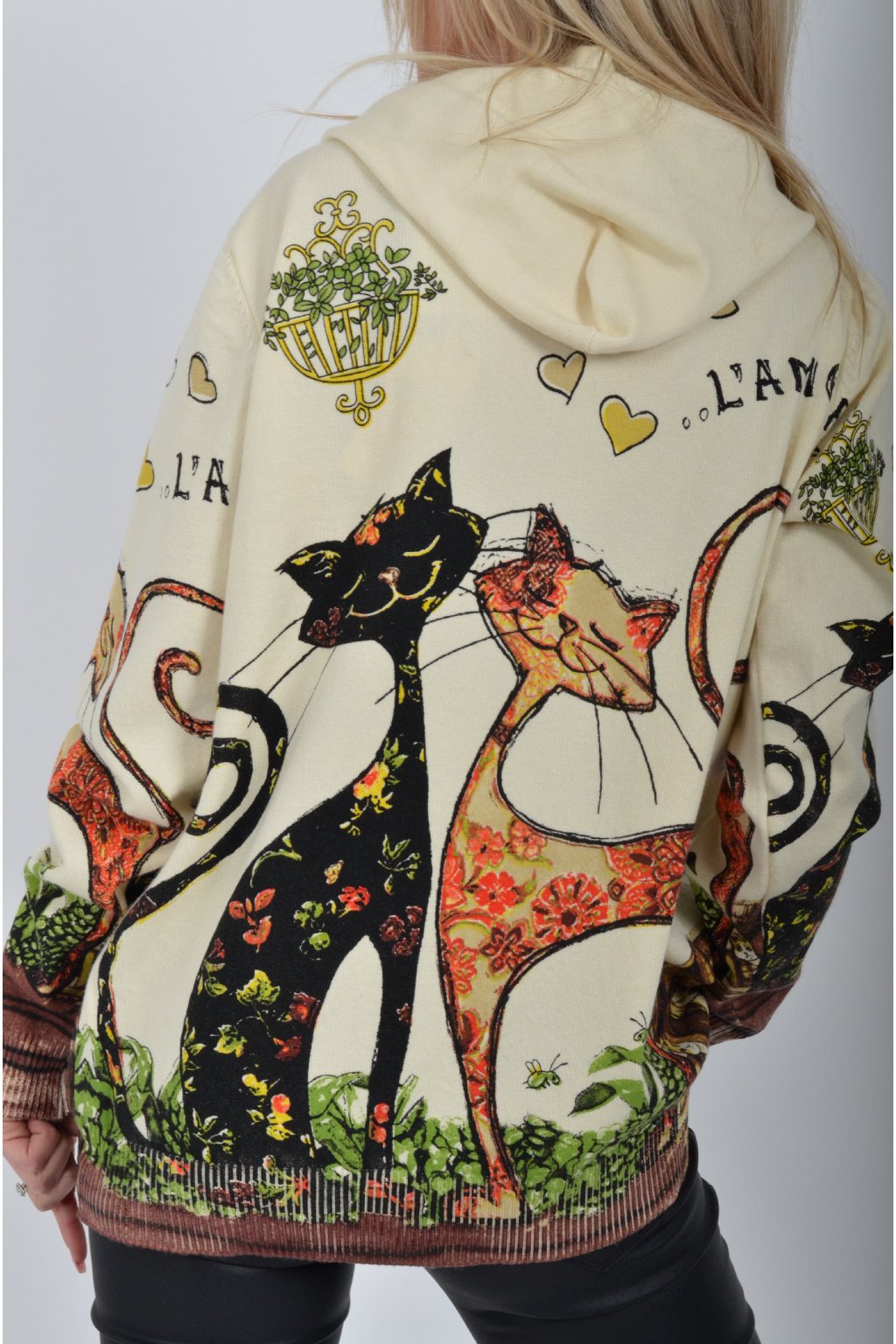 Svetr se zapínáním na zip a kapucí vyrobený z velice příjemného a heboučkého materiálu. Má krásný kočičí vzor. Materiál je průžný.