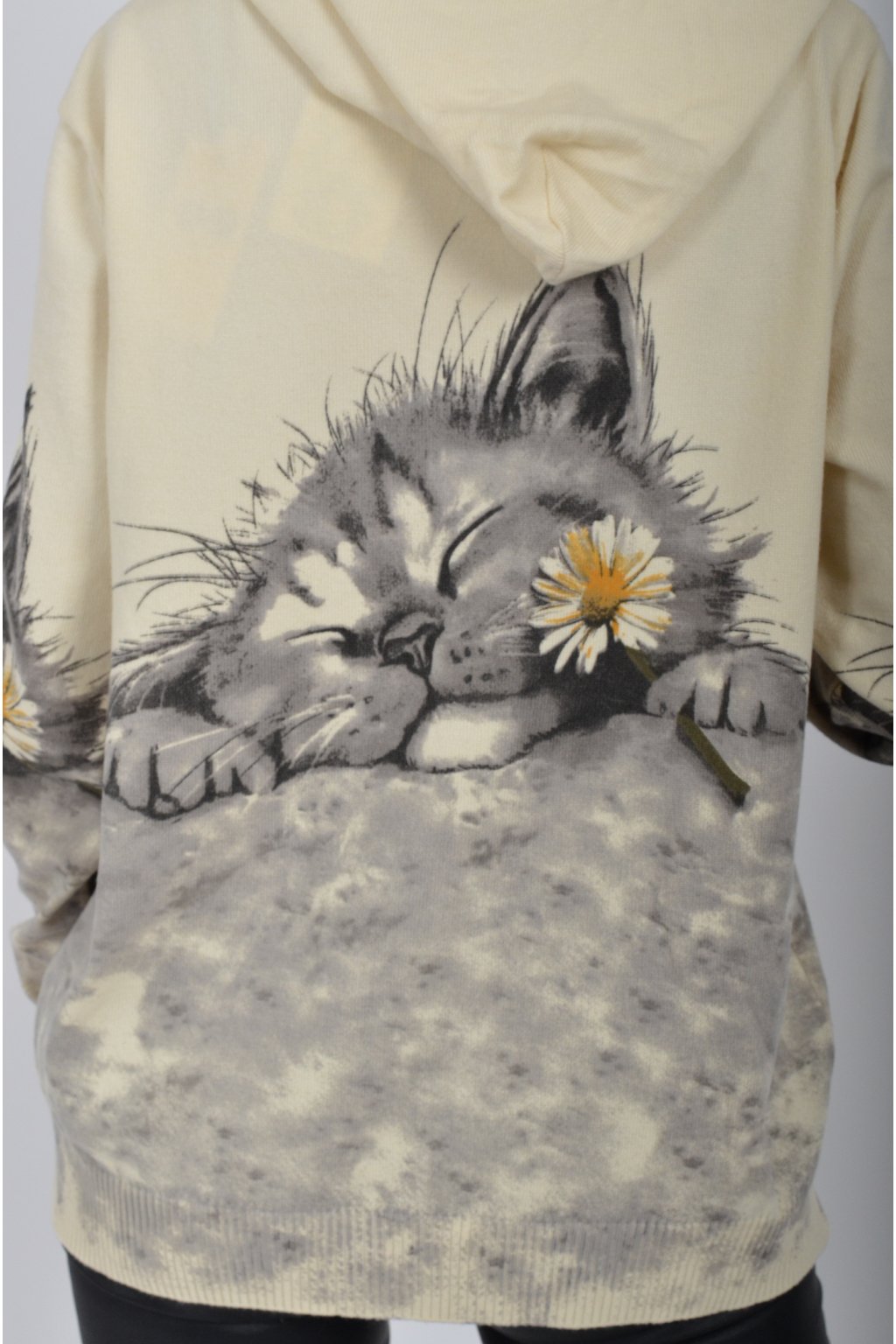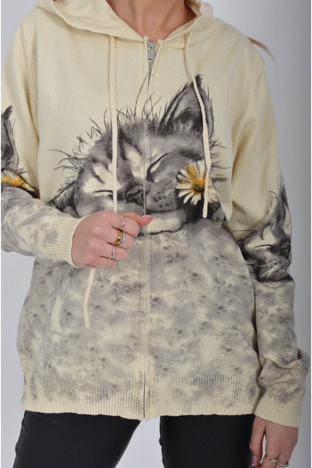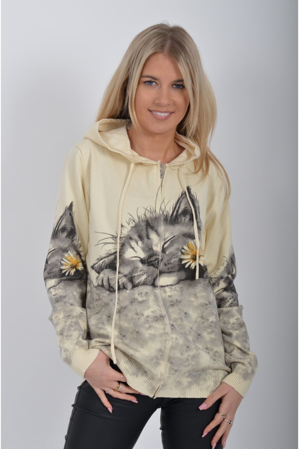 Svetr se zapínáním na zip a kapucí vyrobený z velice příjemného a heboučkého materiálu. Má krásný kočičí vzor. Materiál je průžný.