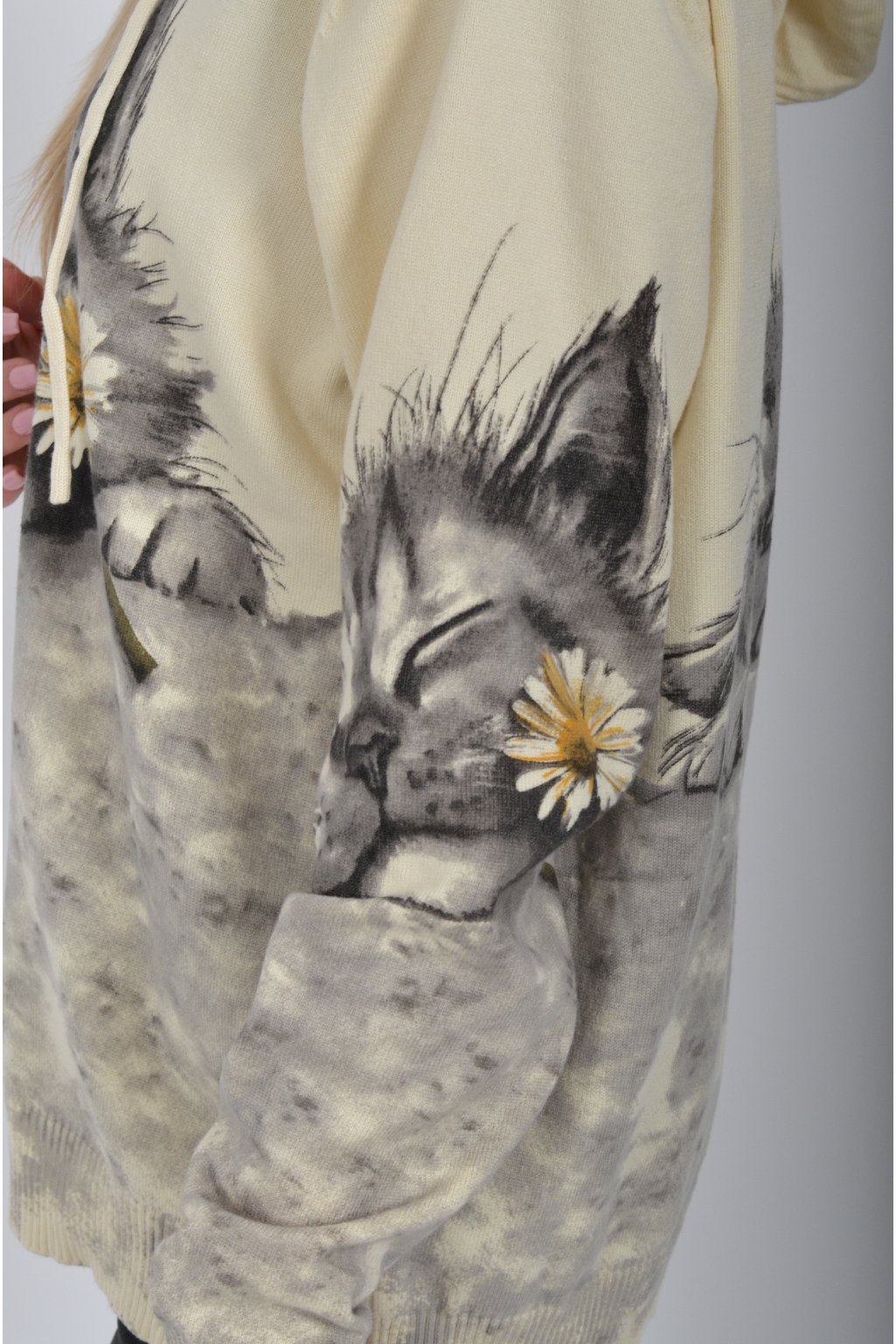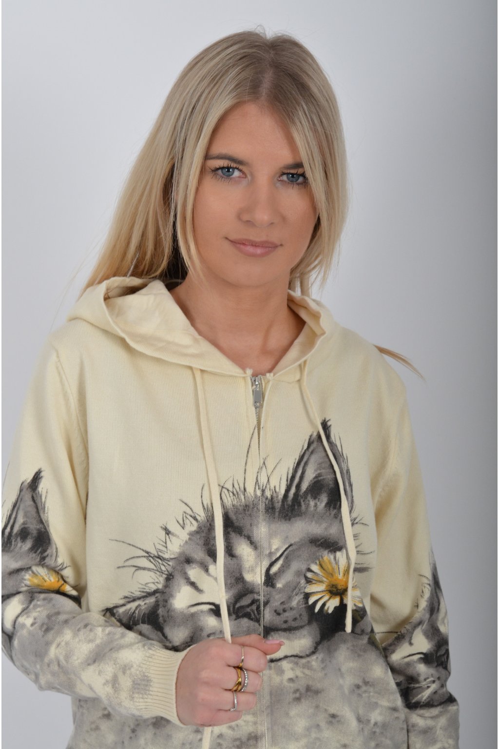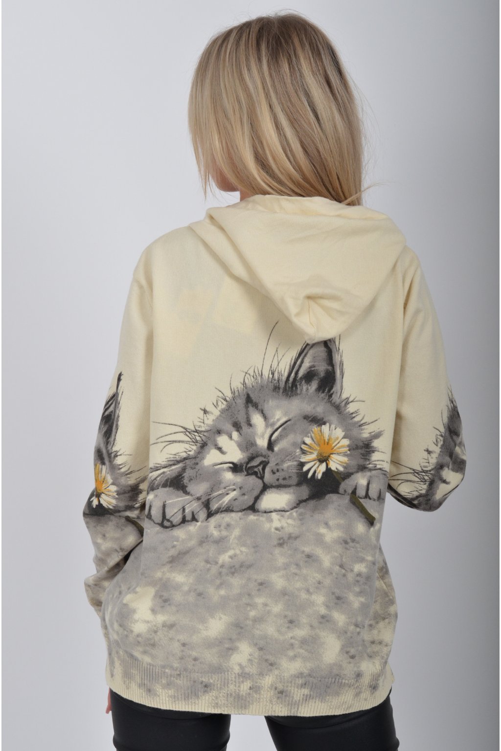 Svetr se zapínáním na zip a kapucí vyrobený z velice příjemného a heboučkého materiálu. Má krásný kočičí vzor. Materiál je průžný.