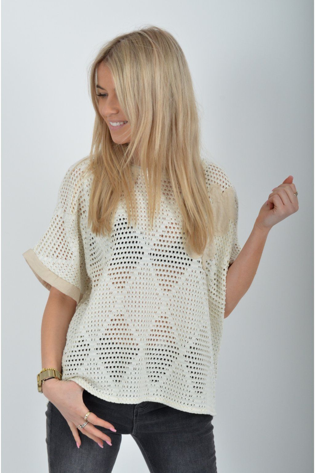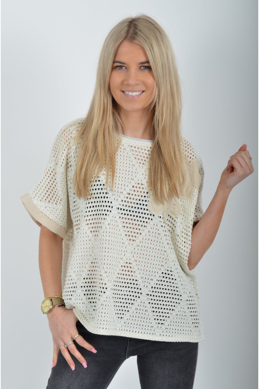 Svetřík s krátkým rukávem vyrobený z odlehčeného a nekousavého materiálu. V přední části má našitý vzor ve tvaru květiny.
