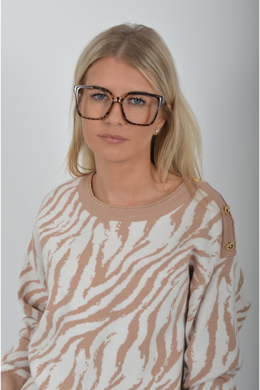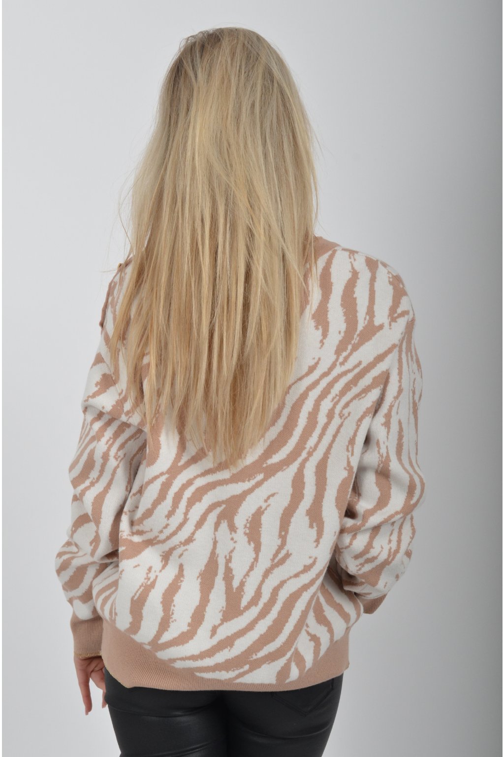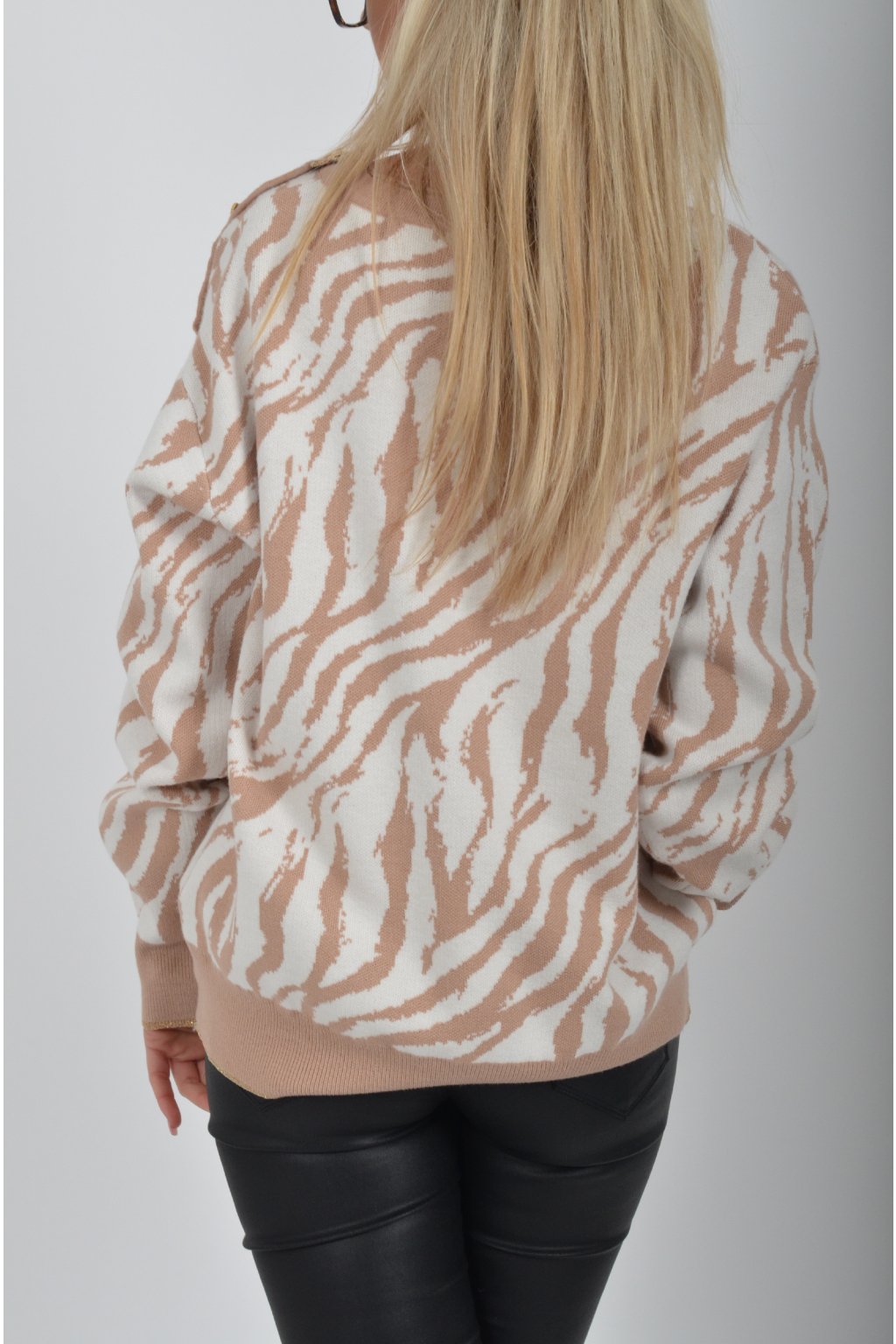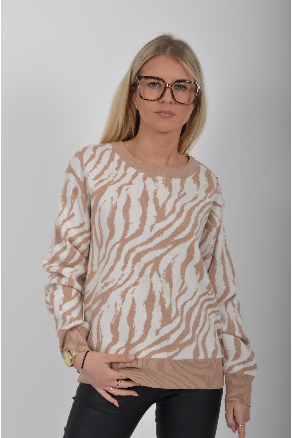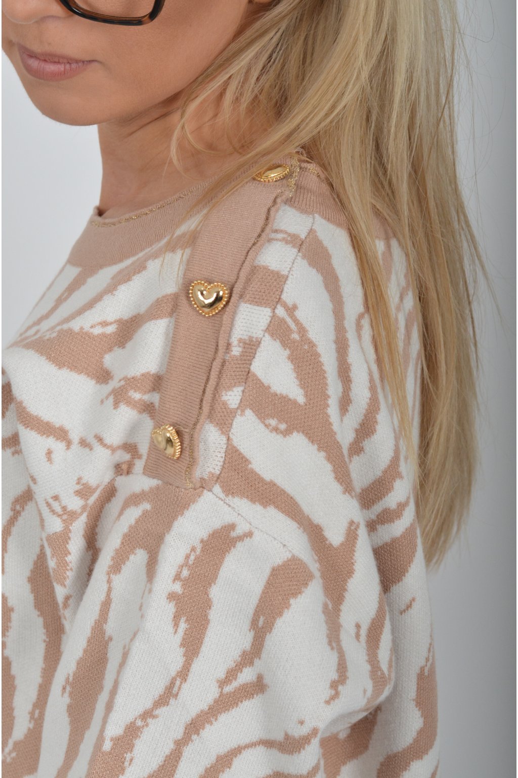 Vzorovaný svetr vyrobený z prémiového pružného materiálu. Na rameni má ozdobné knoflíky ve tvaru srdce.