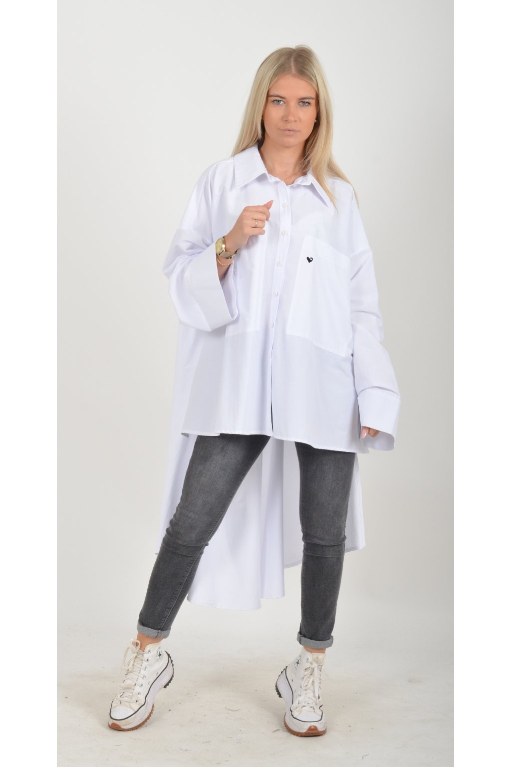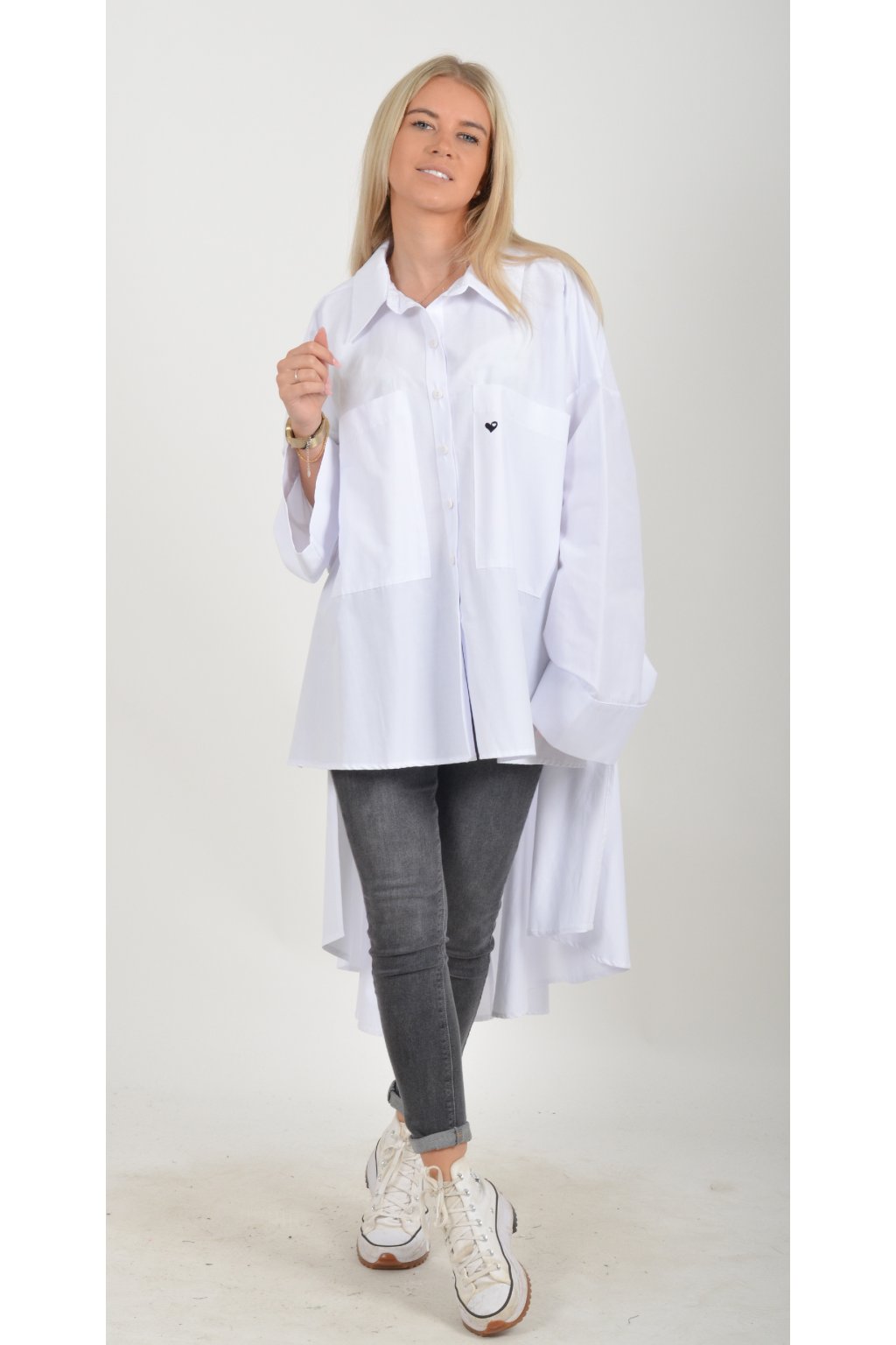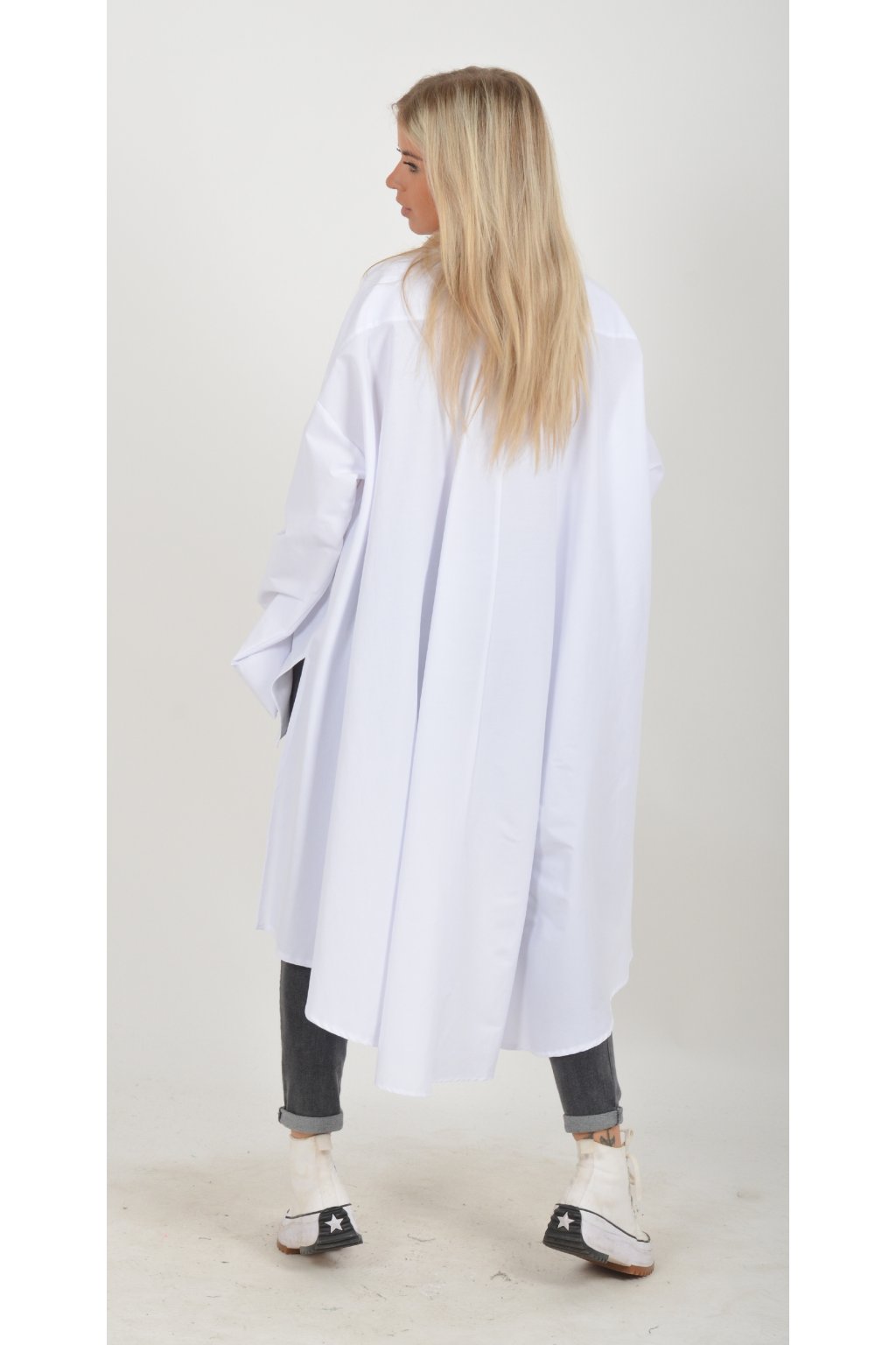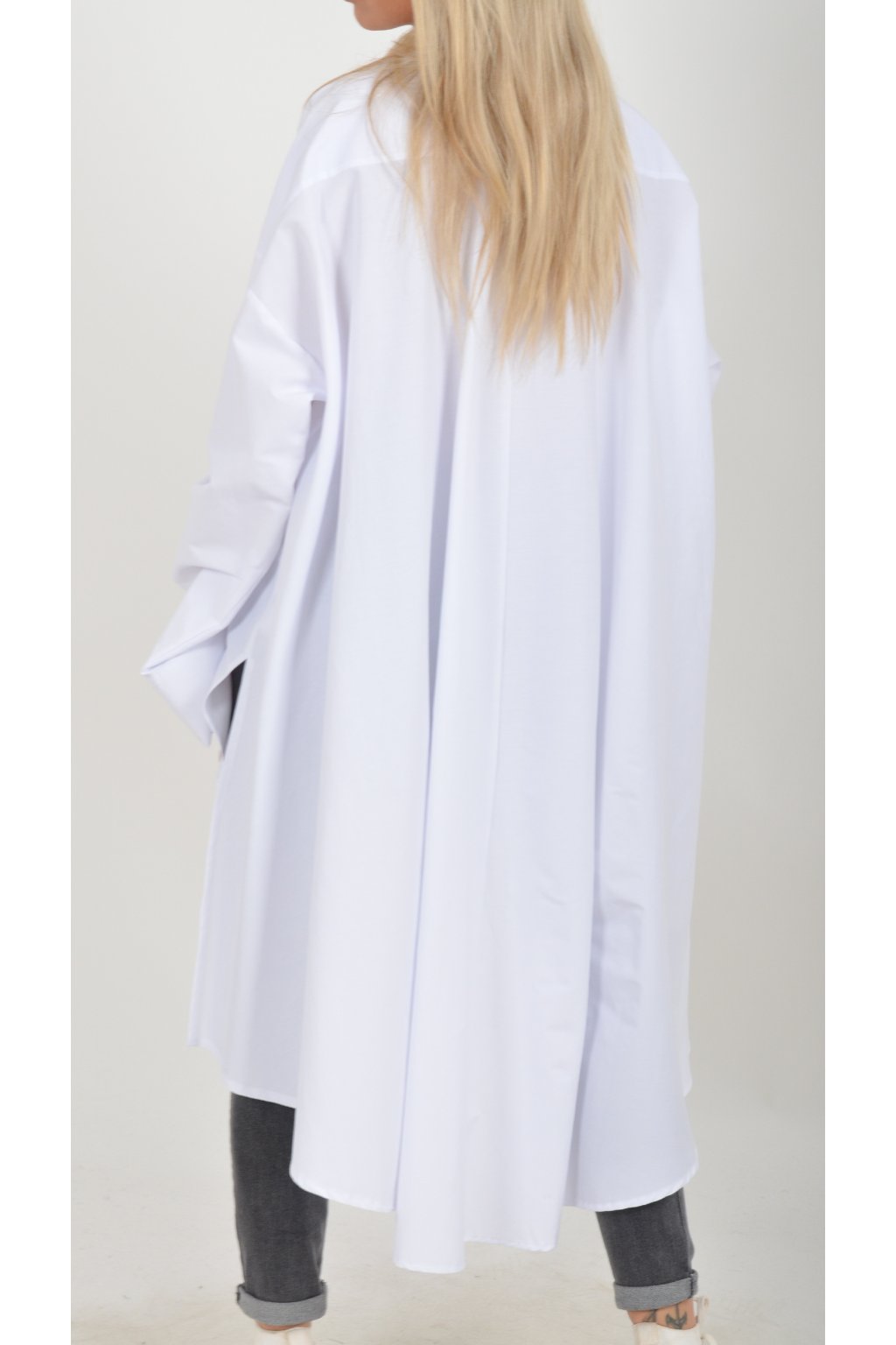 Luxusní oversize košile atypického áčkového střihu s límečkem. Zadní část košile je výrazně delší než přední, čímž optický prodlouží postavu. Má náprsní kapsy a dlouhý rukáv. Zapínání má sedm knoflíků. Košile je vyrobena z velice příjemného materiálu. Je vhodná jak džínům, tak k legínám. Hodí se jak do společnosti, tak i ke každodennímu nošení.