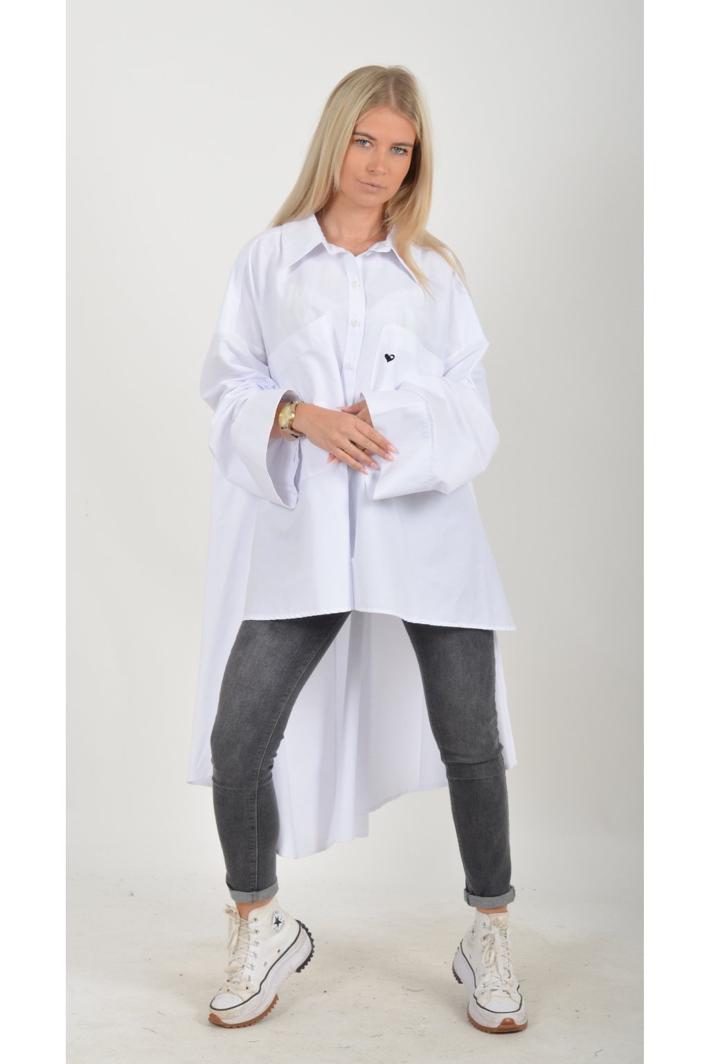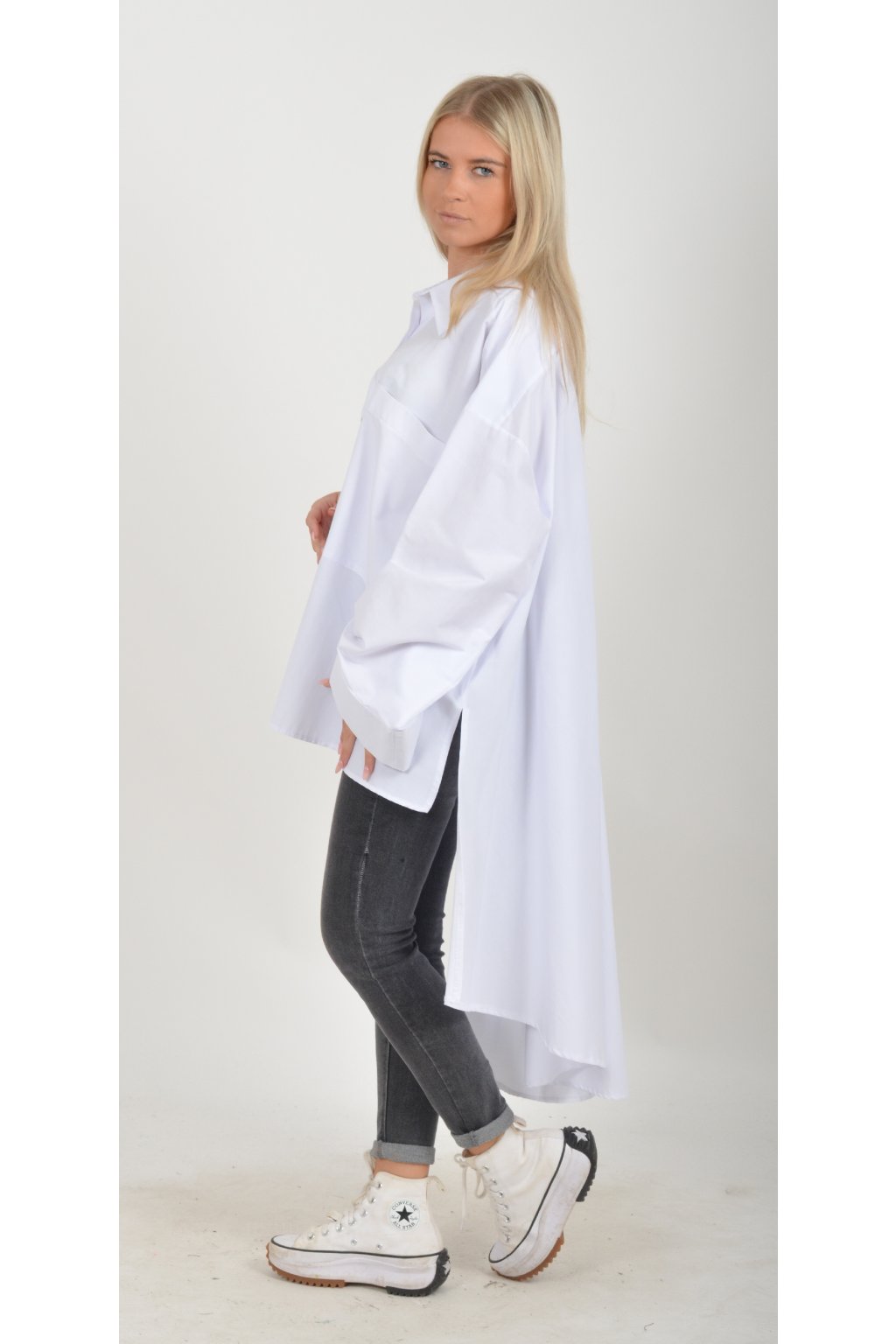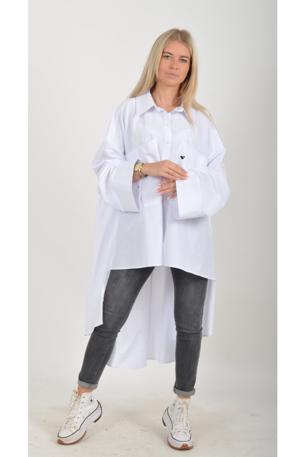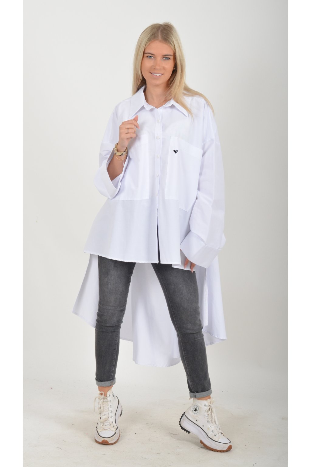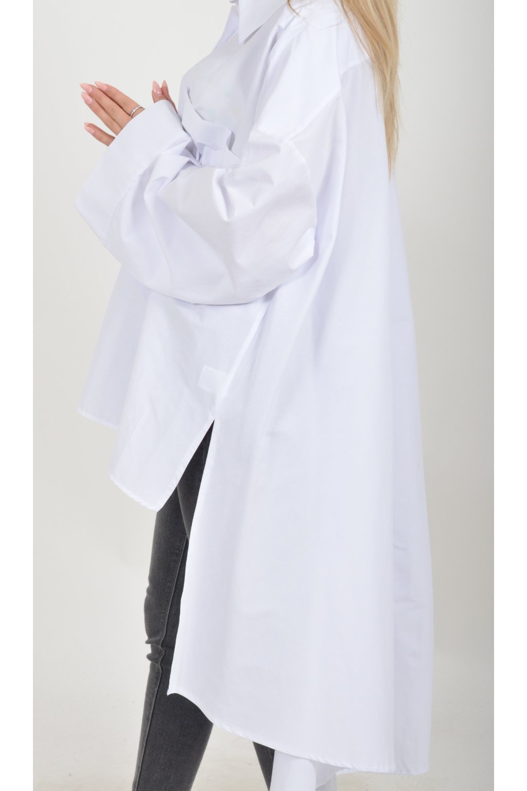 Luxusní oversize košile atypického áčkového střihu s límečkem. Zadní část košile je výrazně delší než přední, čímž optický prodlouží postavu. Má náprsní kapsy a dlouhý rukáv. Zapínání má sedm knoflíků. Košile je vyrobena z velice příjemného materiálu. Je vhodná jak džínům, tak k legínám. Hodí se jak do společnosti, tak i ke každodennímu nošení.