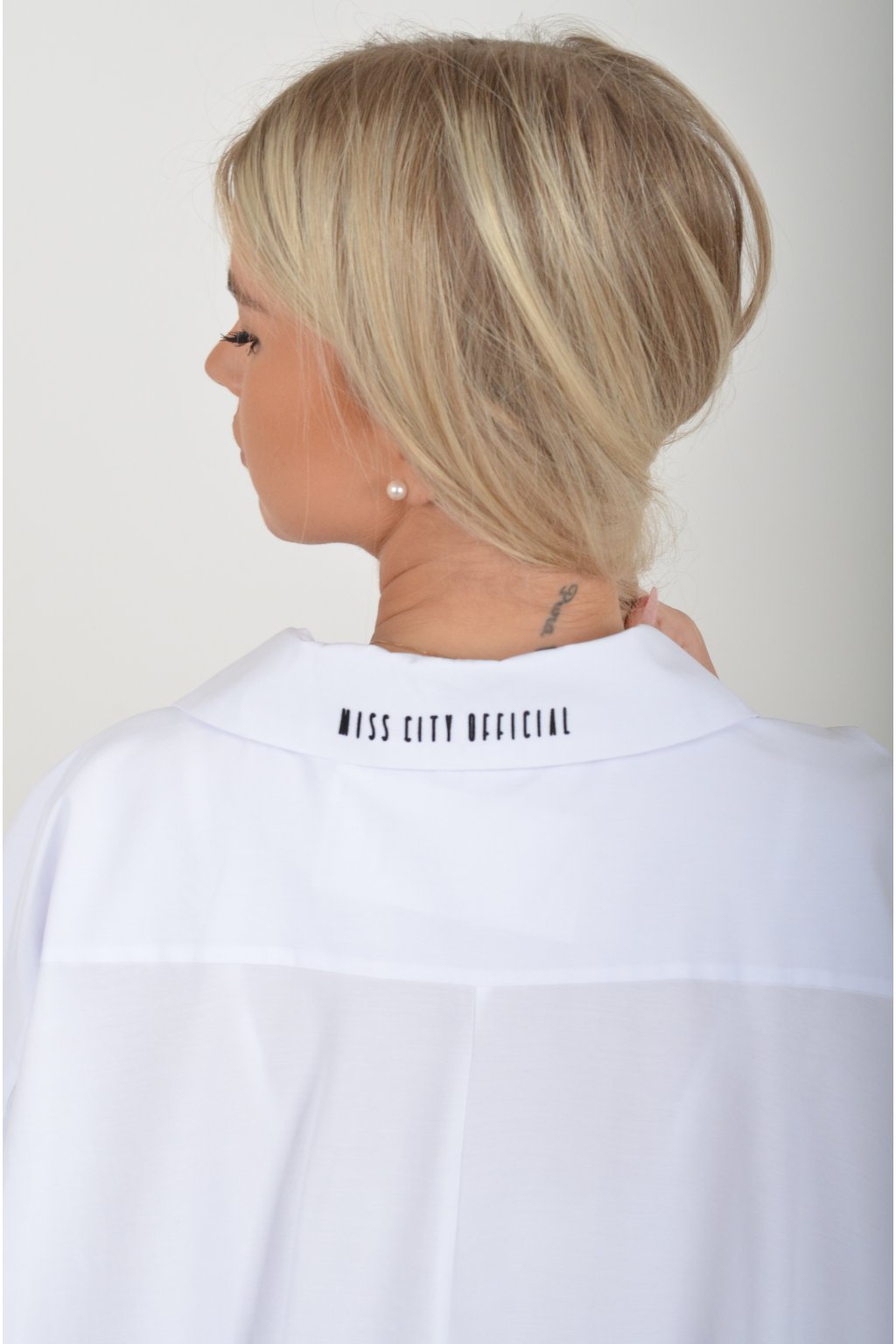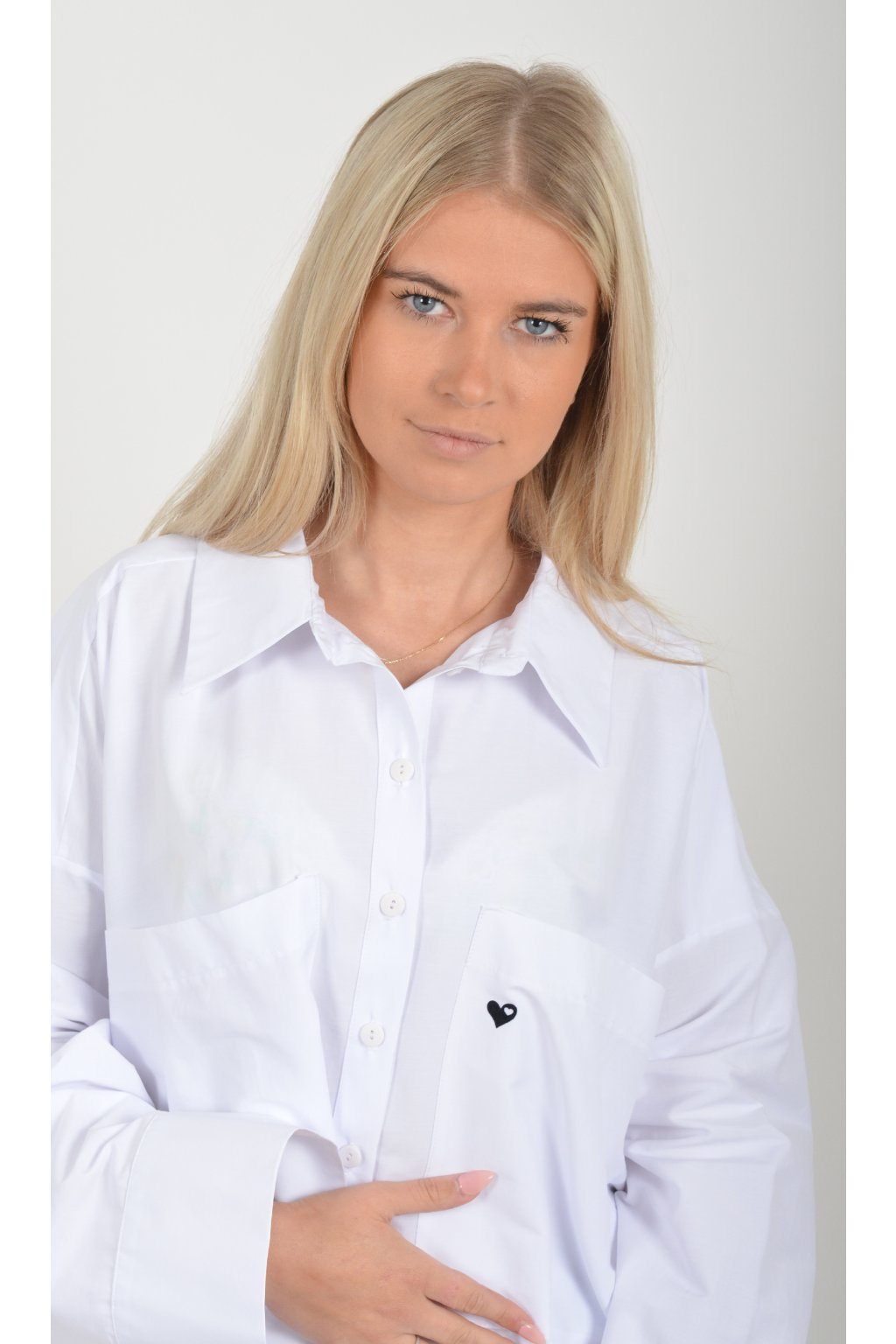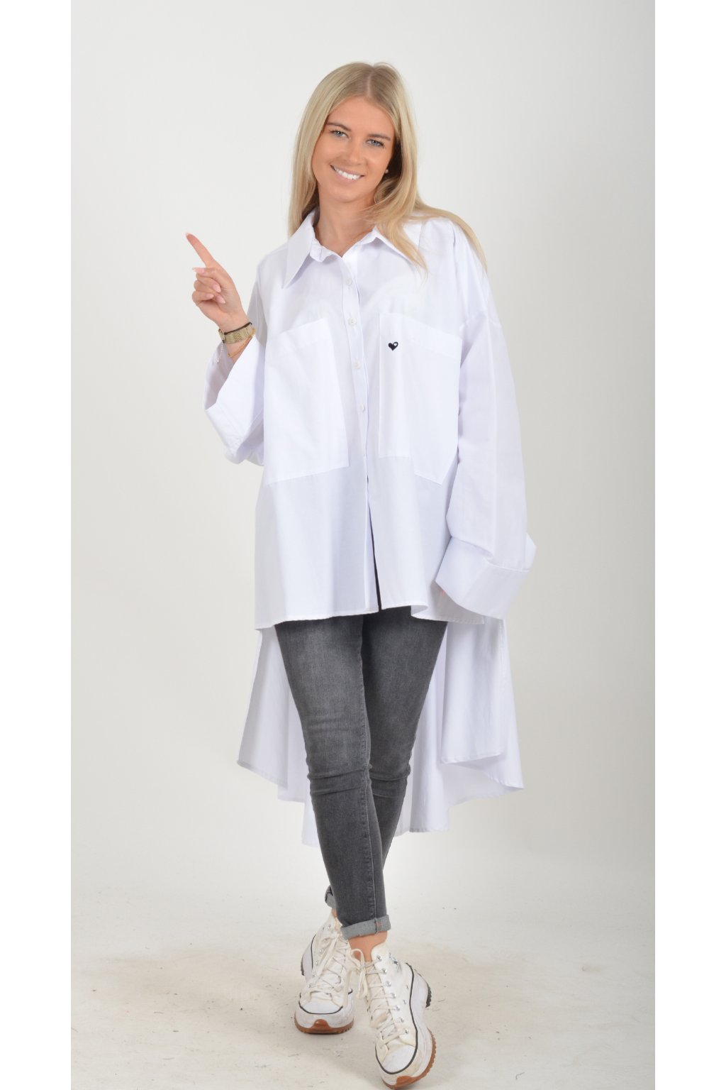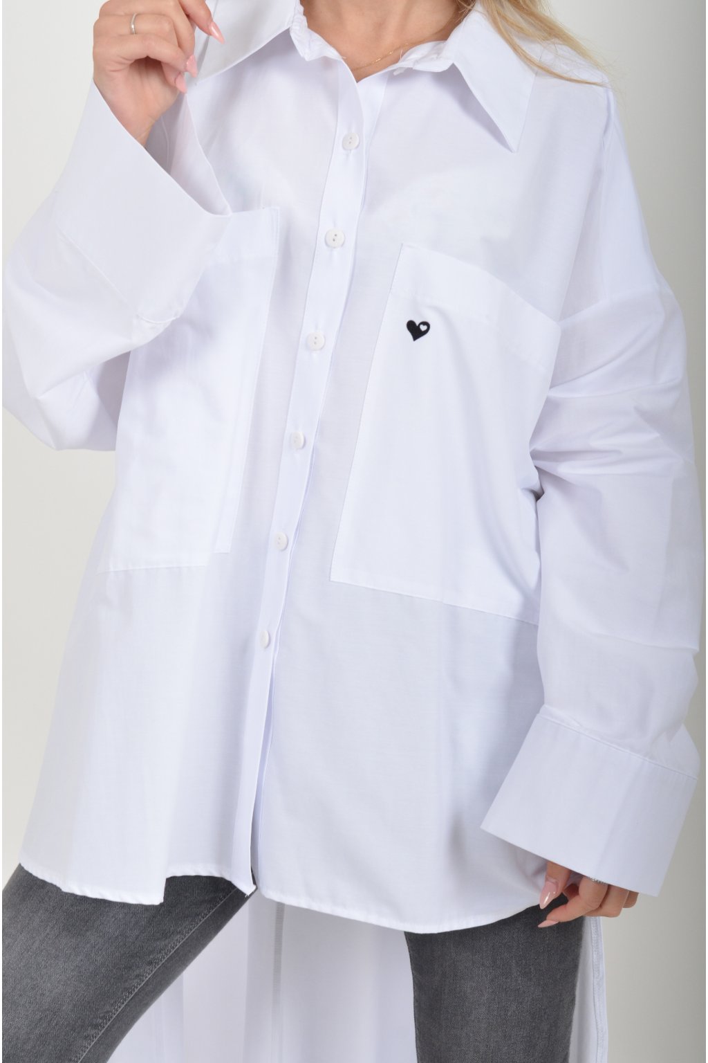 Luxusní oversize košile atypického áčkového střihu s límečkem. Zadní část košile je výrazně delší než přední, čímž optický prodlouží postavu. Má náprsní kapsy a dlouhý rukáv. Zapínání má sedm knoflíků. Košile je vyrobena z velice příjemného materiálu. Je vhodná jak džínům, tak k legínám. Hodí se jak do společnosti, tak i ke každodennímu nošení.