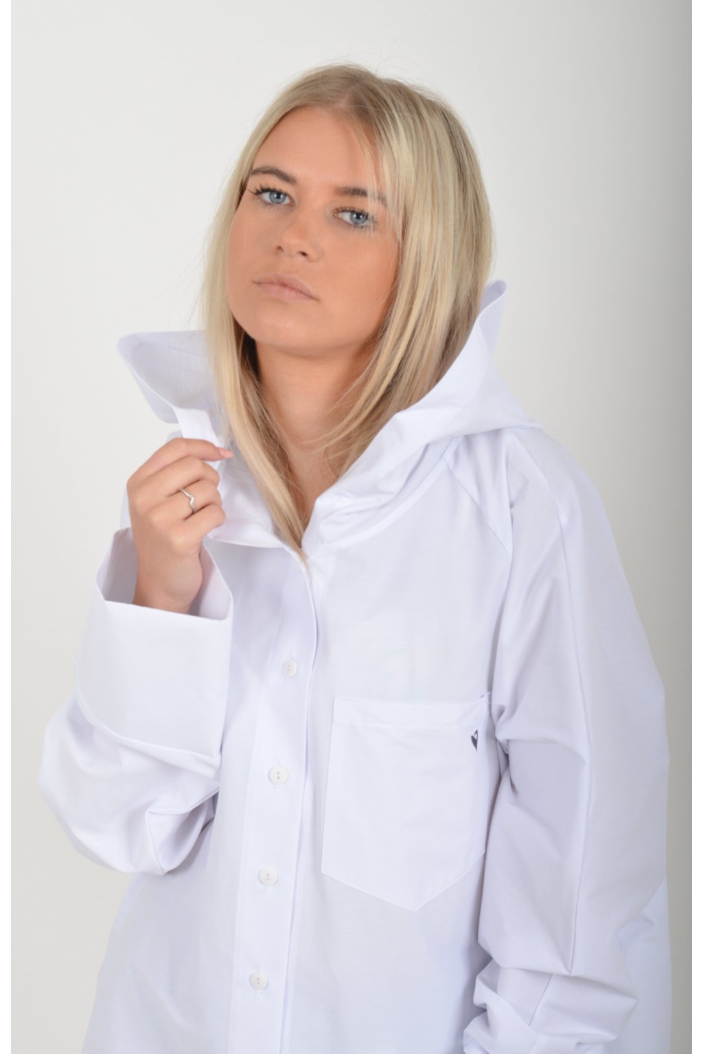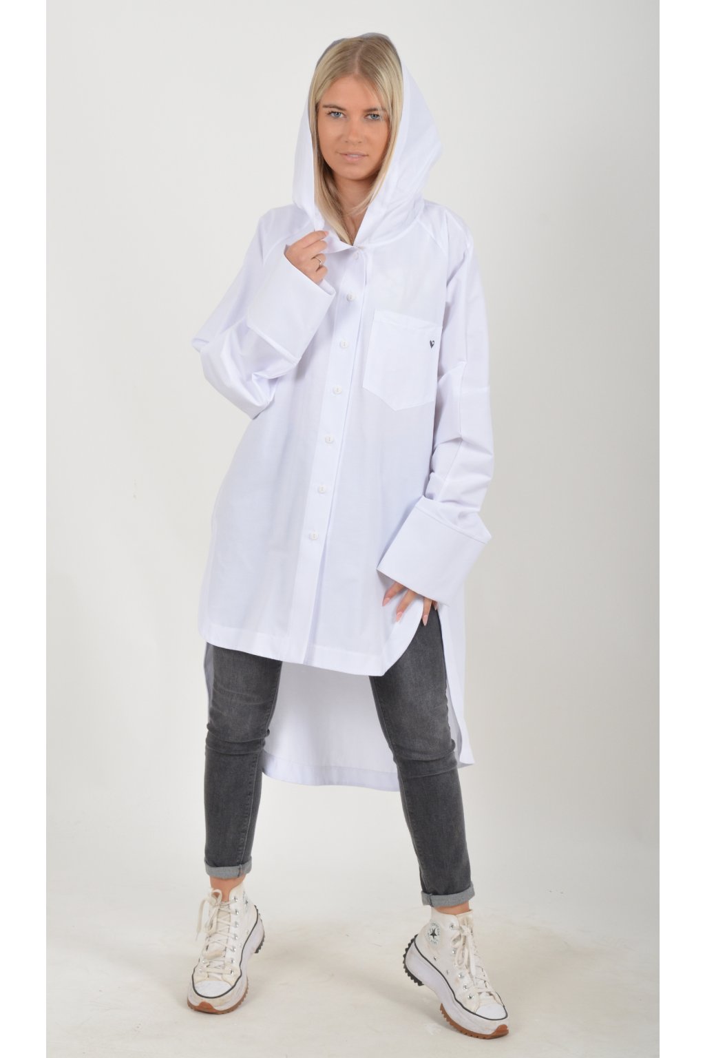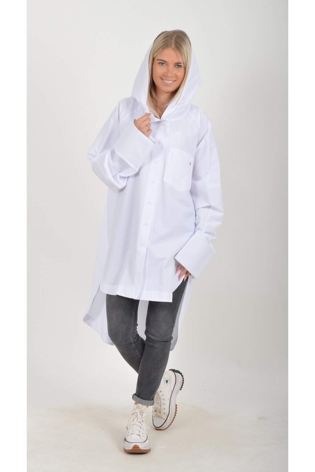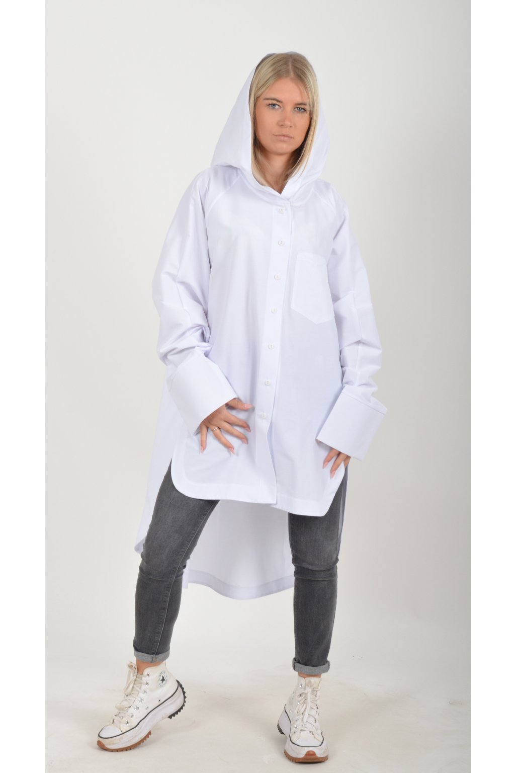Luxusní oversize košile atypického střihu s kapucí. Zadní část košile je výrazně delší než přední, čímž optický prodlouží postavu. Má náprsní kapsy a dlouhý rukáv. Zapínání má sedm knoflíků. Košile je vyrobena z velice příjemného materiálu. Je vhodná jak džínům, tak k legínám. Hodí se jak do společnosti, tak i ke každodennímu nošení.