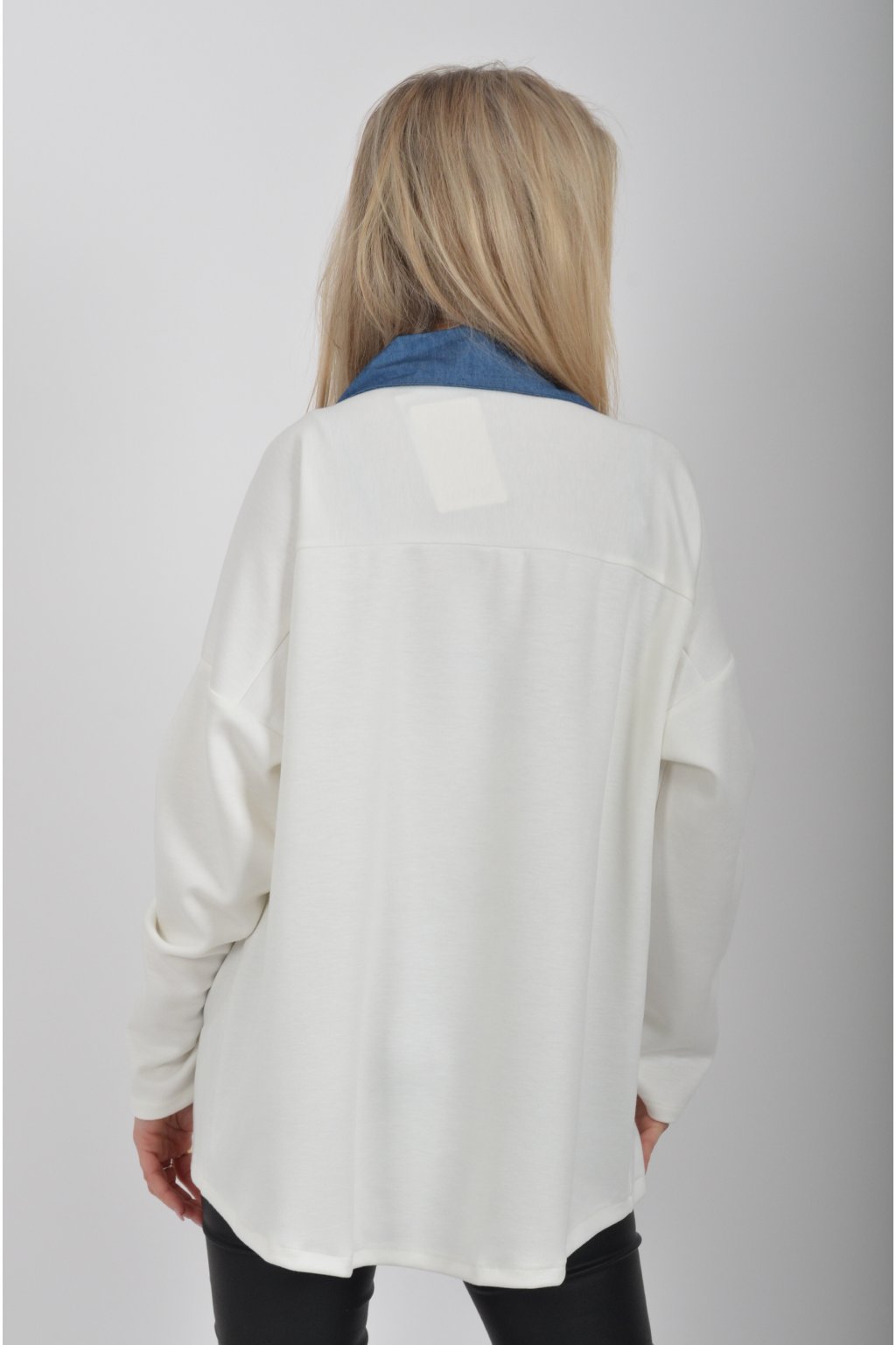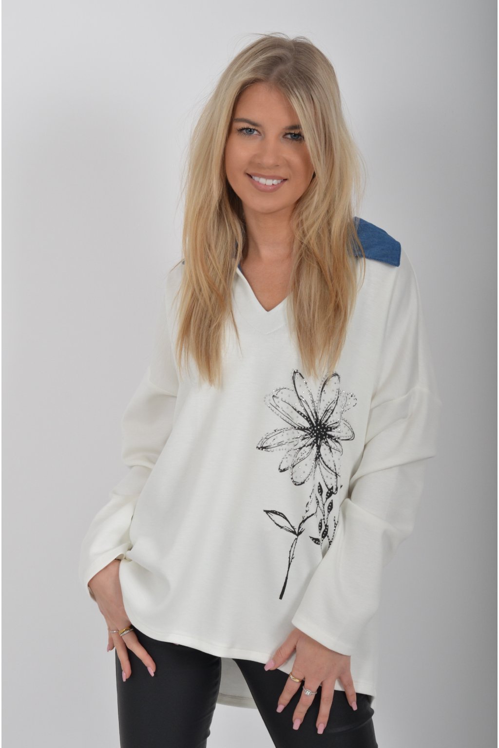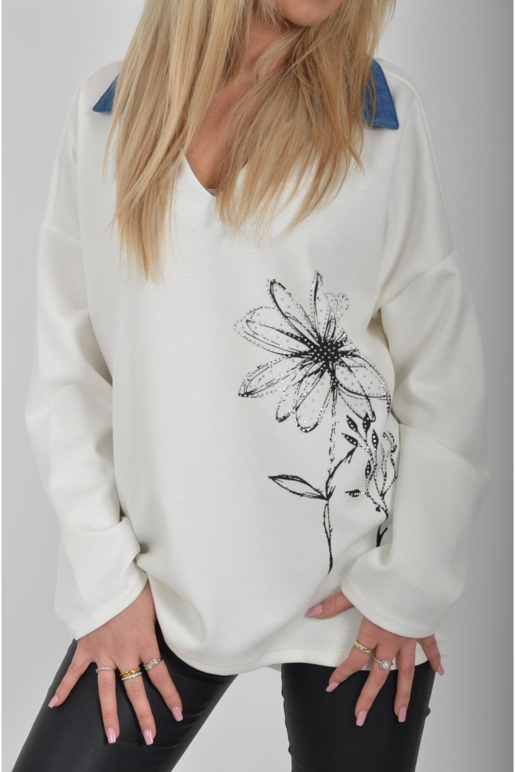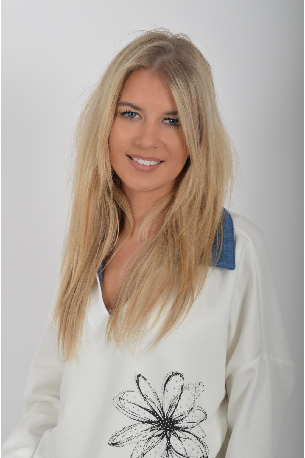 Halenka s dlouhým rukávem a modrým límečkem vyrobena z velice příjemného a jemného materiálu. V přední části má stříbrnou aplikaci.