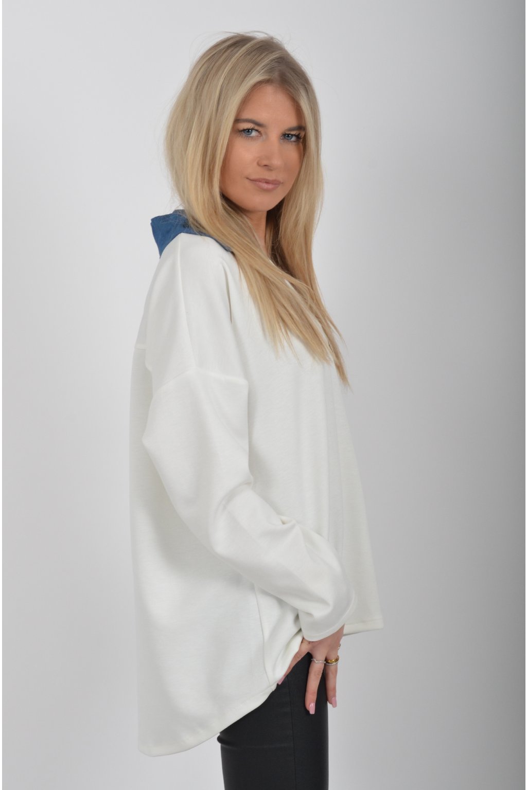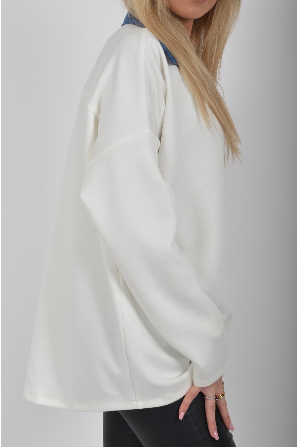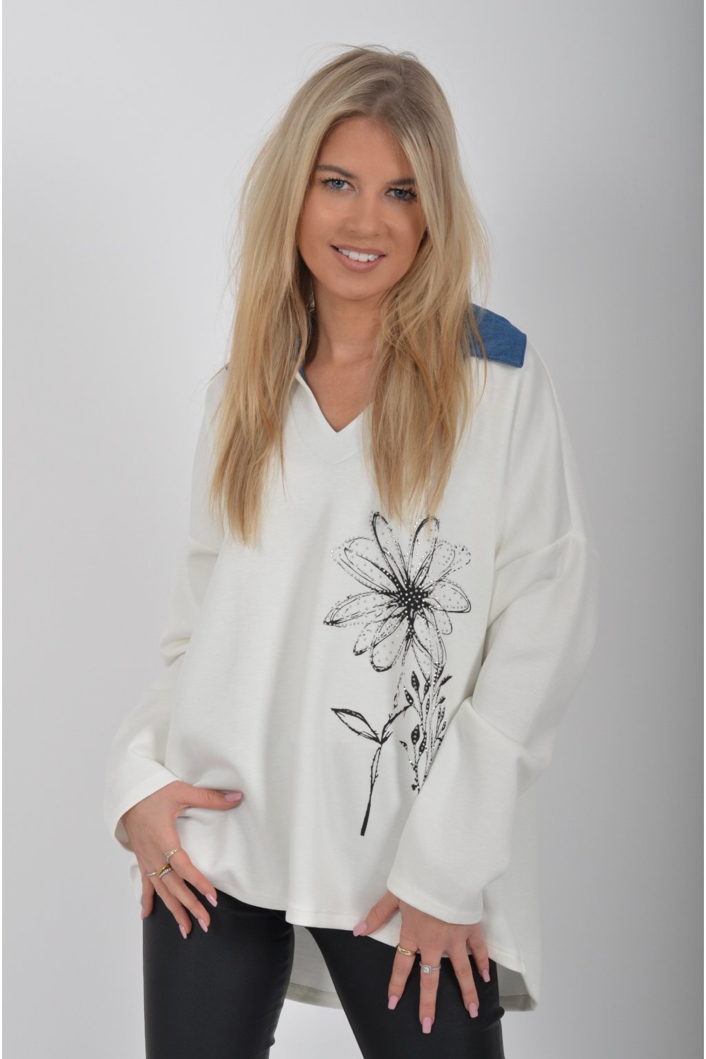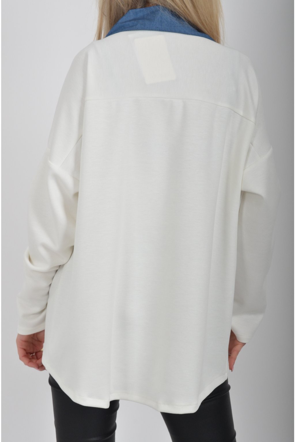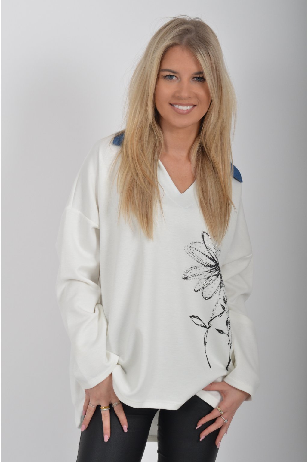 Halenka s dlouhým rukávem a modrým límečkem vyrobena z velice příjemného a jemného materiálu. V přední části má stříbrnou aplikaci.