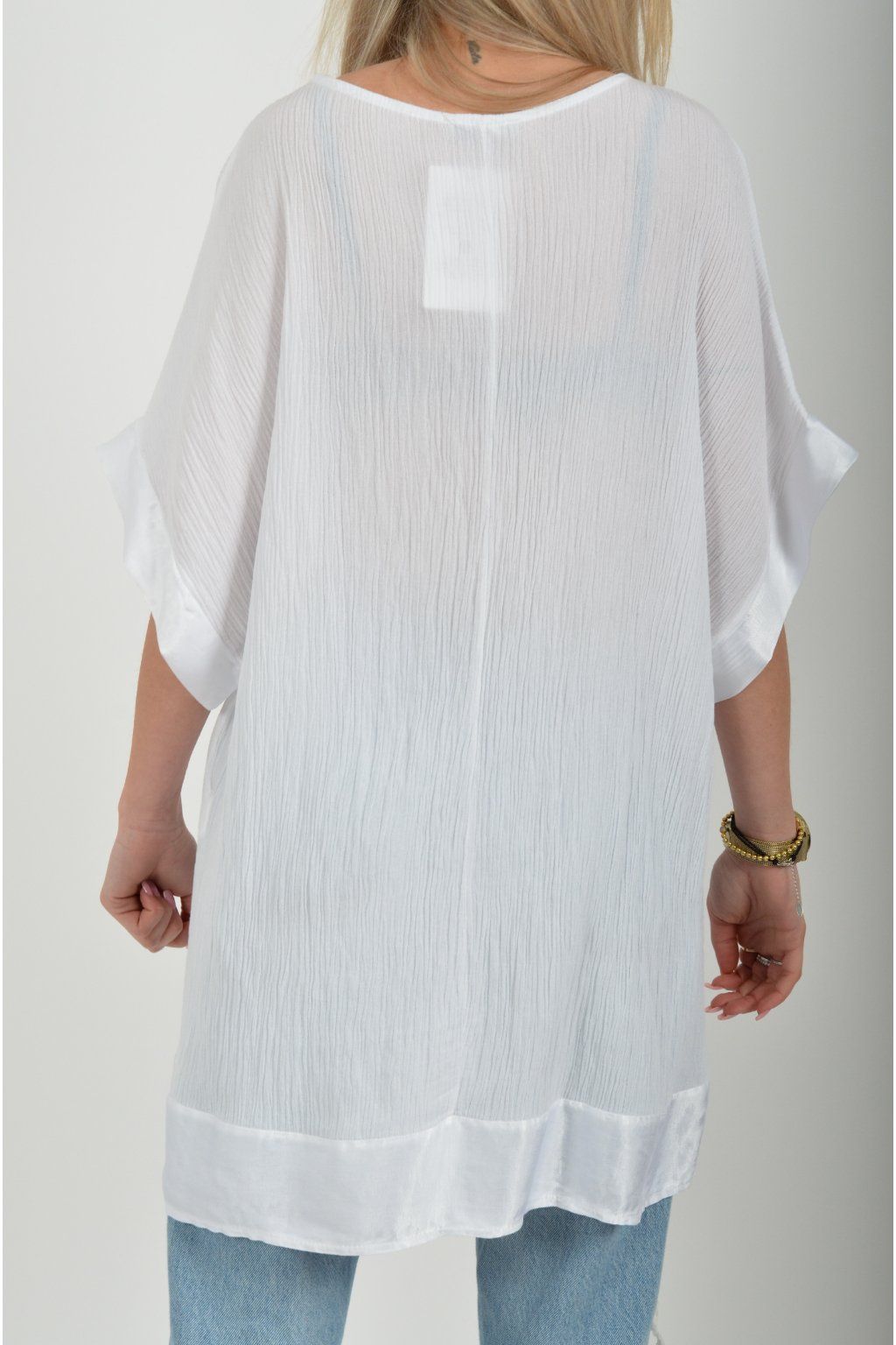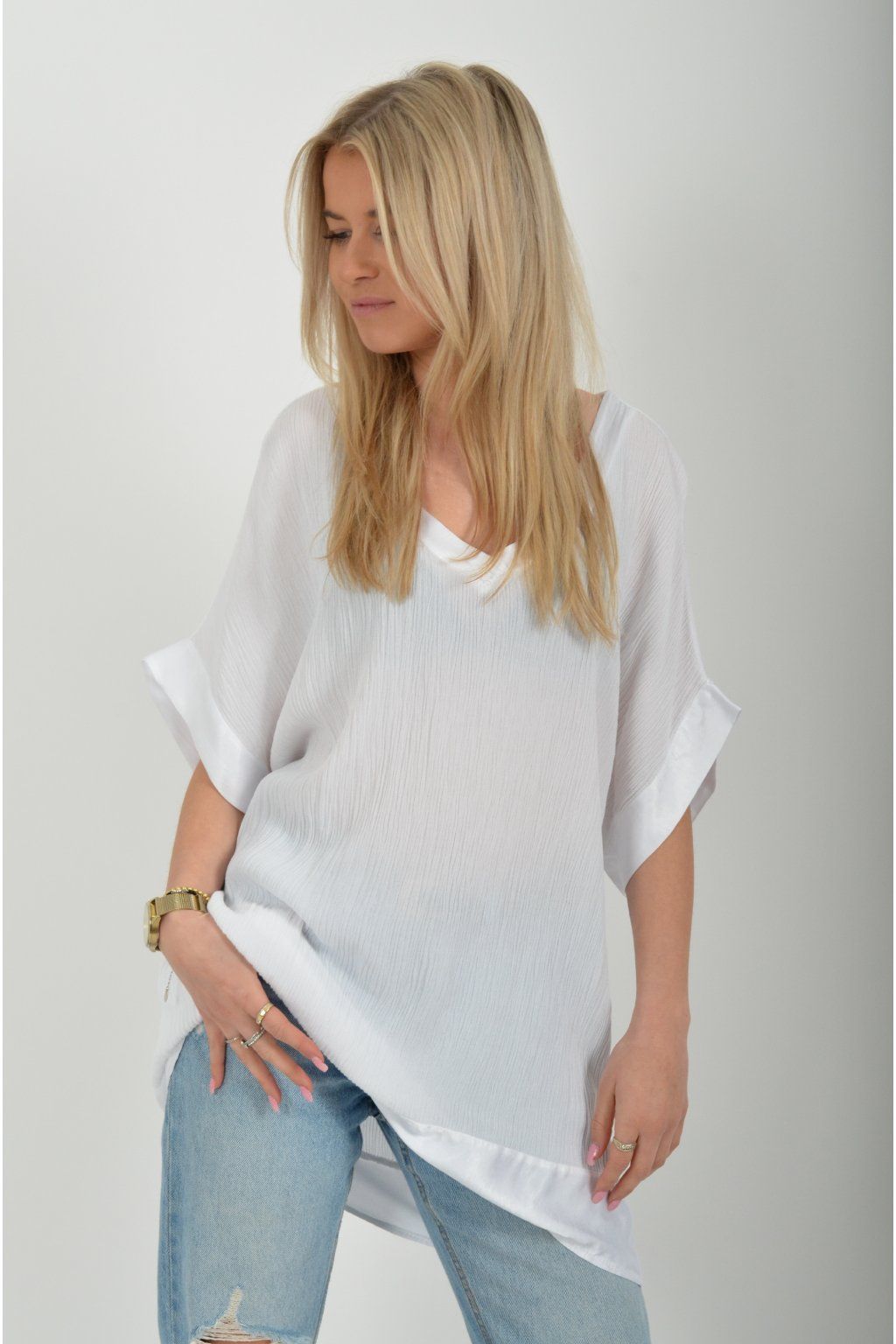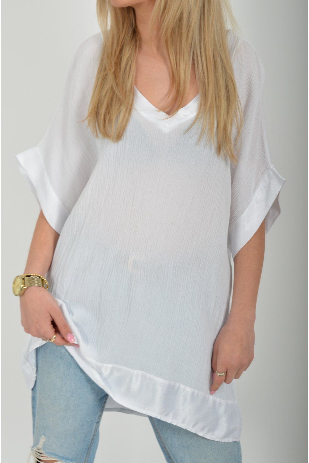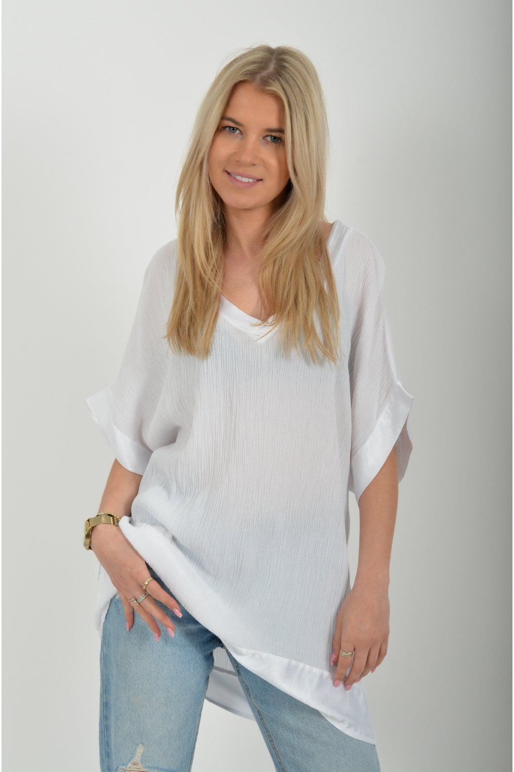 Oversize halenka s krátkým rukávem a lesklými ozdobnými lemy. Materiál halenky je lehce pružný a velice příjemný. Zadní část halenky je delší než přední.