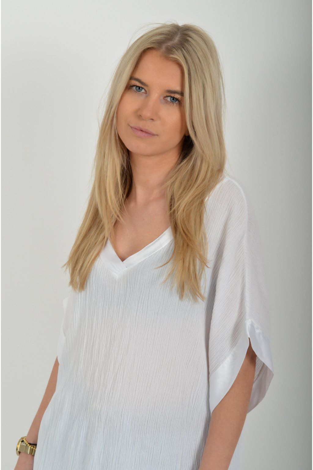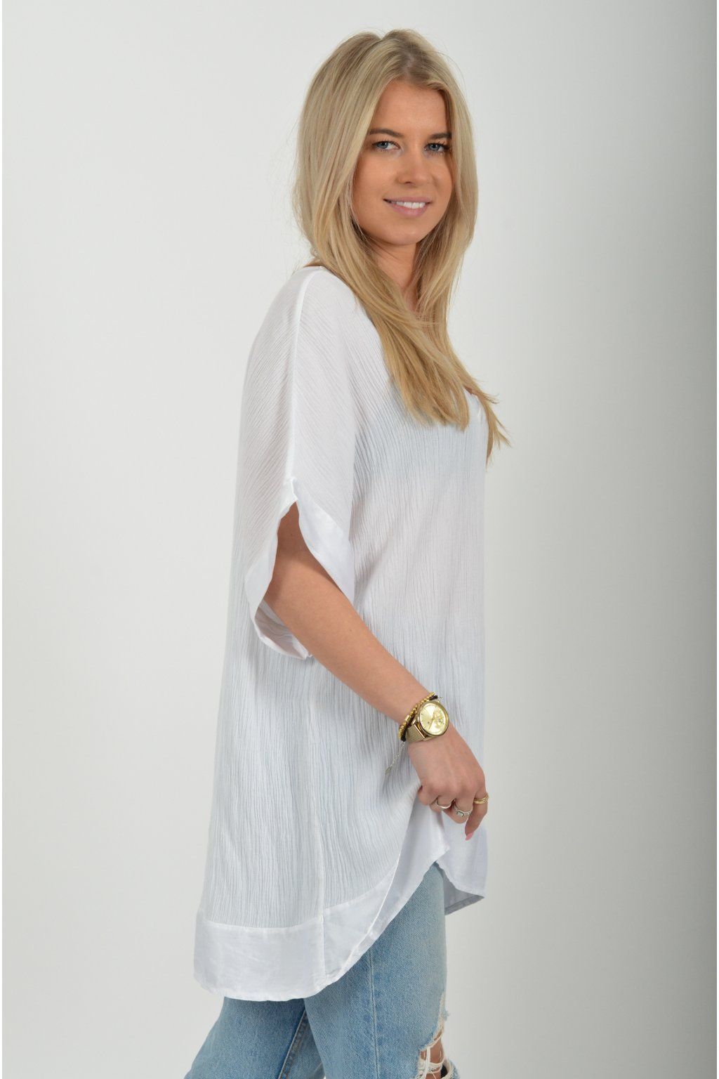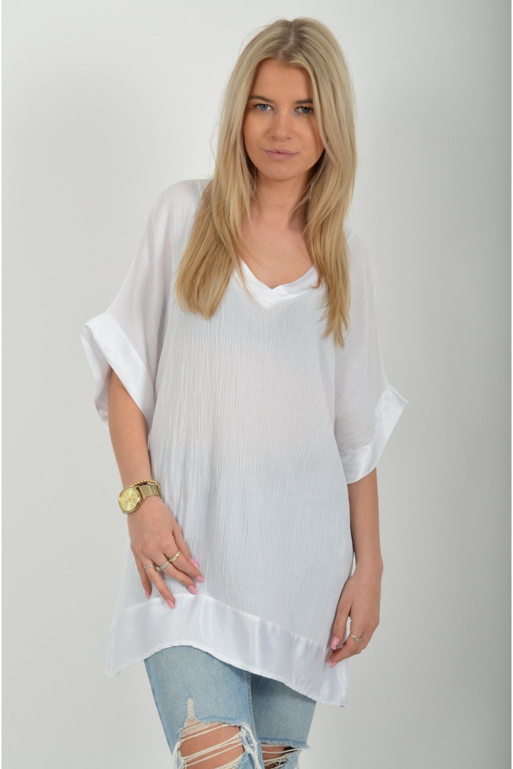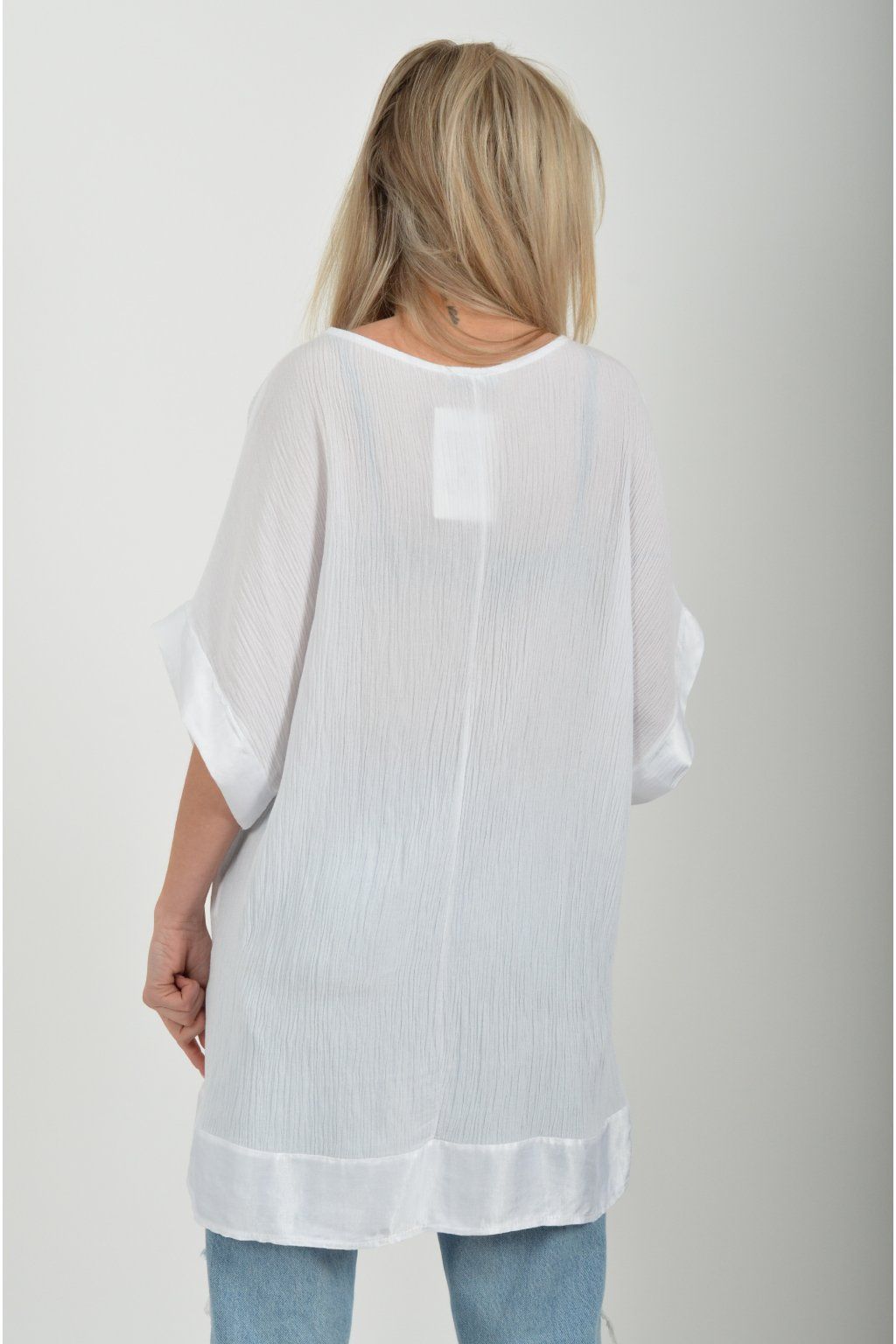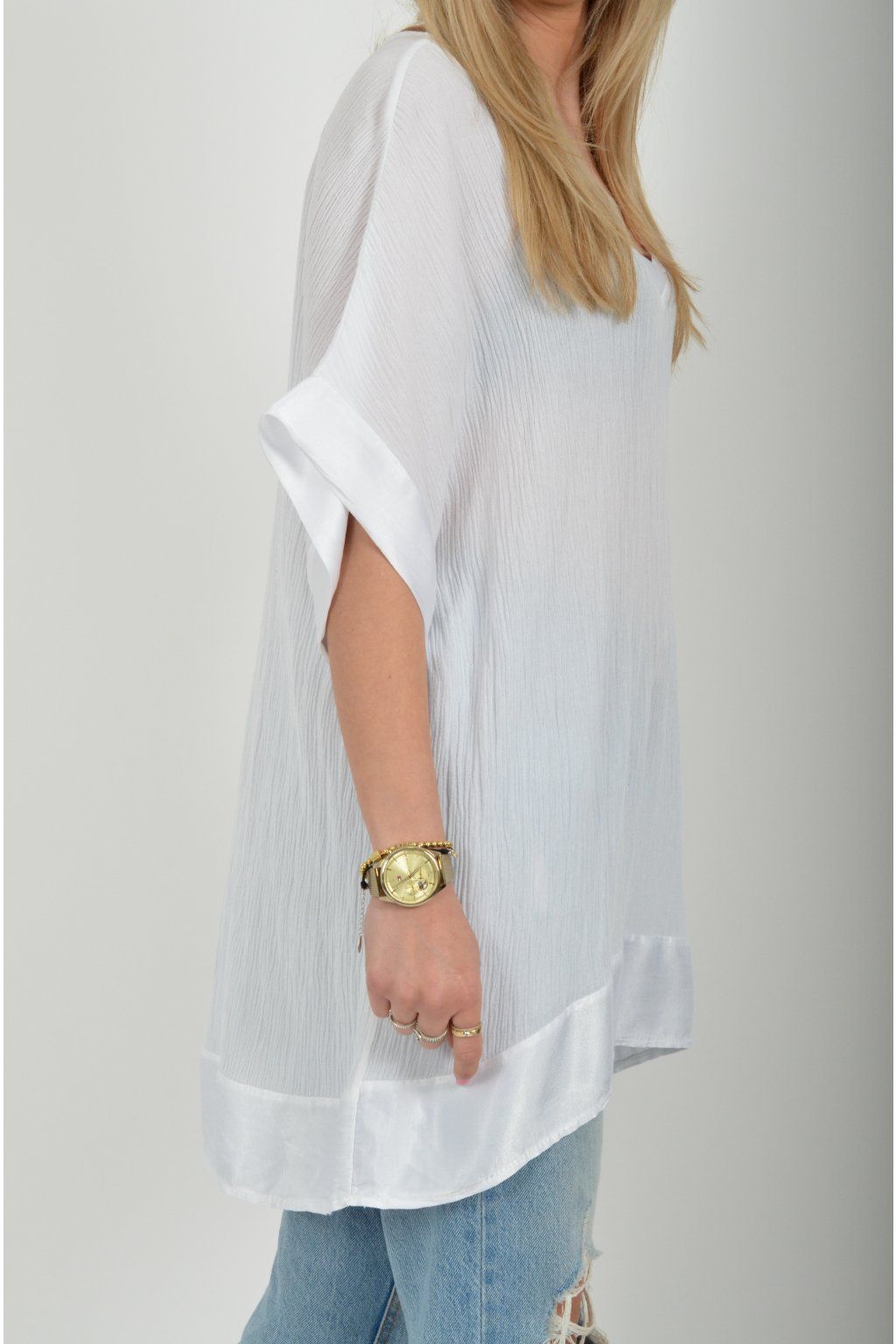 Oversize halenka s krátkým rukávem a lesklými ozdobnými lemy. Materiál halenky je lehce pružný a velice příjemný. Zadní část halenky je delší než přední.