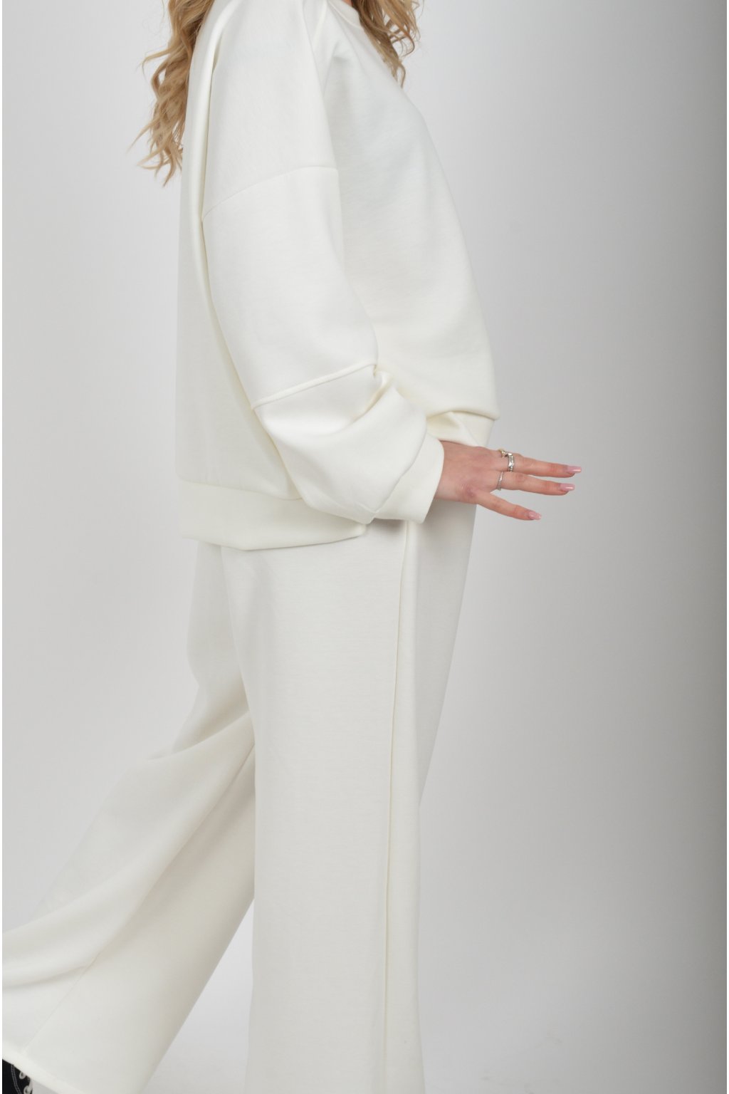 Tepláková souprava vyrobená z velice příjemného materiálu. Tepláky mají na bocích kapsy a jsou zvonového střihu.