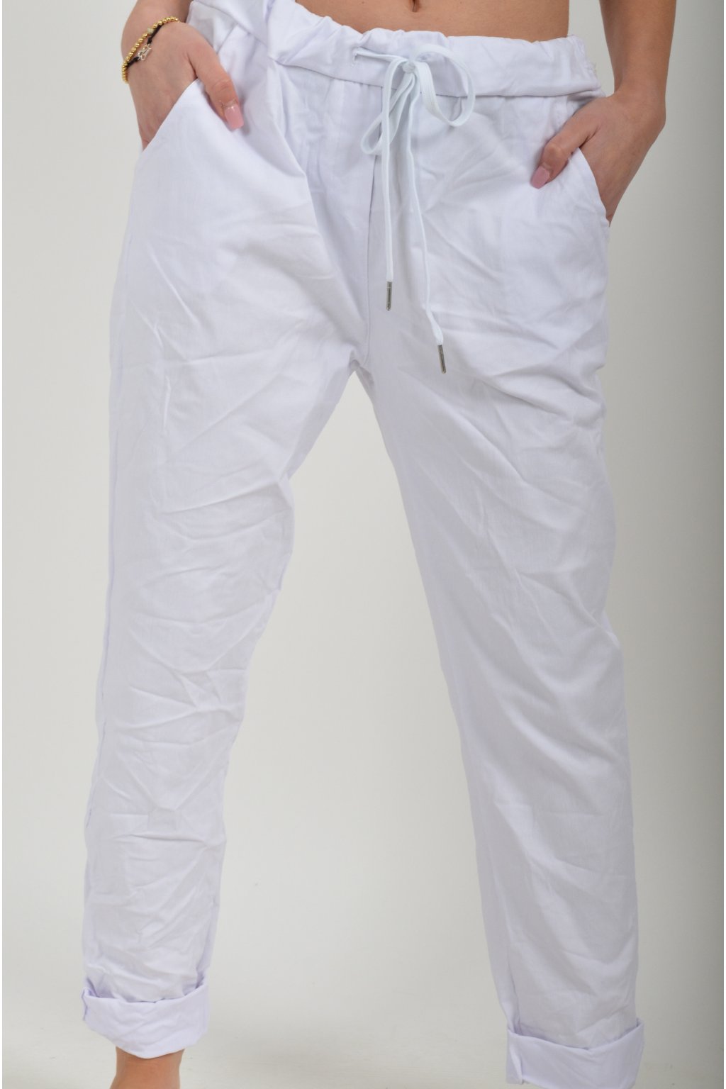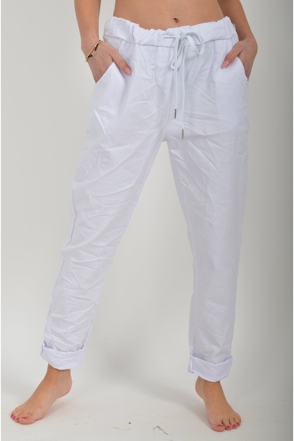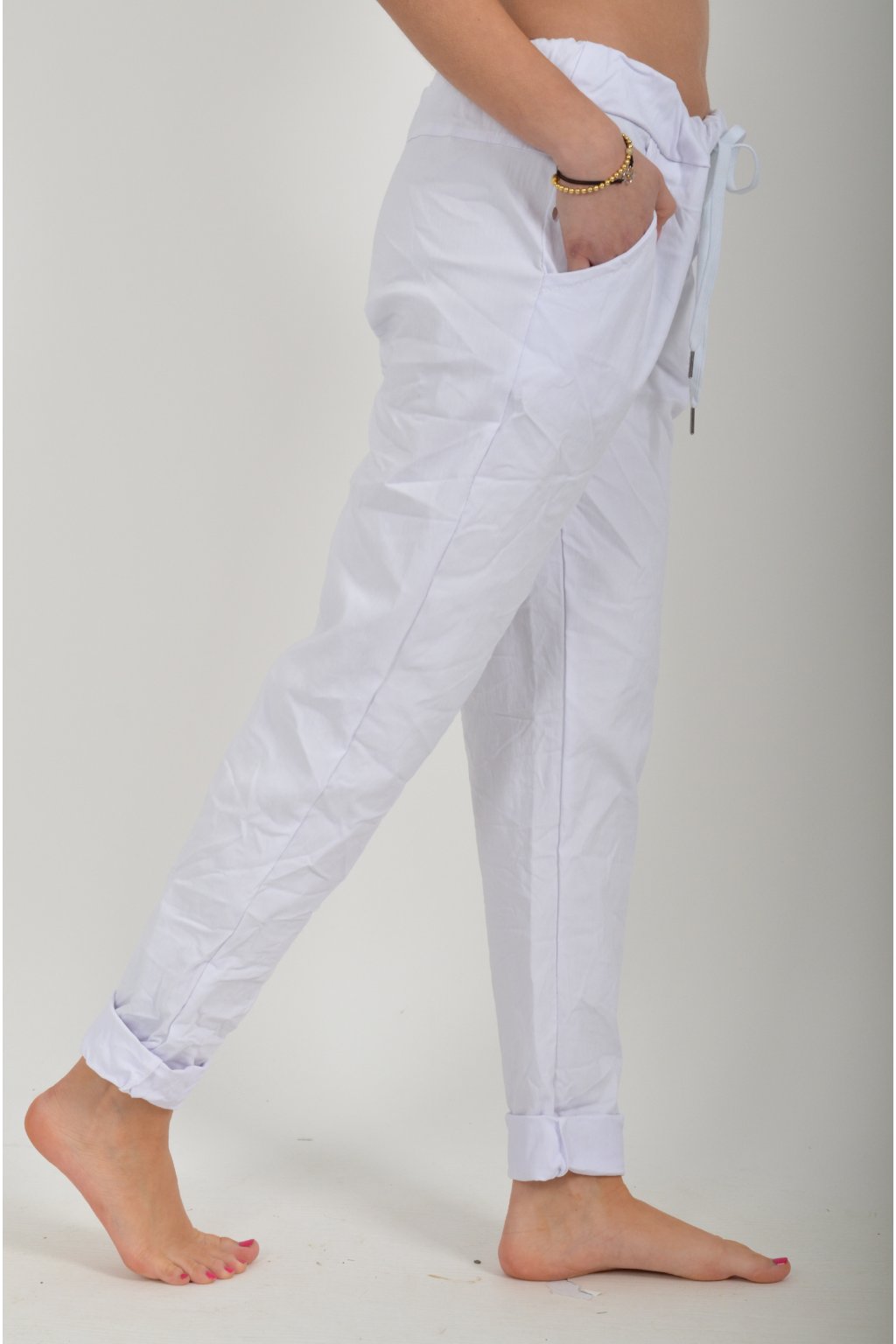 Jednobarevné kalhoty s kapsami na bocích, které se krásně přizpůsobí postavě, díky podílu elastanu. Jsou vhodné pro každodenní nošení. V pase je zapracovaná guma a tkanička pro libovolné stažení.