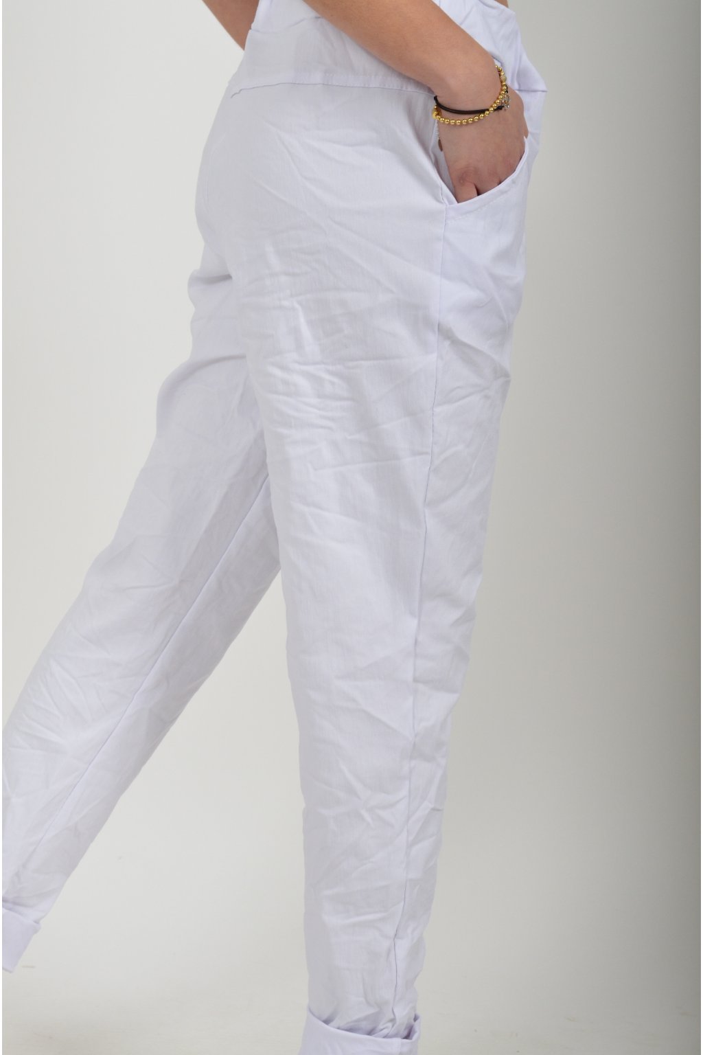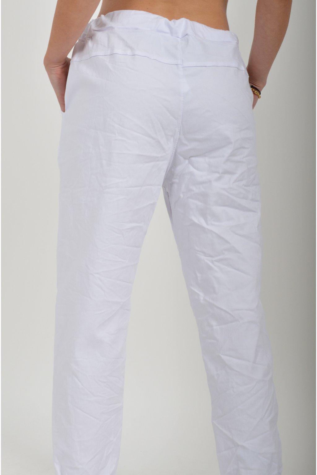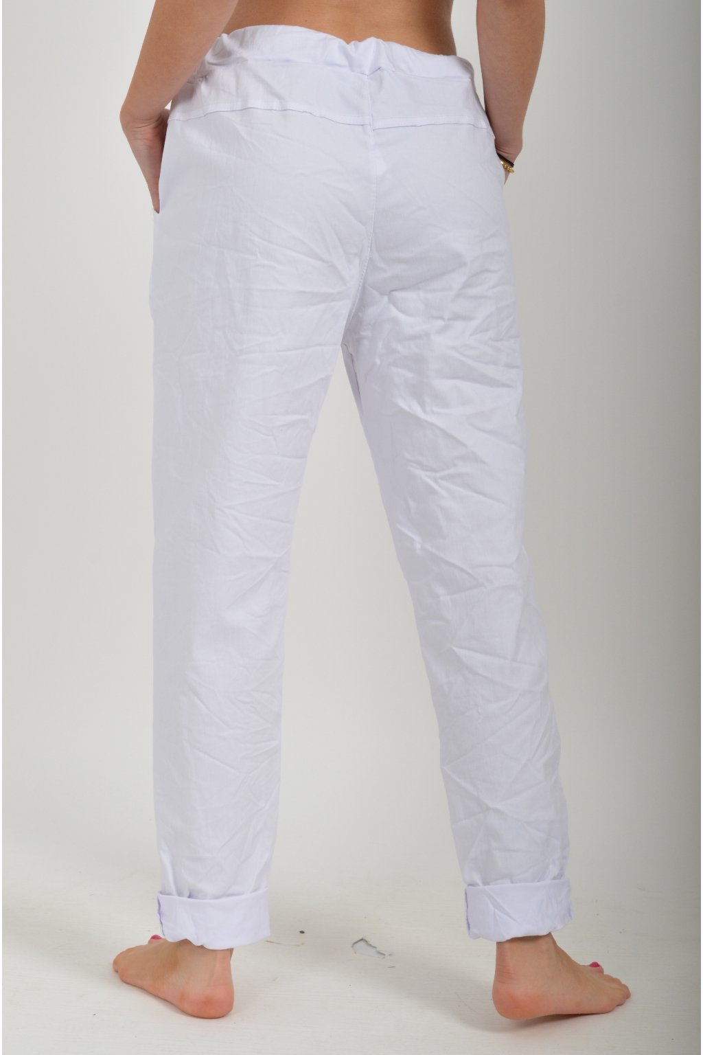 Jednobarevné kalhoty s kapsami na bocích, které se krásně přizpůsobí postavě, díky podílu elastanu. Jsou vhodné pro každodenní nošení. V pase je zapracovaná guma a tkanička pro libovolné stažení.