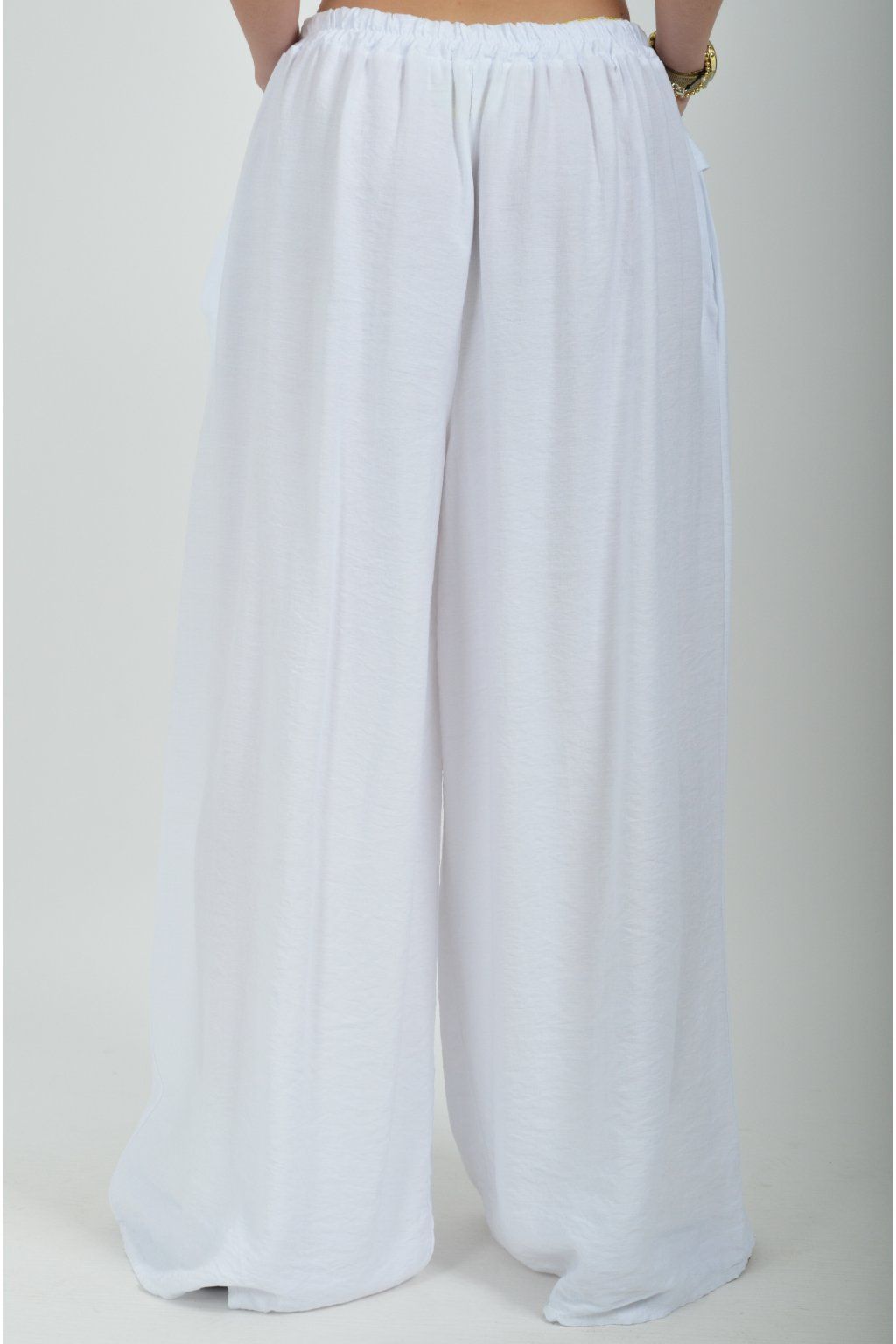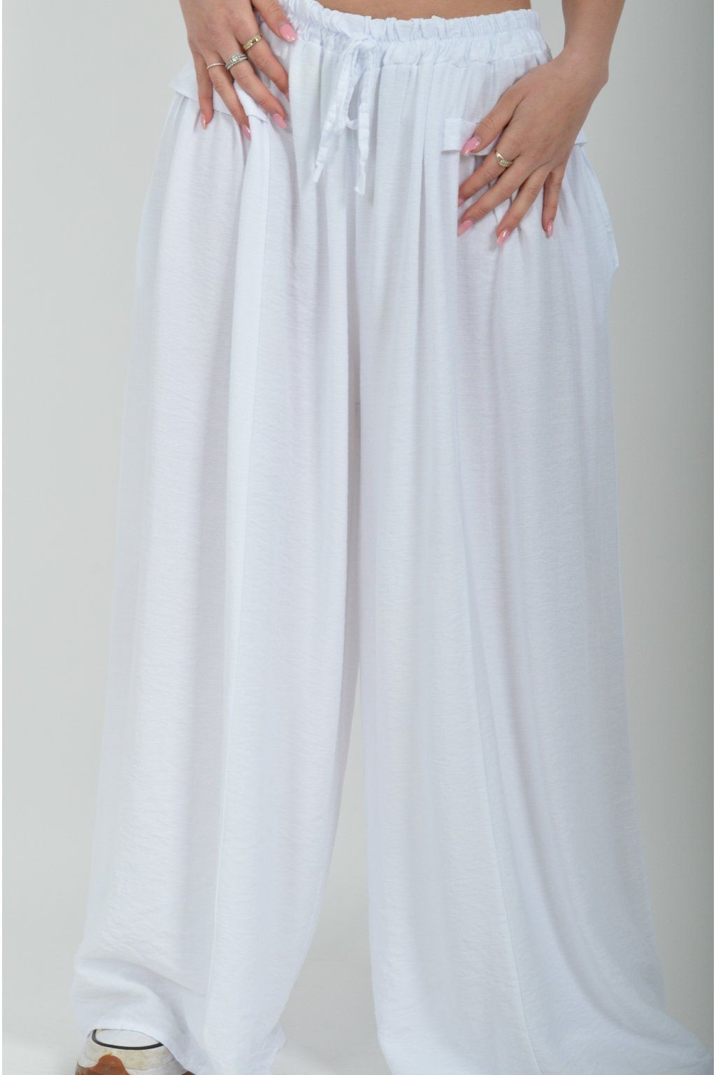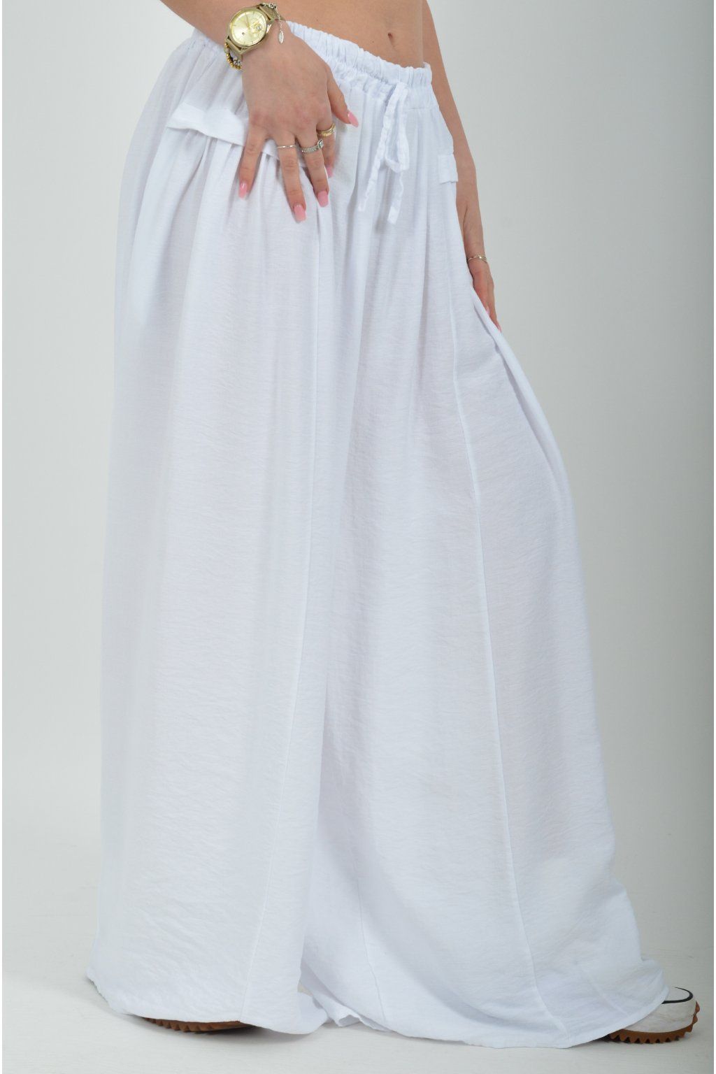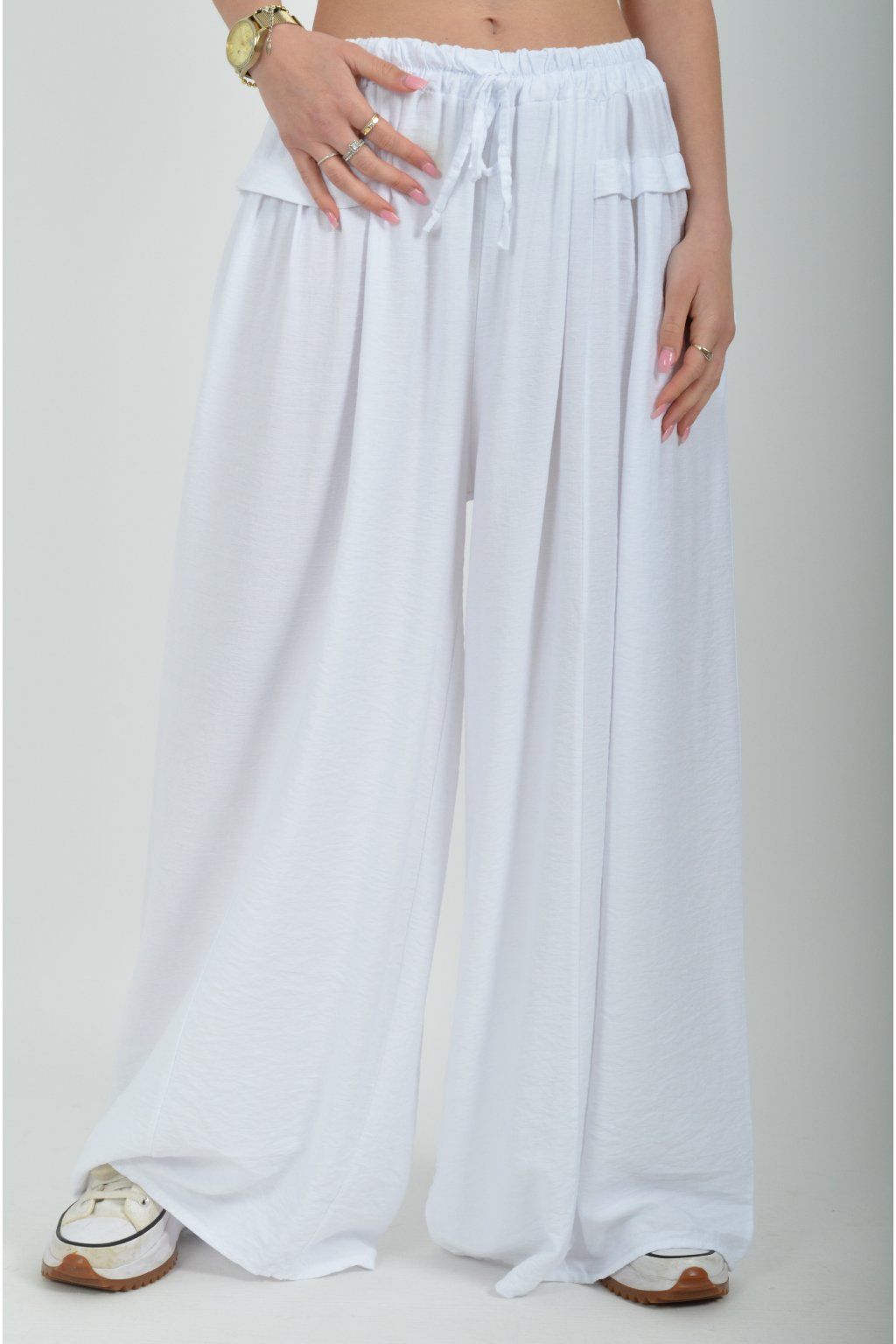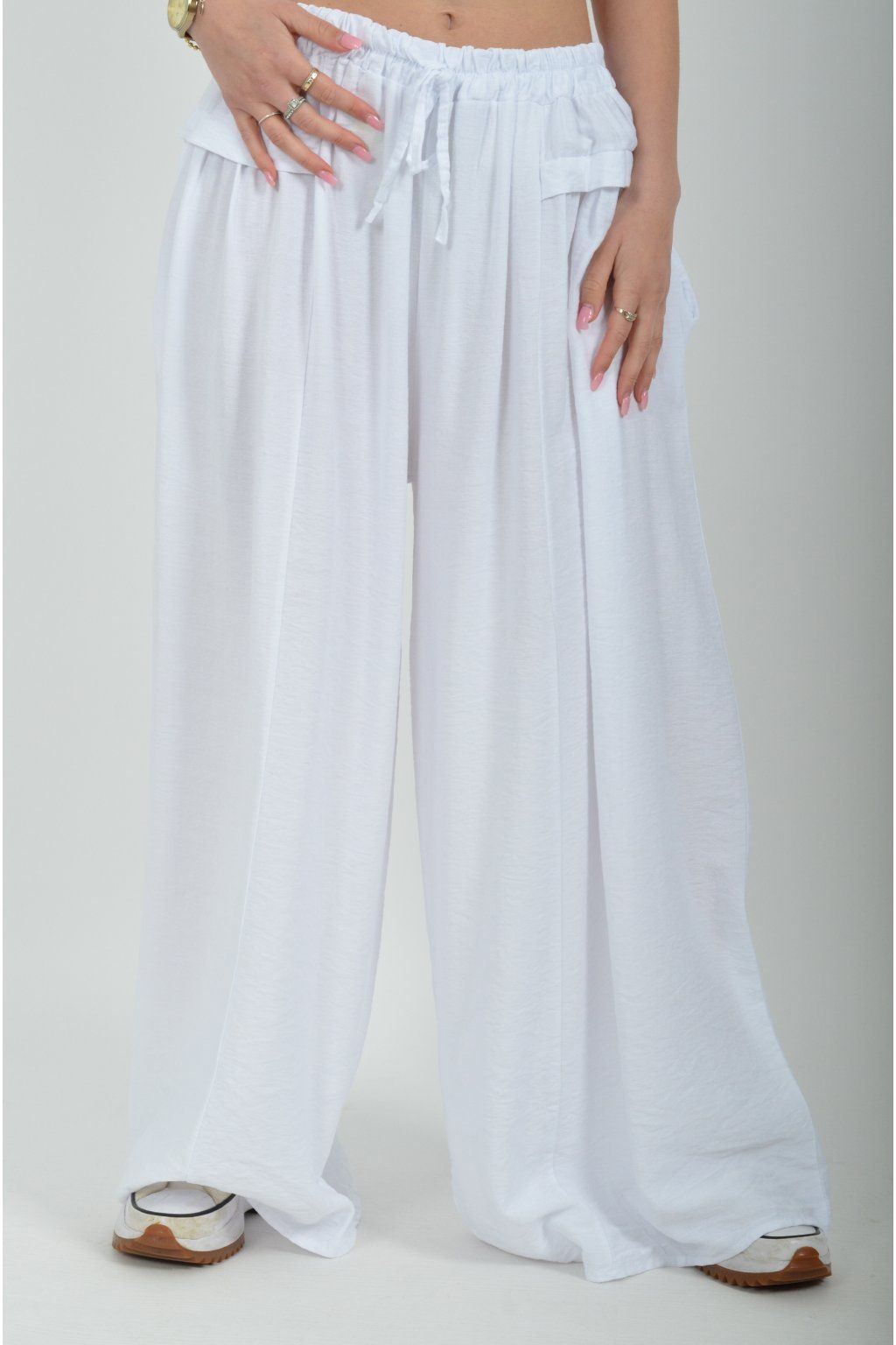 Kalhoty se širokými nohavicemi a kapsami na bocích, které se krásně přizpůsobí postavě, díky zapracované gumě v pase. Jsou vhodné pro každodenní nošení. Šňůrka, v přední části je "falešná" (nejde pomocí ní kalhoty stáhnout v pase)