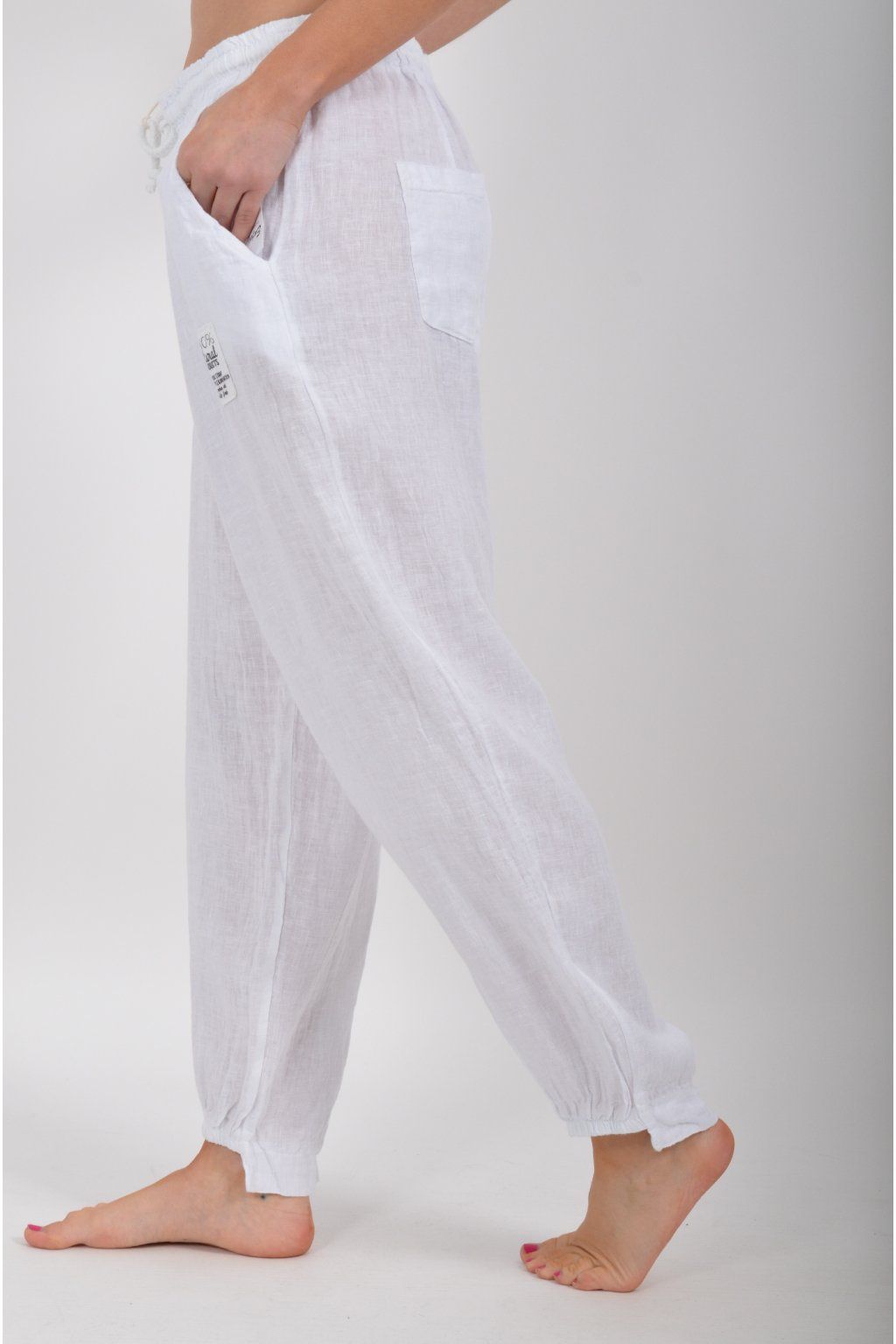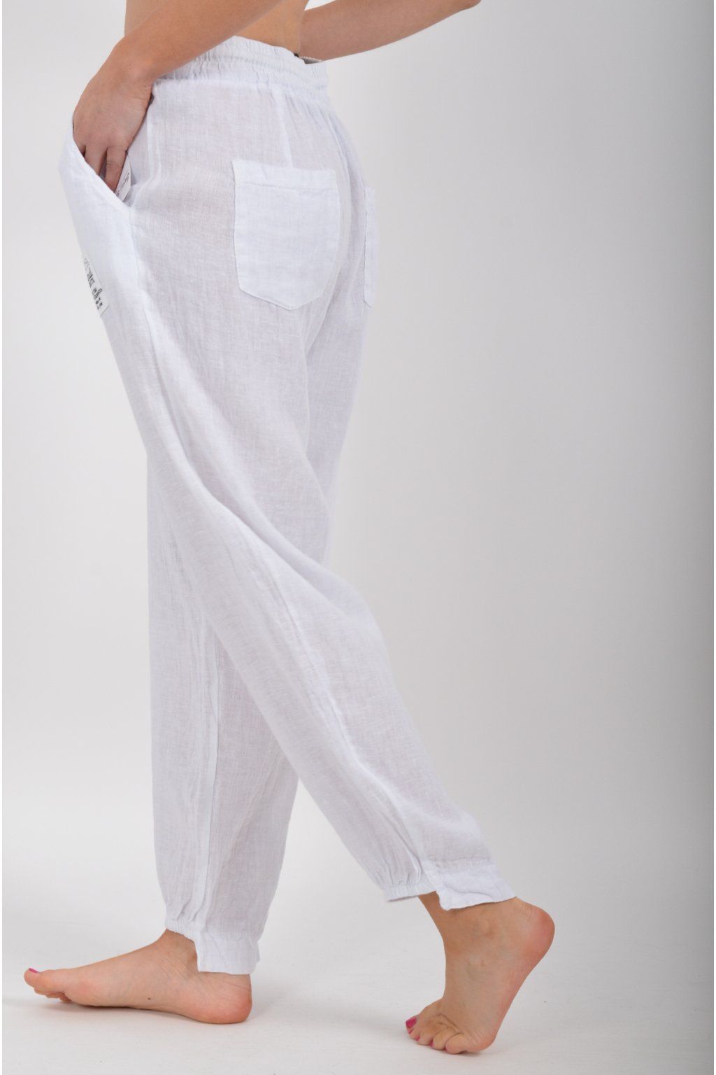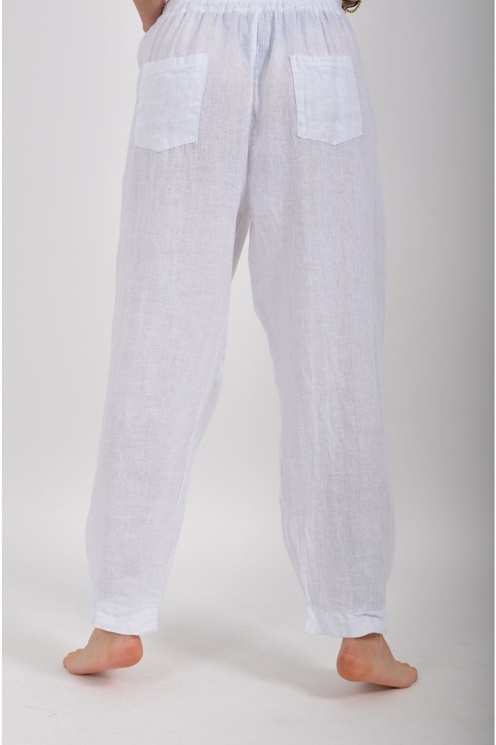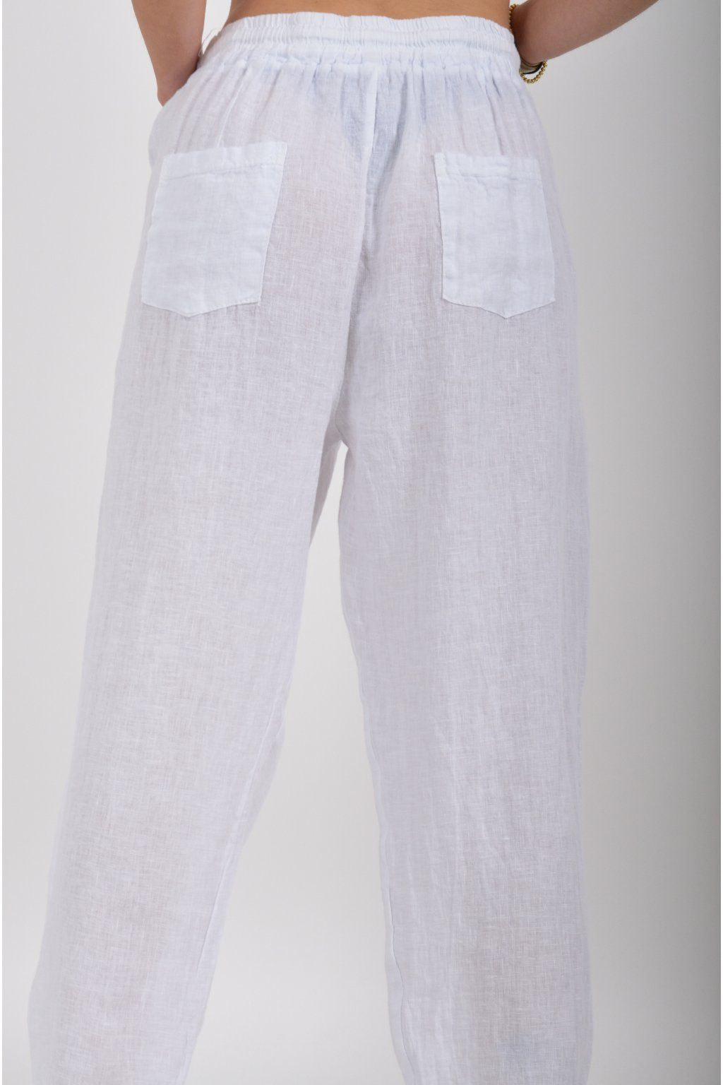 Lněné kalhoty s kapsami na bocích. Jsou vhodné pro každodenní nošení. V pase je zapracovaná guma a tkanice pro libovolné stažení.
