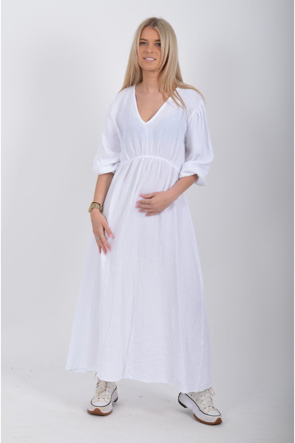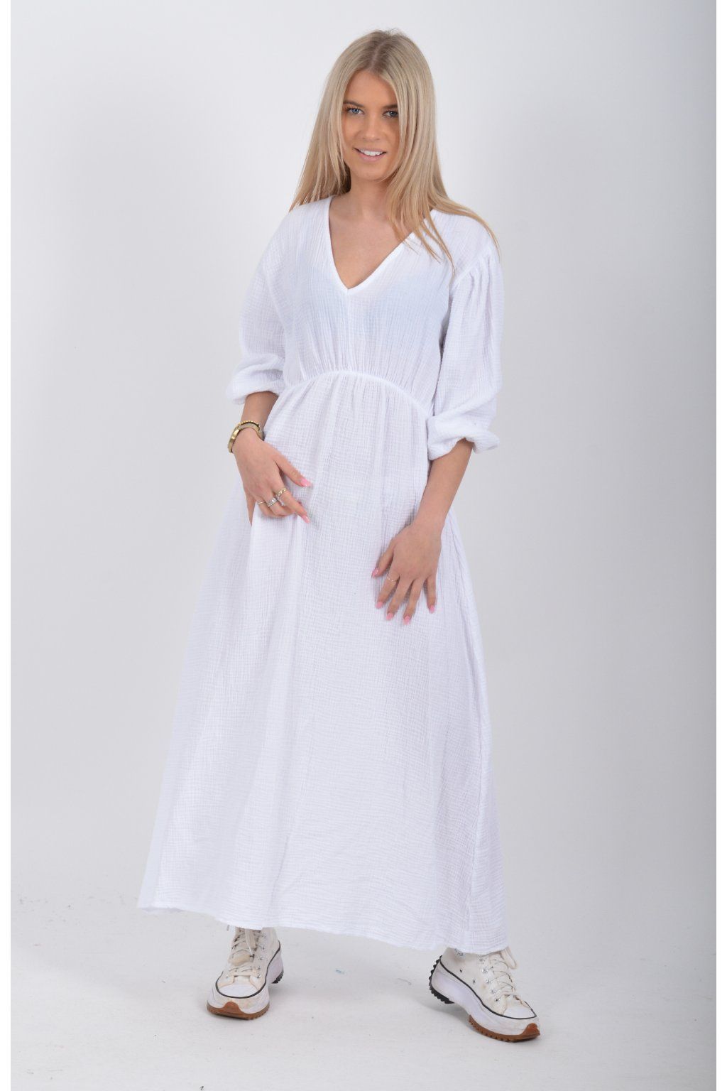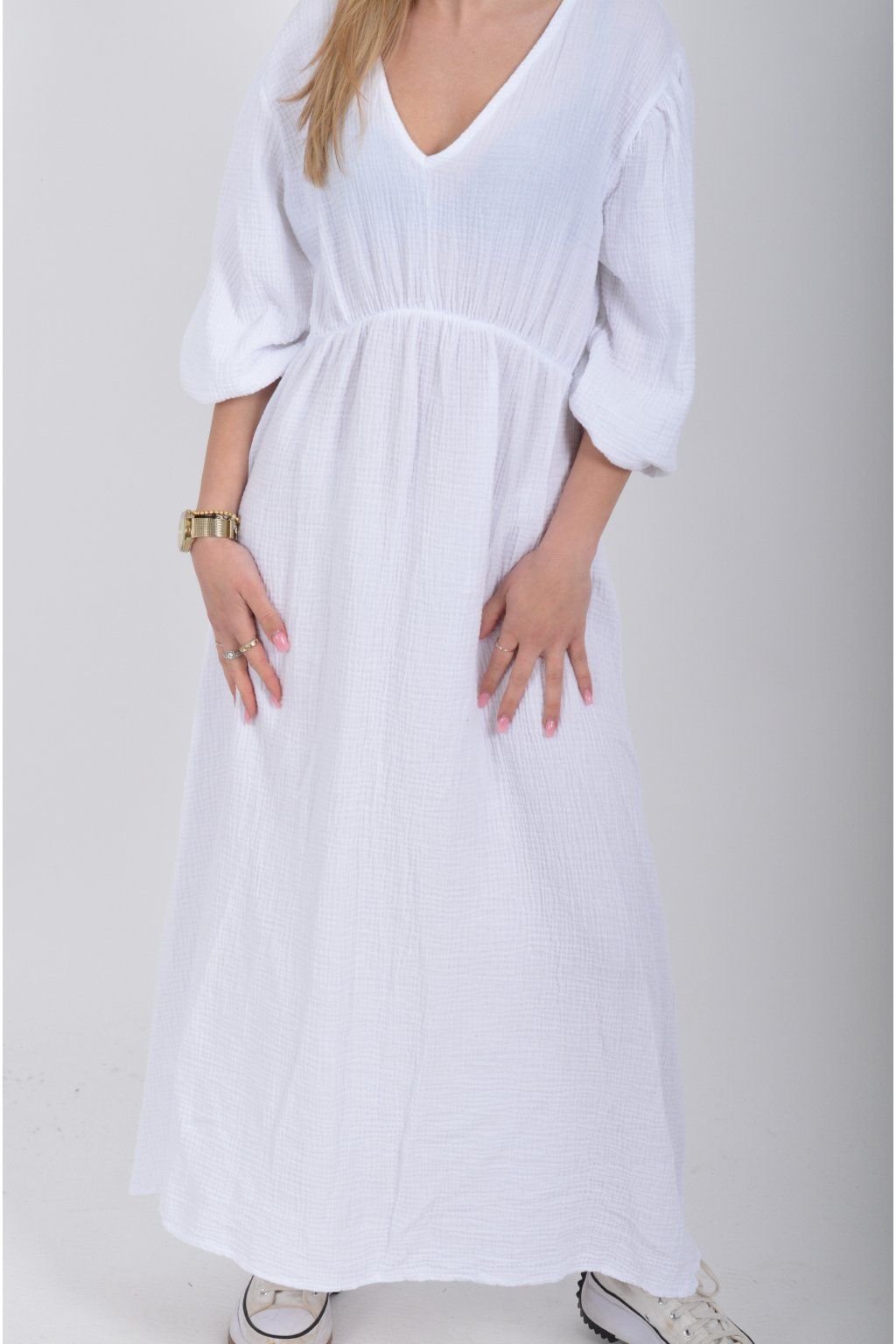 Maxi šaty vyrobené z velice příjemného mušelínu. Šaty mají áčkový střih, jsou střižené pod prsy, kde je také zapracovaná guma. V zadní části u krku mají vázání na tkaničku. Šaty mají tříčtvrteční rukáv zakončený zapracovanou gumou.