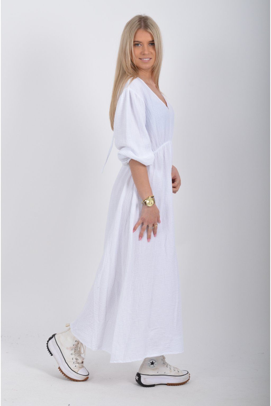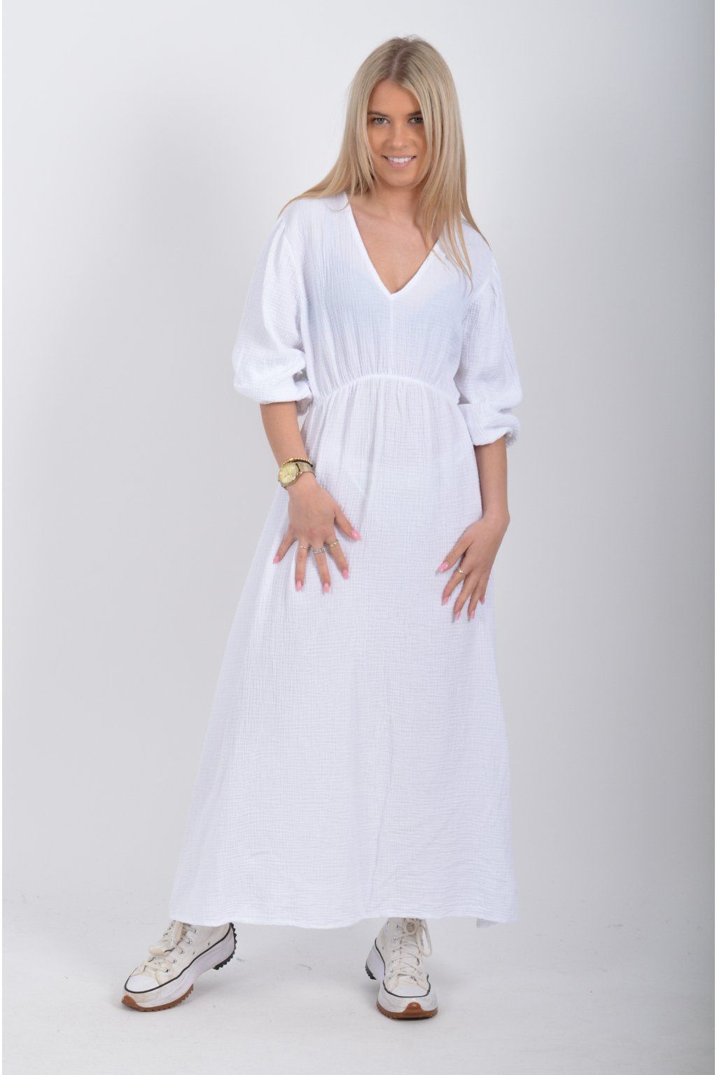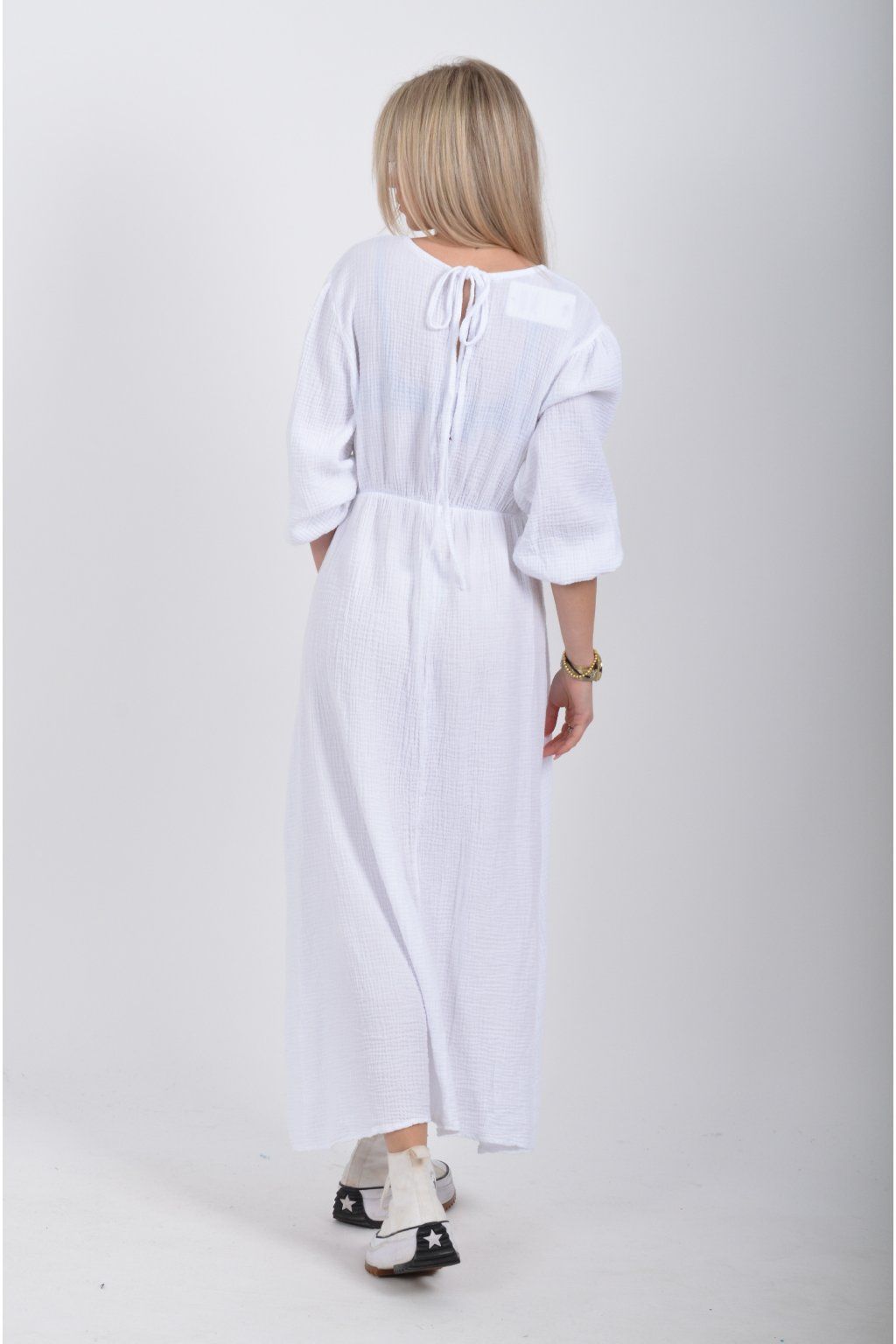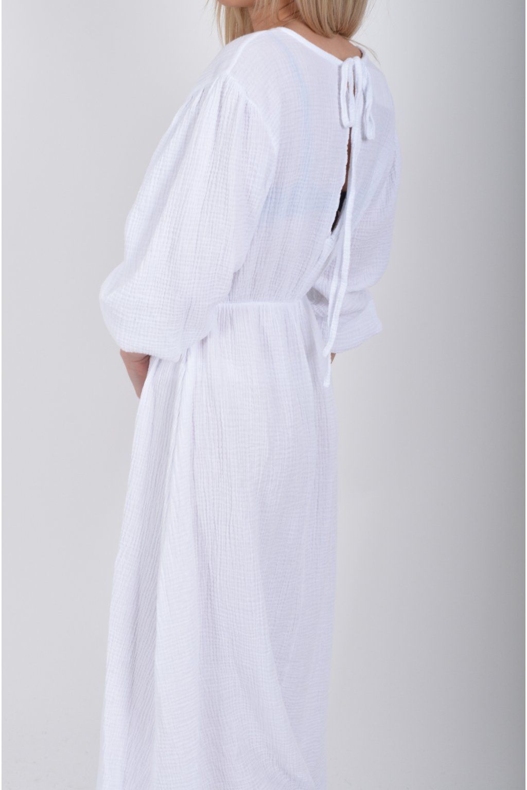 Maxi šaty vyrobené z velice příjemného mušelínu. Šaty mají áčkový střih, jsou střižené pod prsy, kde je také zapracovaná guma. V zadní části u krku mají vázání na tkaničku. Šaty mají tříčtvrteční rukáv zakončený zapracovanou gumou.
