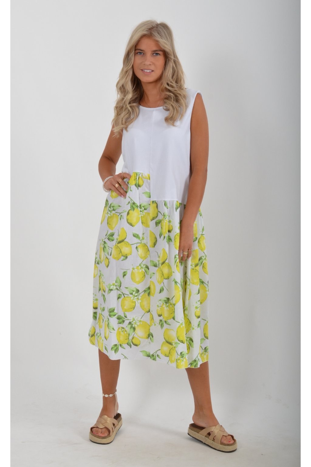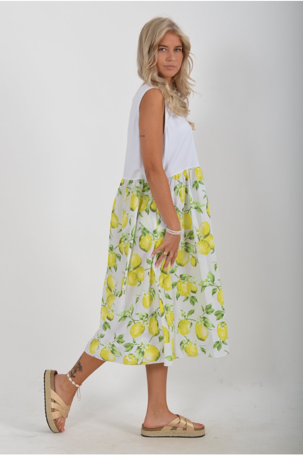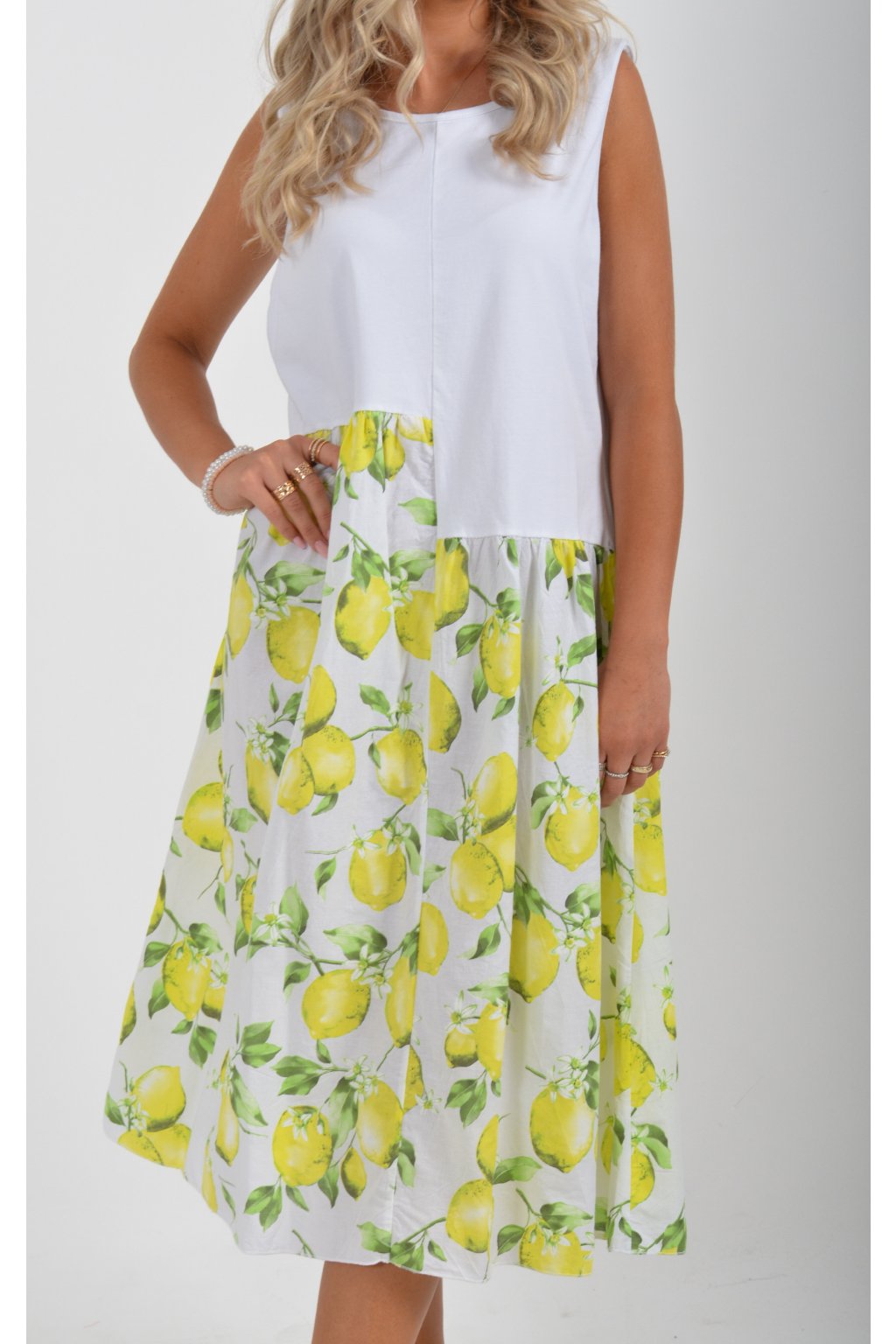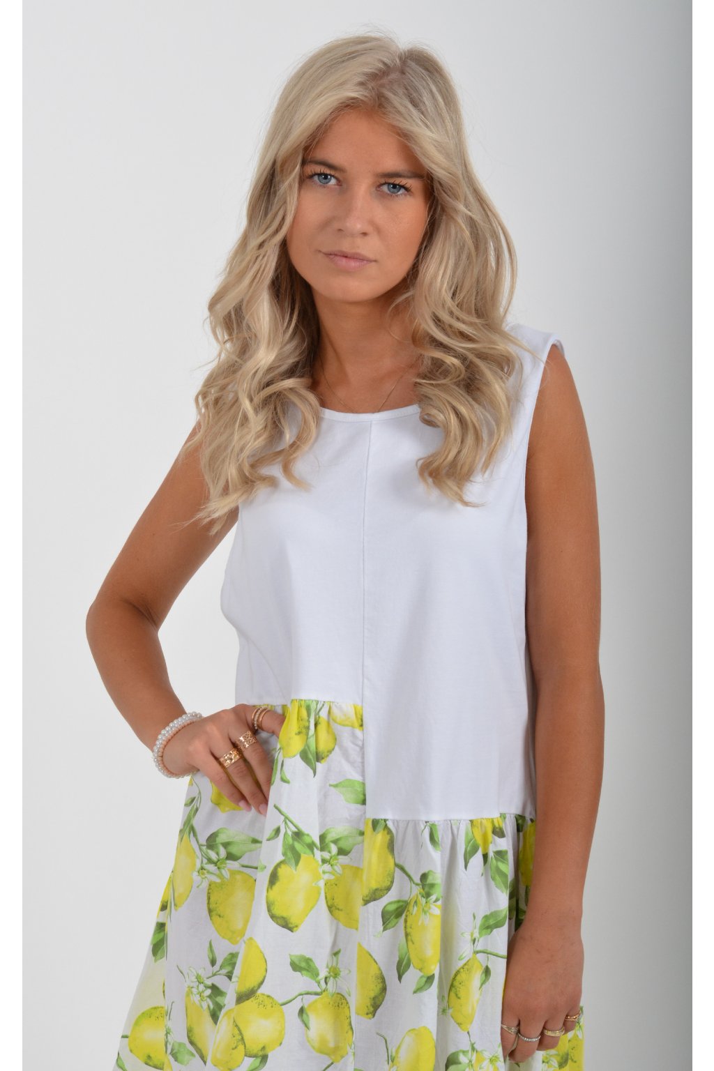 Bavlněné šaty s citronkovým potiskem, krátkým rukávem a áčkovým střihem. Šaty jsou vyrobené z velice příjemné a tenké bavlny, na bocích mají kapsy a jsou vhodné na každodenní letní nošení.