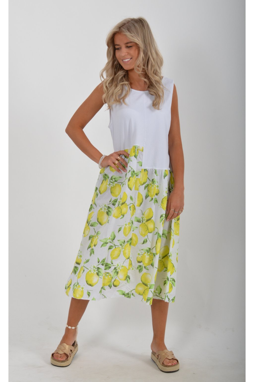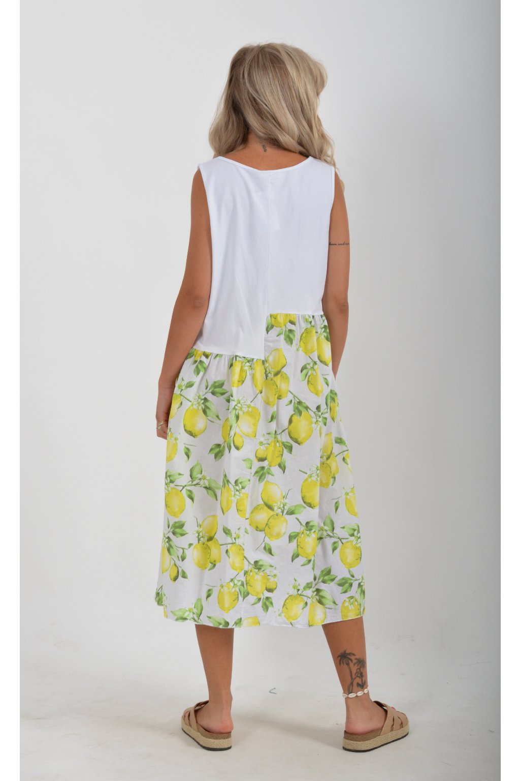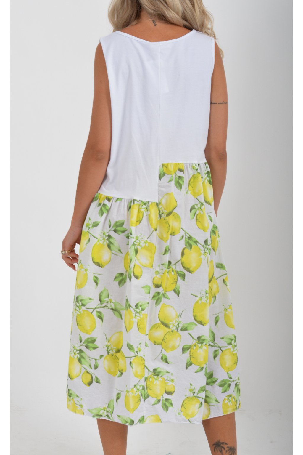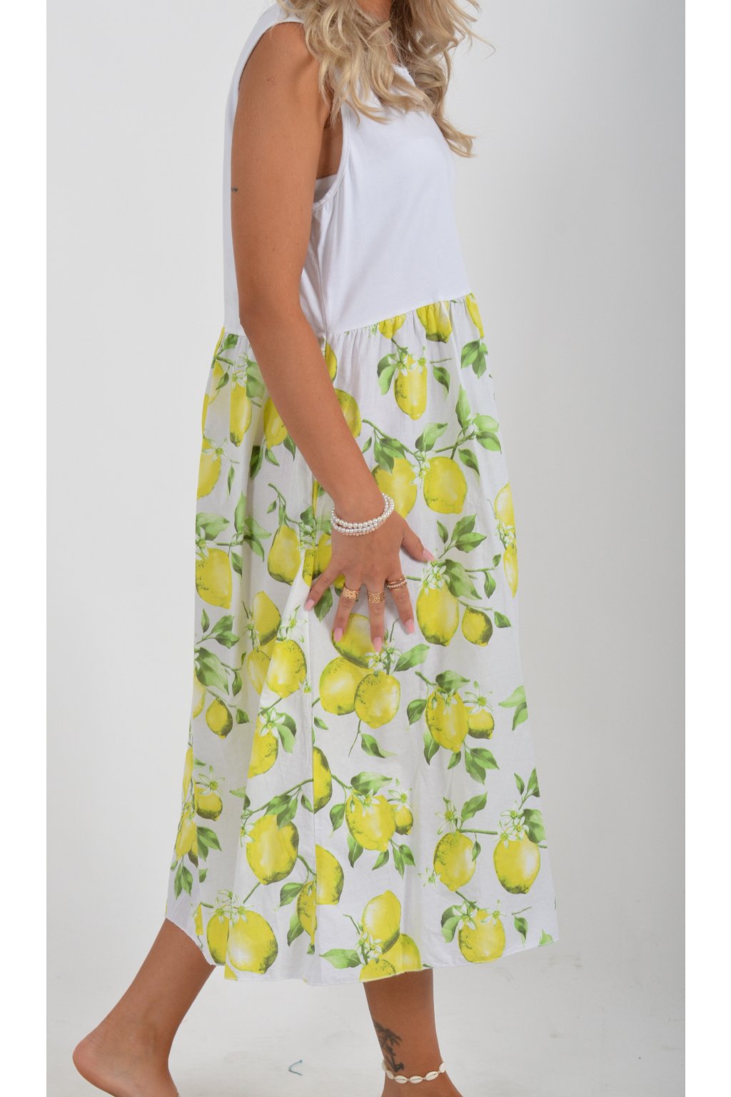 Bavlněné šaty s citronkovým potiskem, krátkým rukávem a áčkovým střihem. Šaty jsou vyrobené z velice příjemné a tenké bavlny, na bocích mají kapsy a jsou vhodné na každodenní letní nošení.