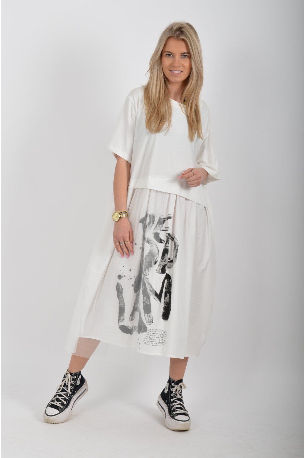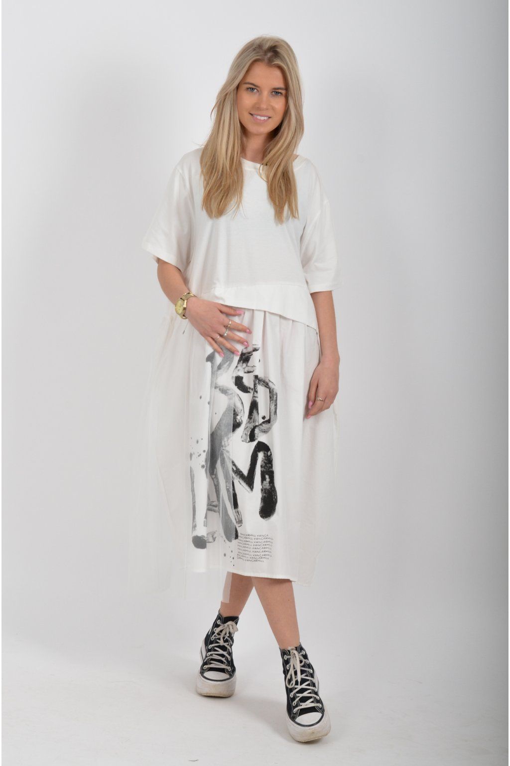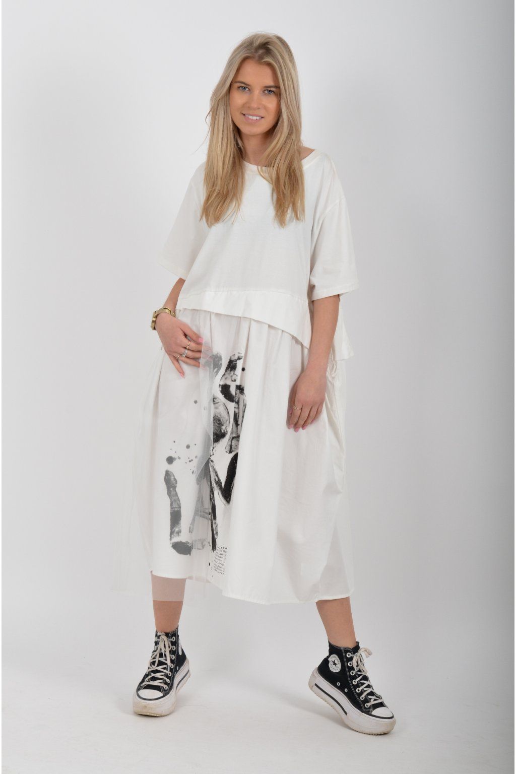 Atypické šaty balónového střihu s potiskem a kapsou na jednom boku. Spodní polovina šatiček je z plátěného materiálu.