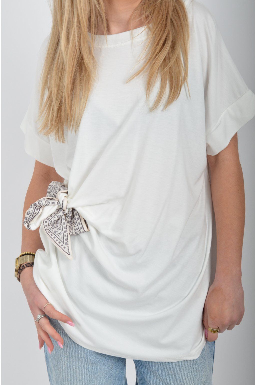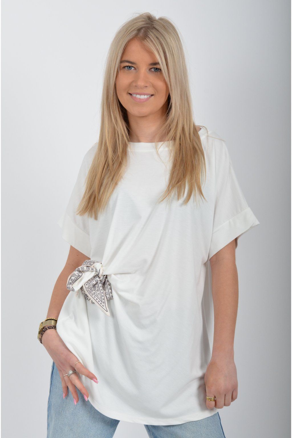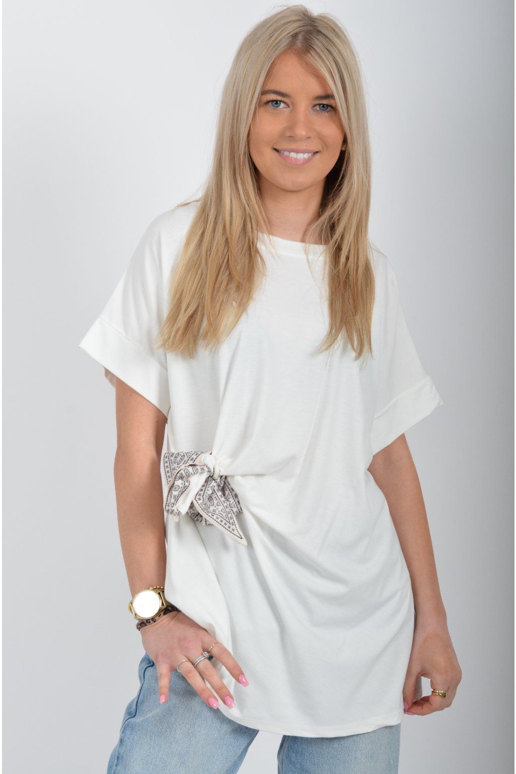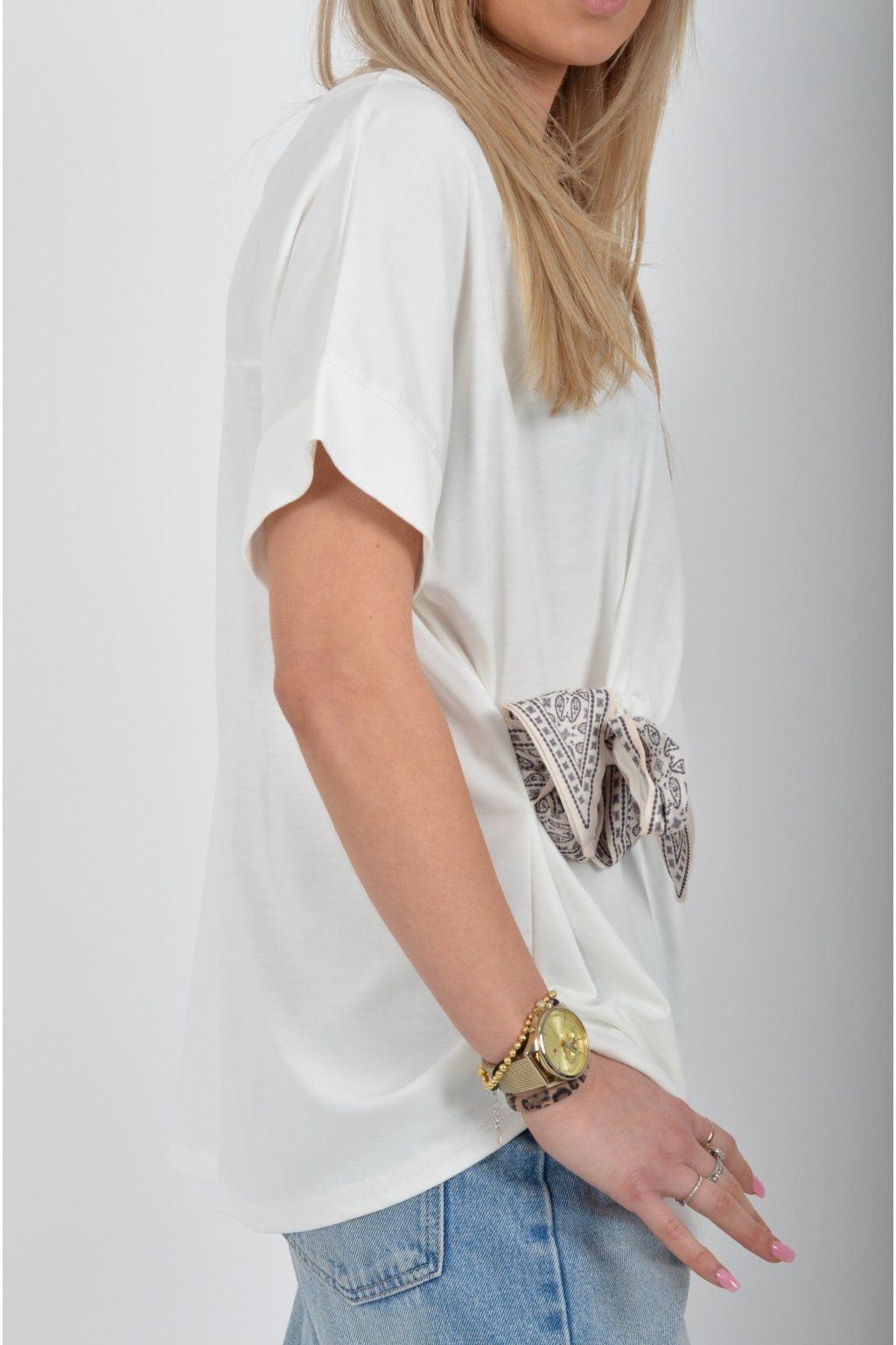 Tričko s krátkým rukávem a vázáním na boku vyrobené z velice příjemného a elastické materiálu. Je ideální pro každodenní nošení.
