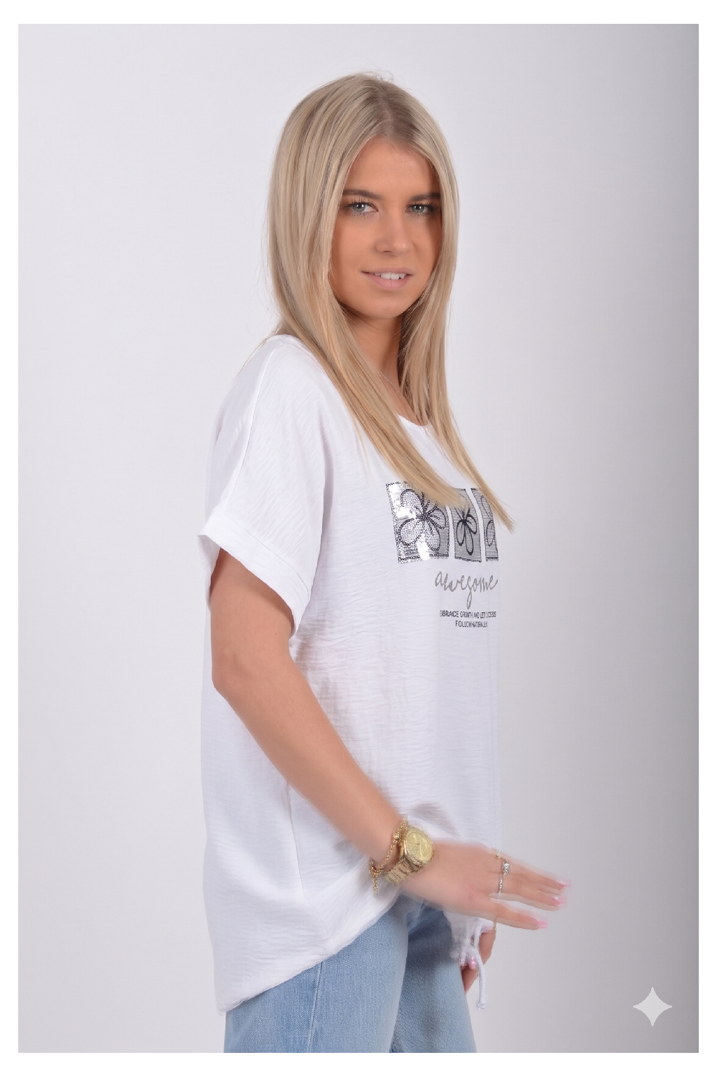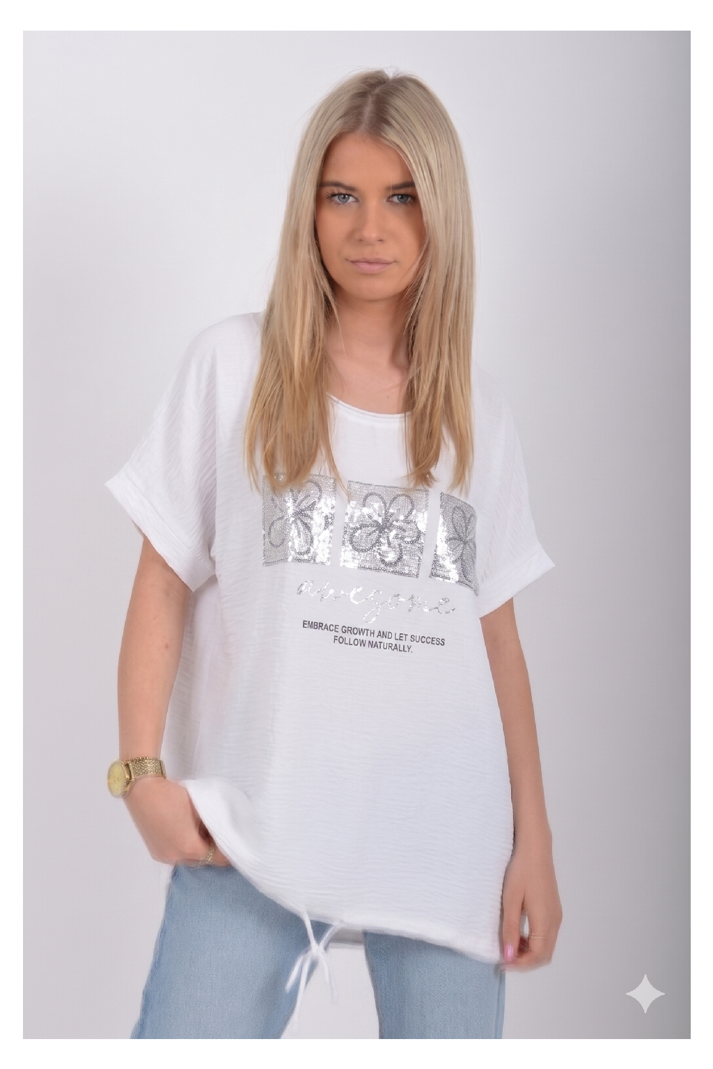 Tričko s krátkým rukávem potiskem a kamínkovým zdobením. Tričko je vyrobené z velice příjemného materiálu. Ve spodní části je zapracovaná tkanice pro libovolné stažení.