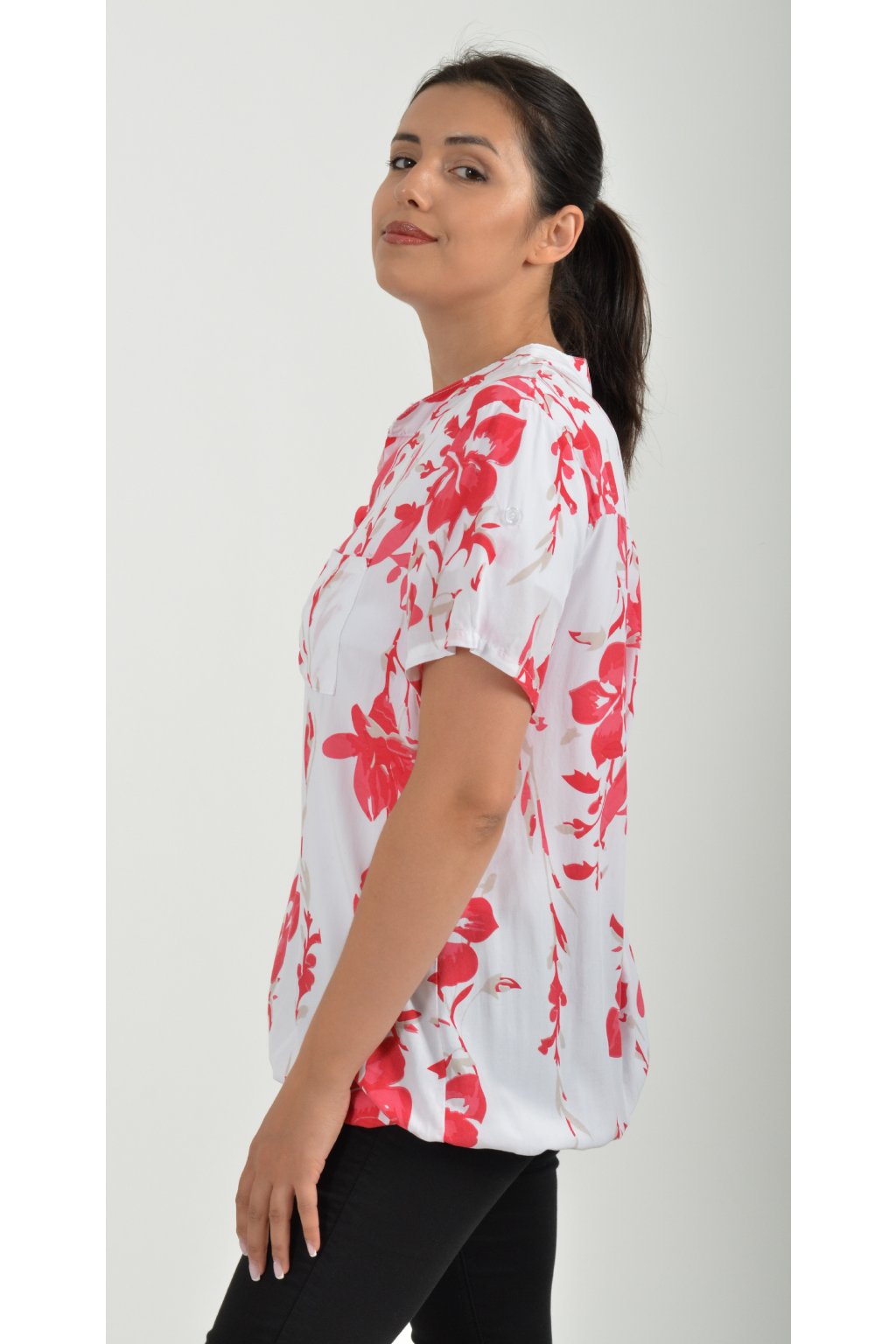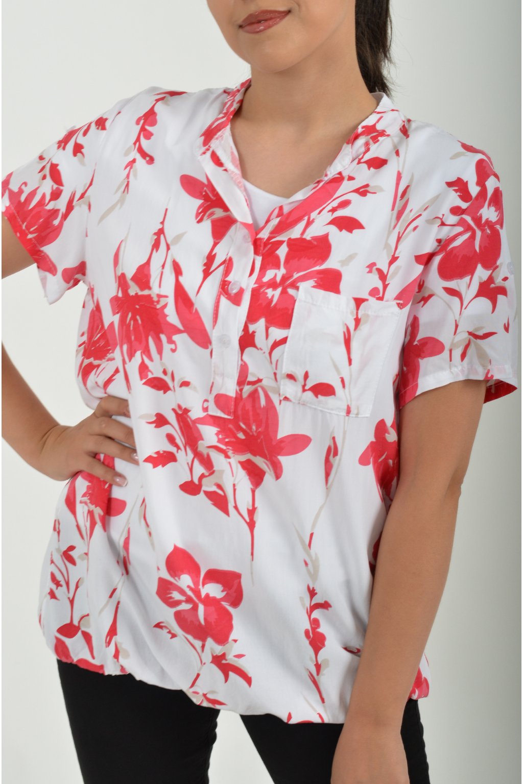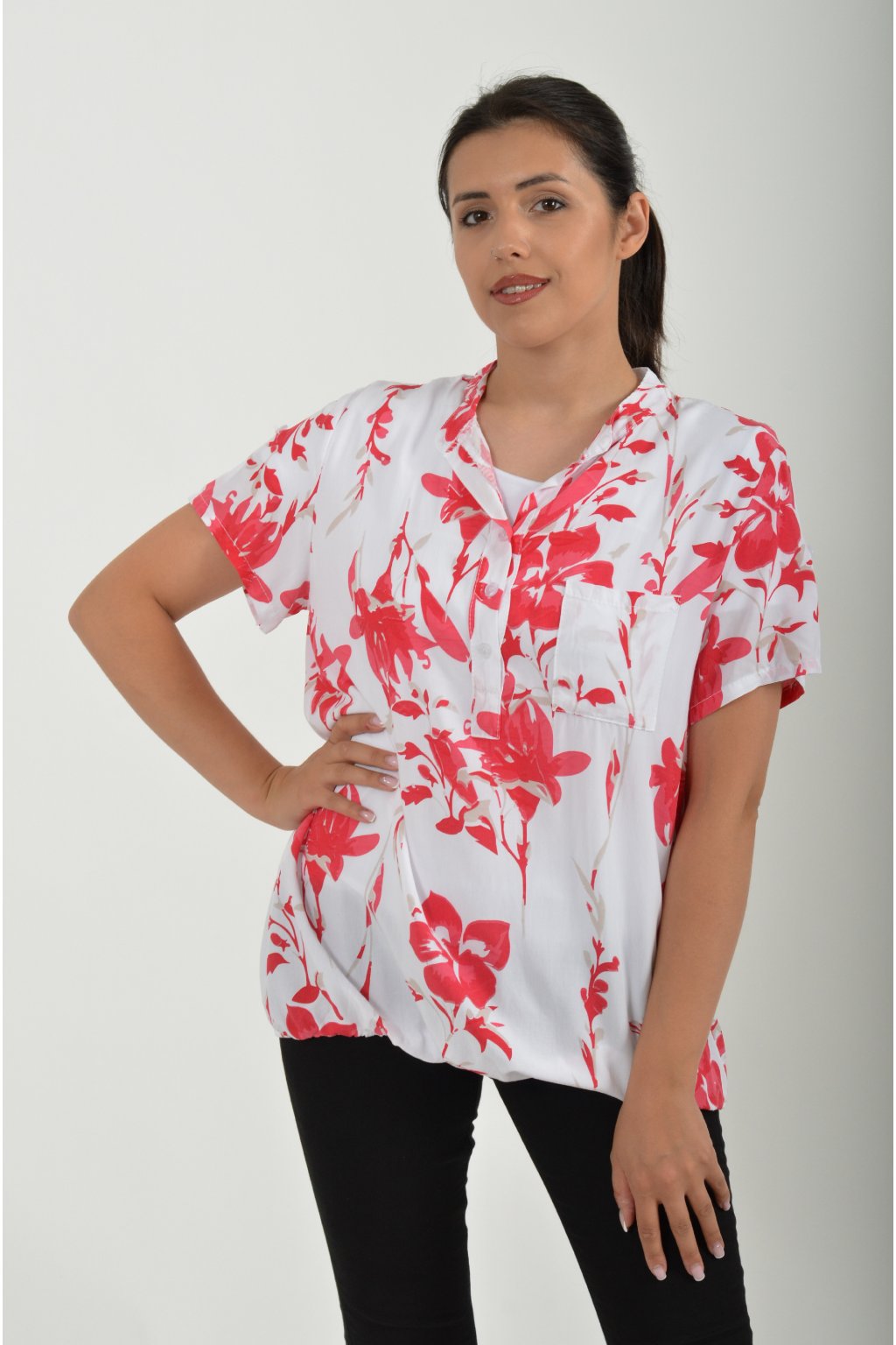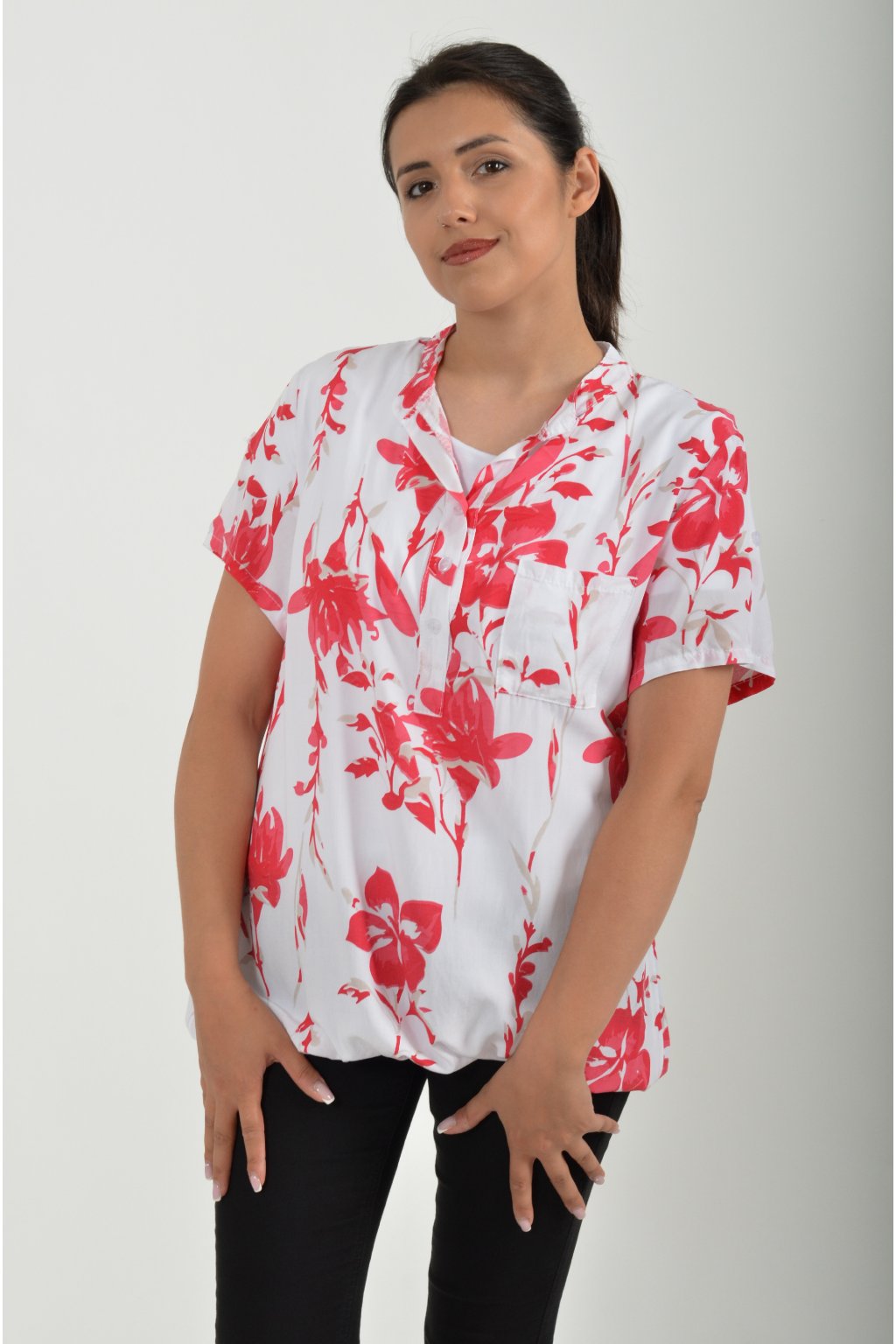 Vzorovaná halenka s krátkým rukávem a náprsní kapsou. Halenka má výstřih do V na 3 knoflíky. Je vyrobena z velice příjemného a vzdušného materiálu. Spodní část halenky je do gumy, lze tedy jednoduše podkasat.