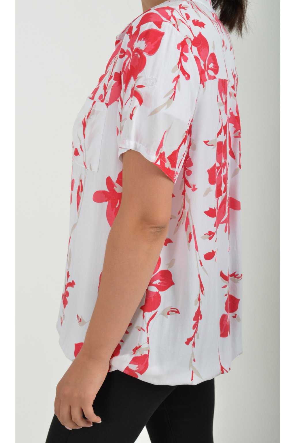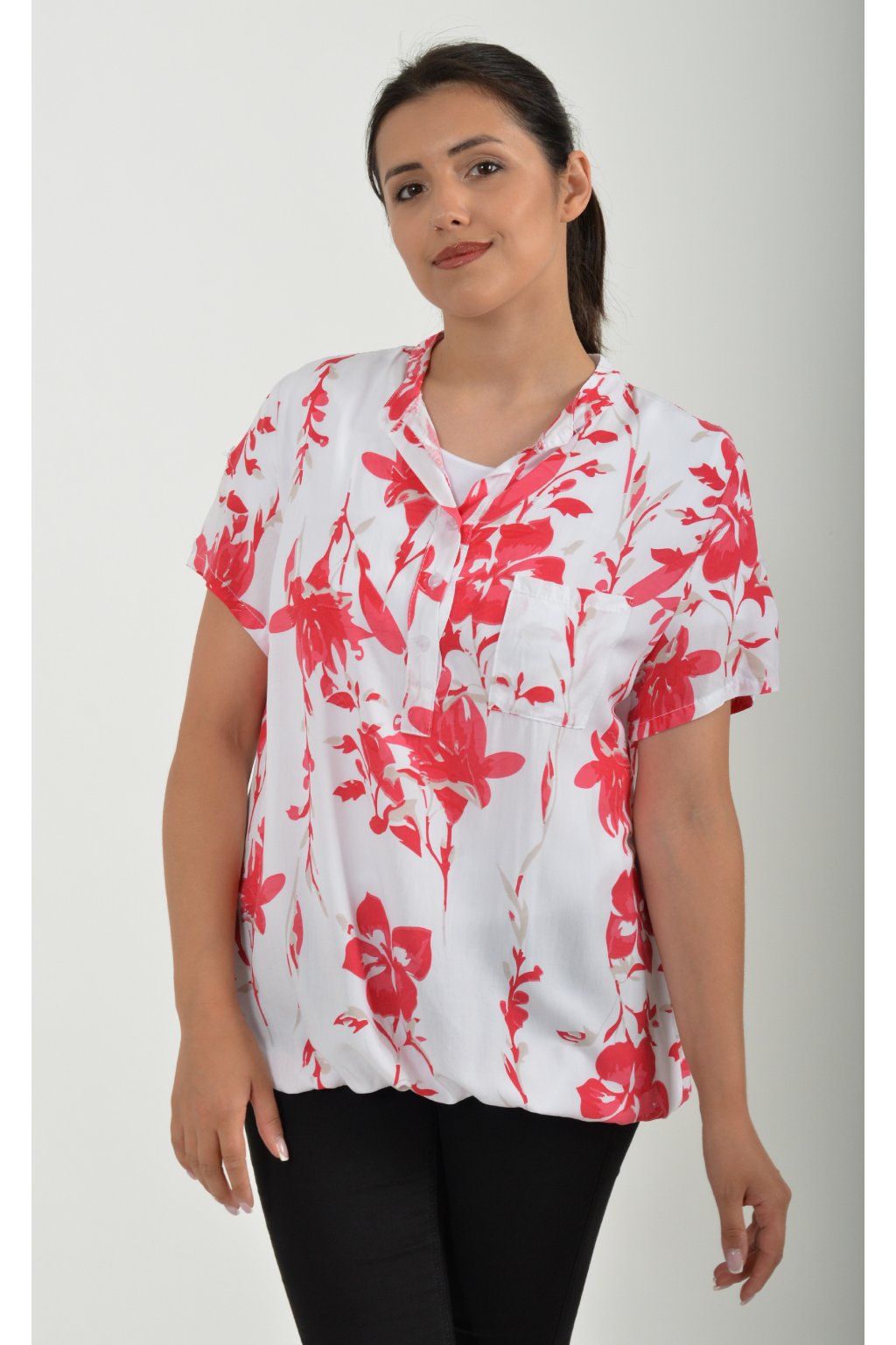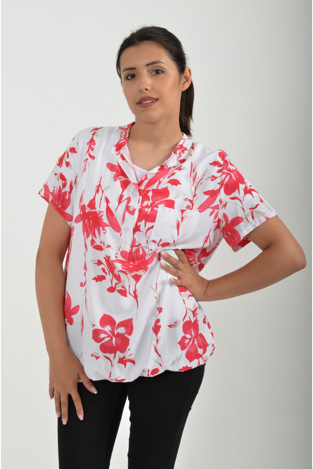 Vzorovaná halenka s krátkým rukávem a náprsní kapsou. Halenka má výstřih do V na 3 knoflíky. Je vyrobena z velice příjemného a vzdušného materiálu. Spodní část halenky je do gumy, lze tedy jednoduše podkasat.