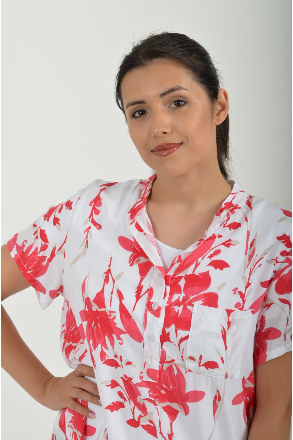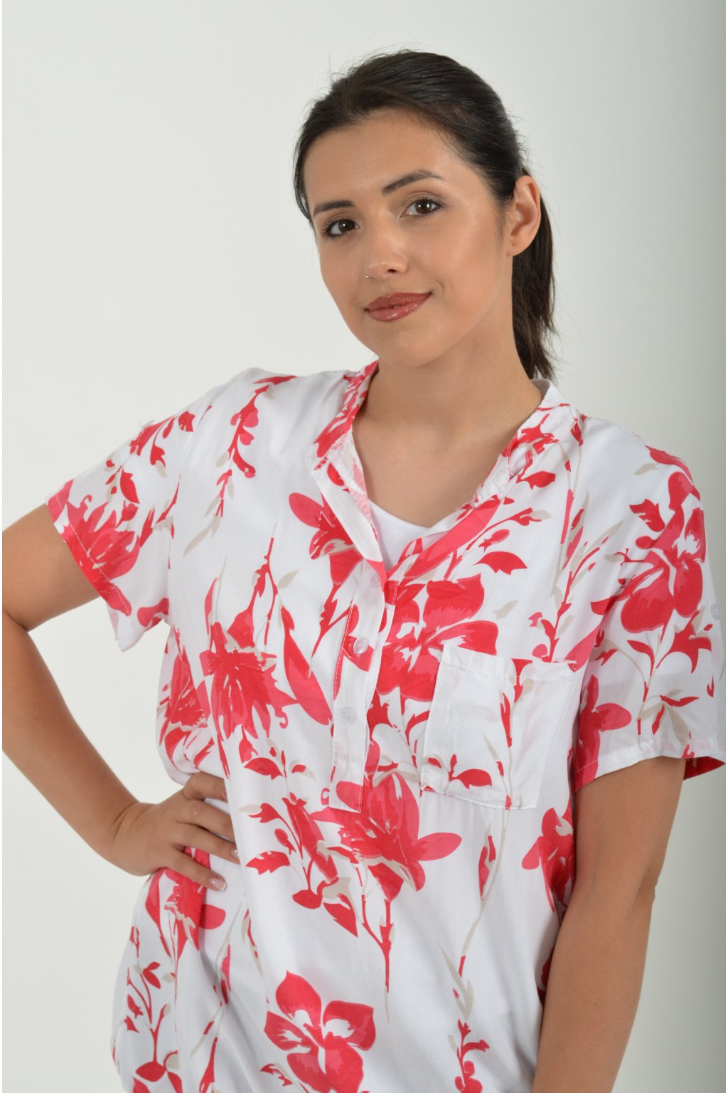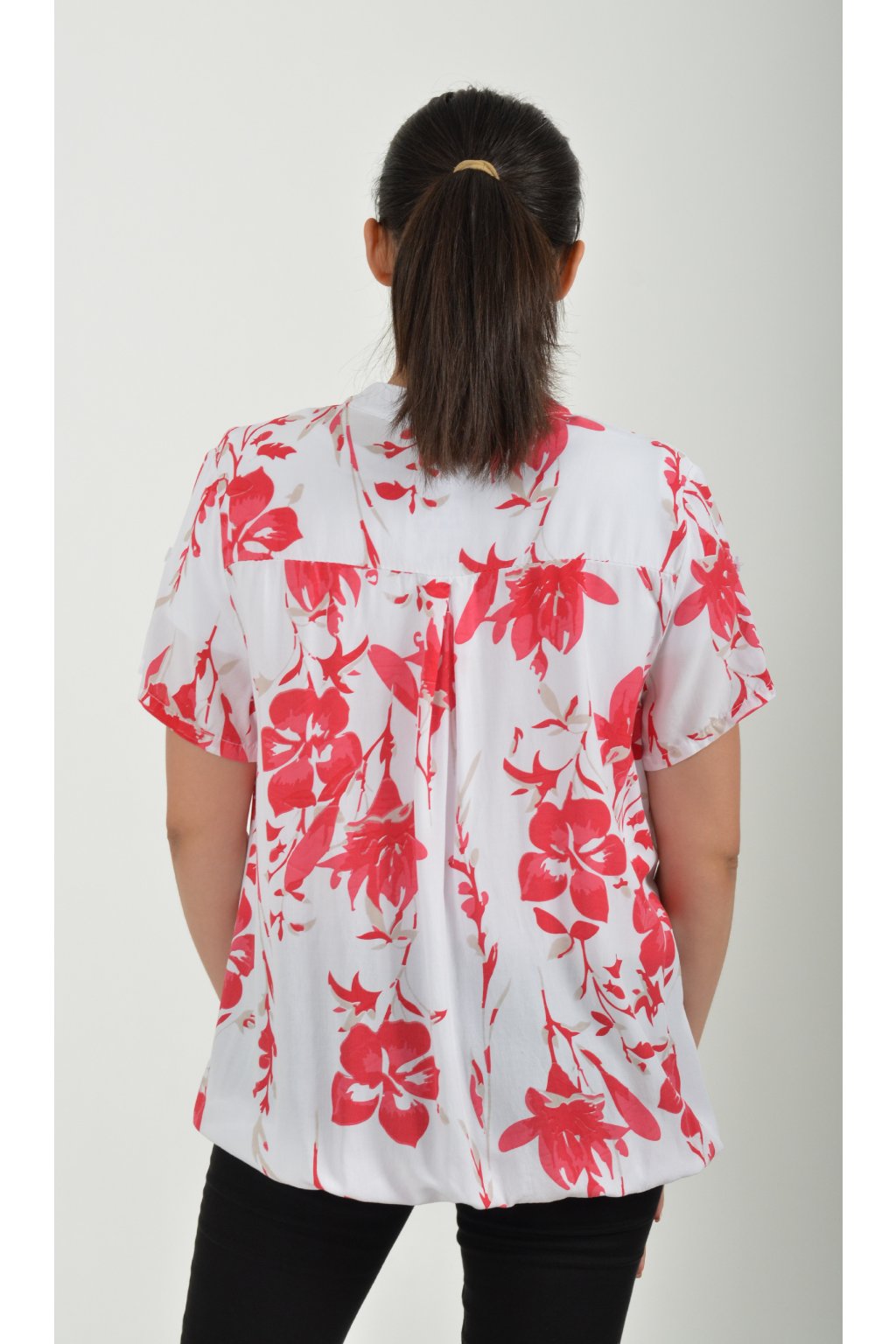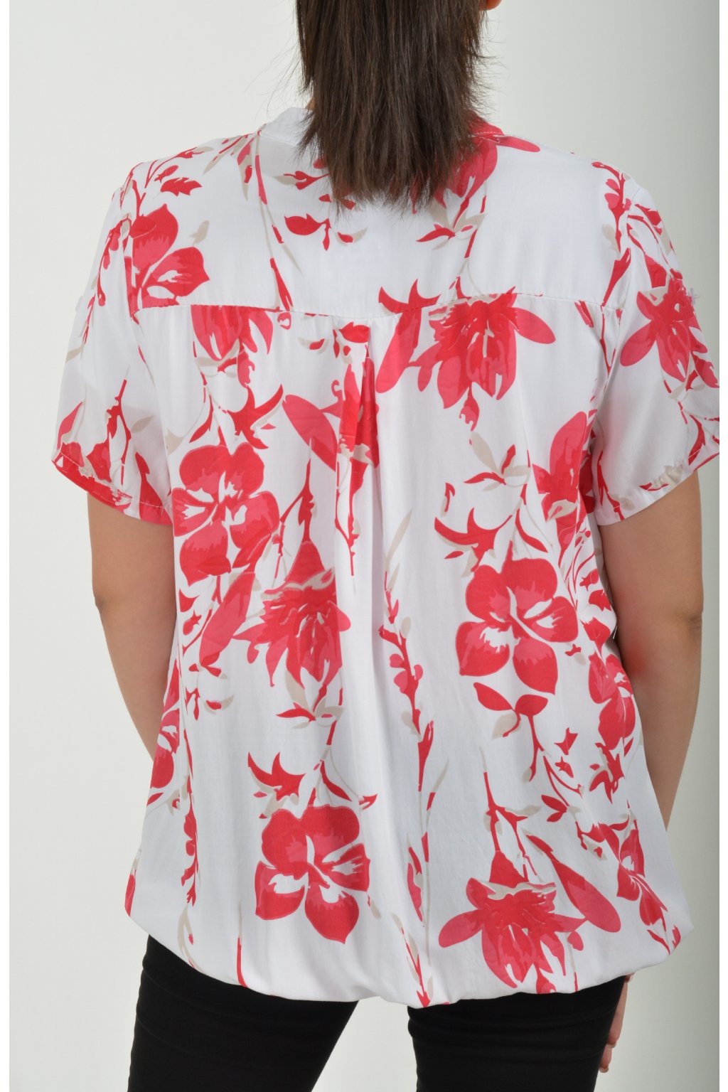 Vzorovaná halenka s krátkým rukávem a náprsní kapsou. Halenka má výstřih do V na 3 knoflíky. Je vyrobena z velice příjemného a vzdušného materiálu. Spodní část halenky je do gumy, lze tedy jednoduše podkasat.