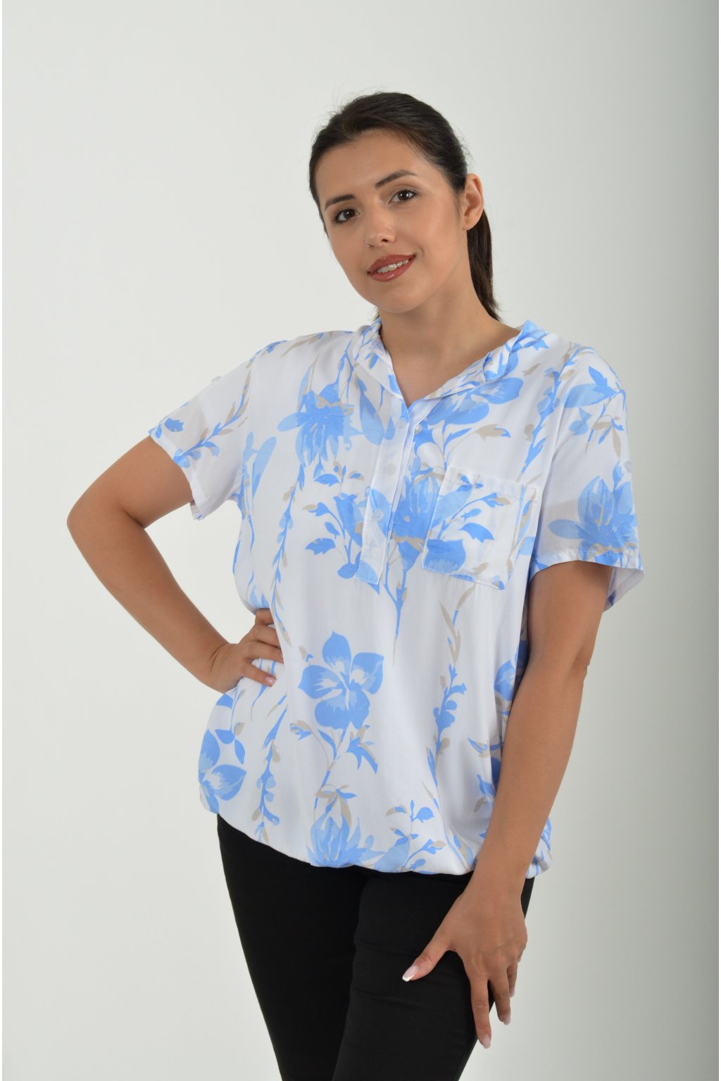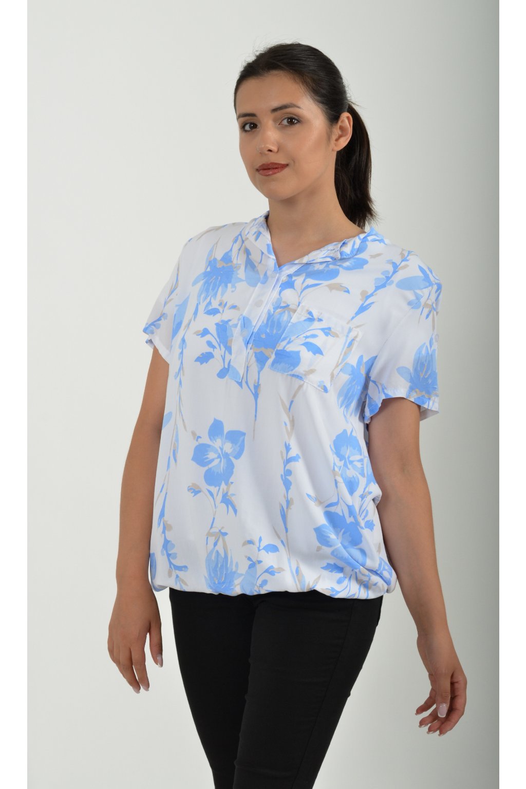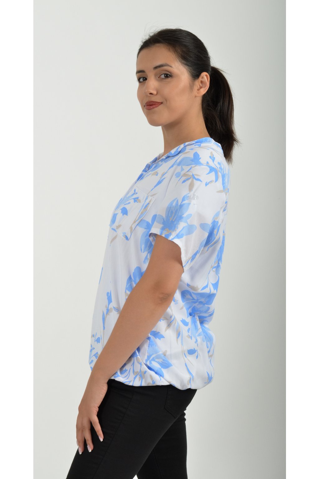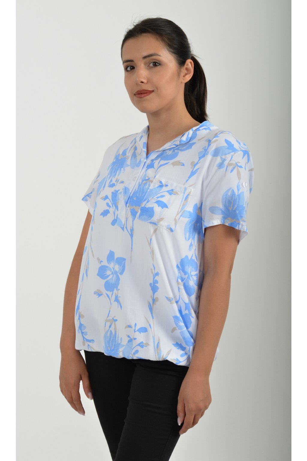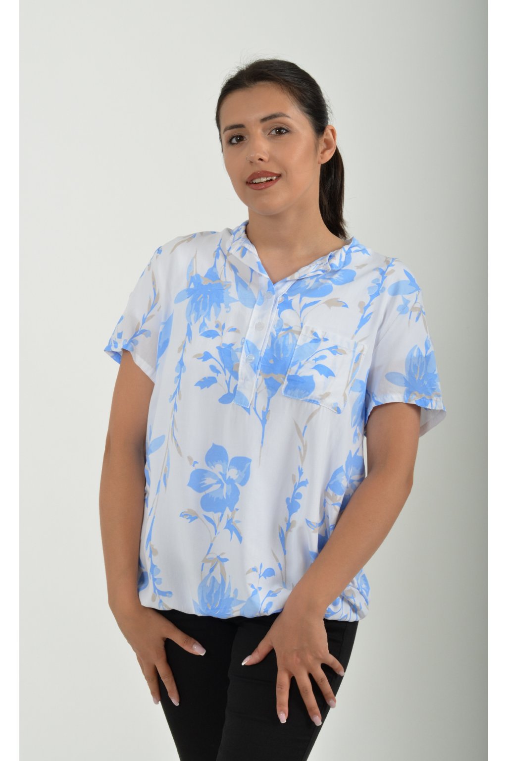 Vzorovaná halenka s krátkým rukávem a náprsní kapsou. Halenka má výstřih do V na 3 knoflíky. Je vyrobena z velice příjemného a vzdušného materiálu. Spodní část halenky je do gumy, lze tedy jednoduše podkasat.