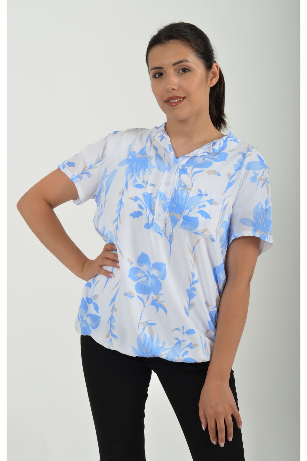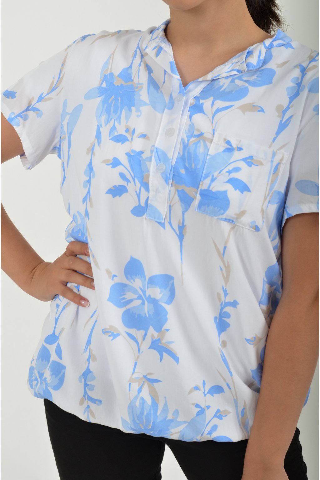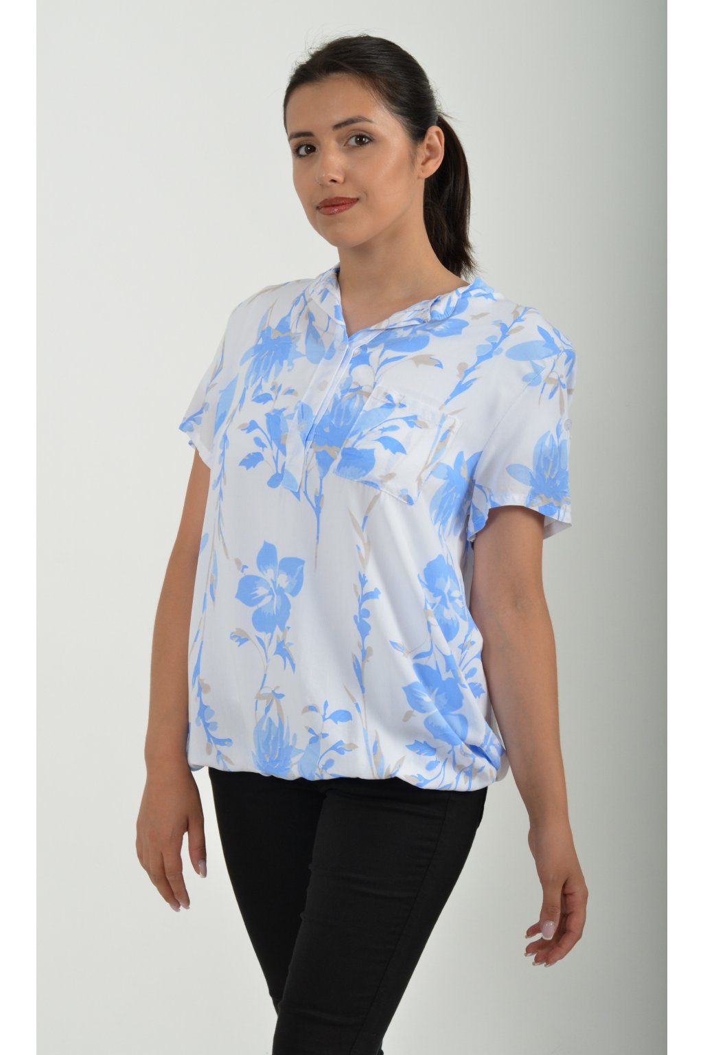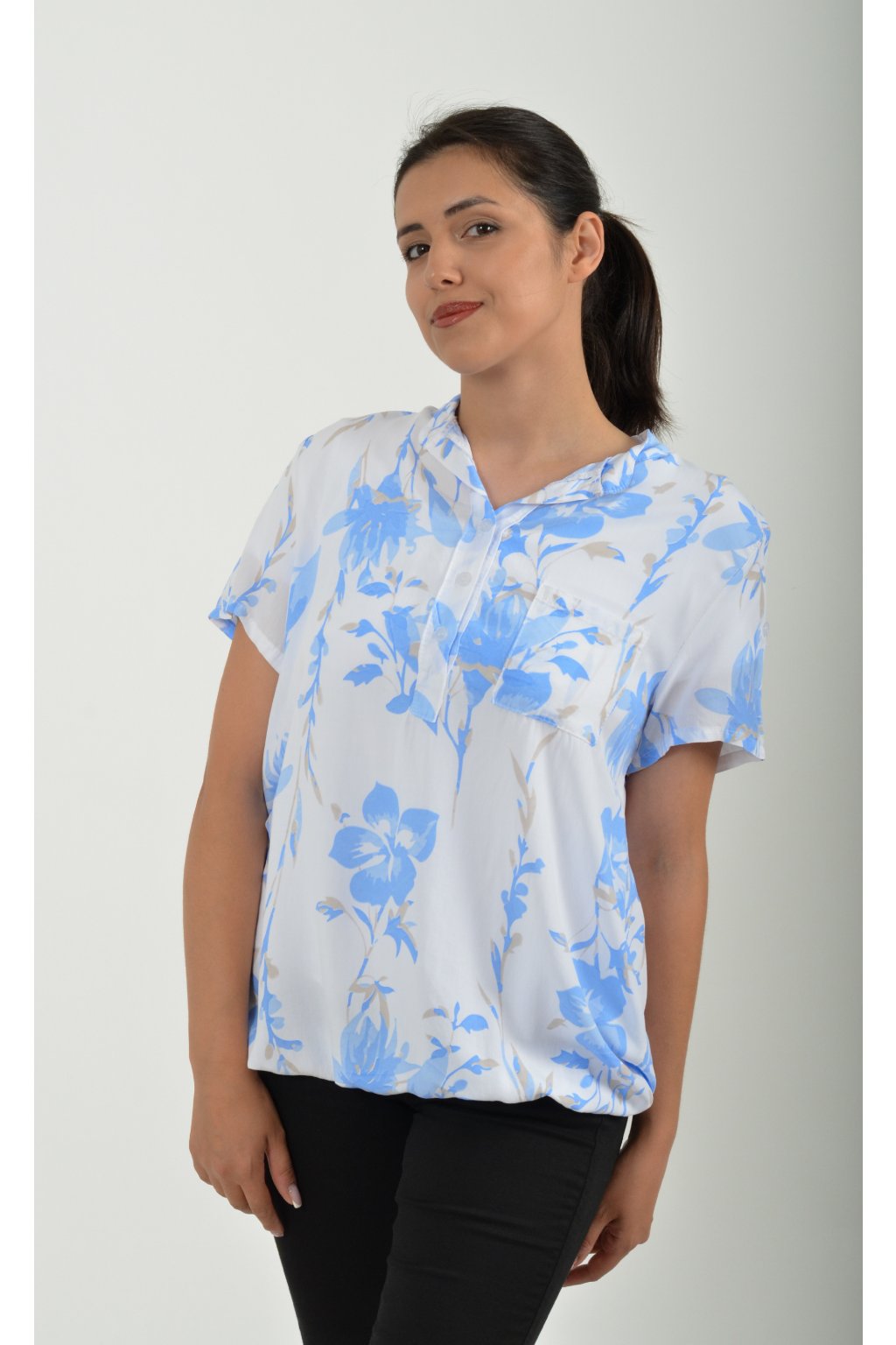 Vzorovaná halenka s krátkým rukávem a náprsní kapsou. Halenka má výstřih do V na 3 knoflíky. Je vyrobena z velice příjemného a vzdušného materiálu. Spodní část halenky je do gumy, lze tedy jednoduše podkasat.