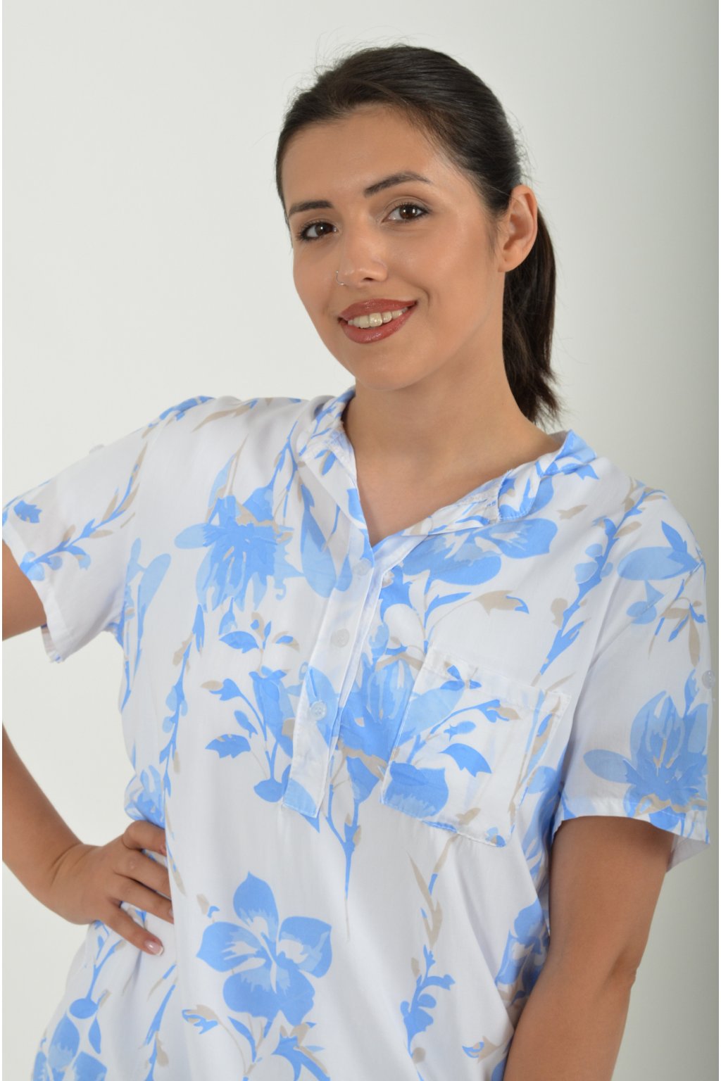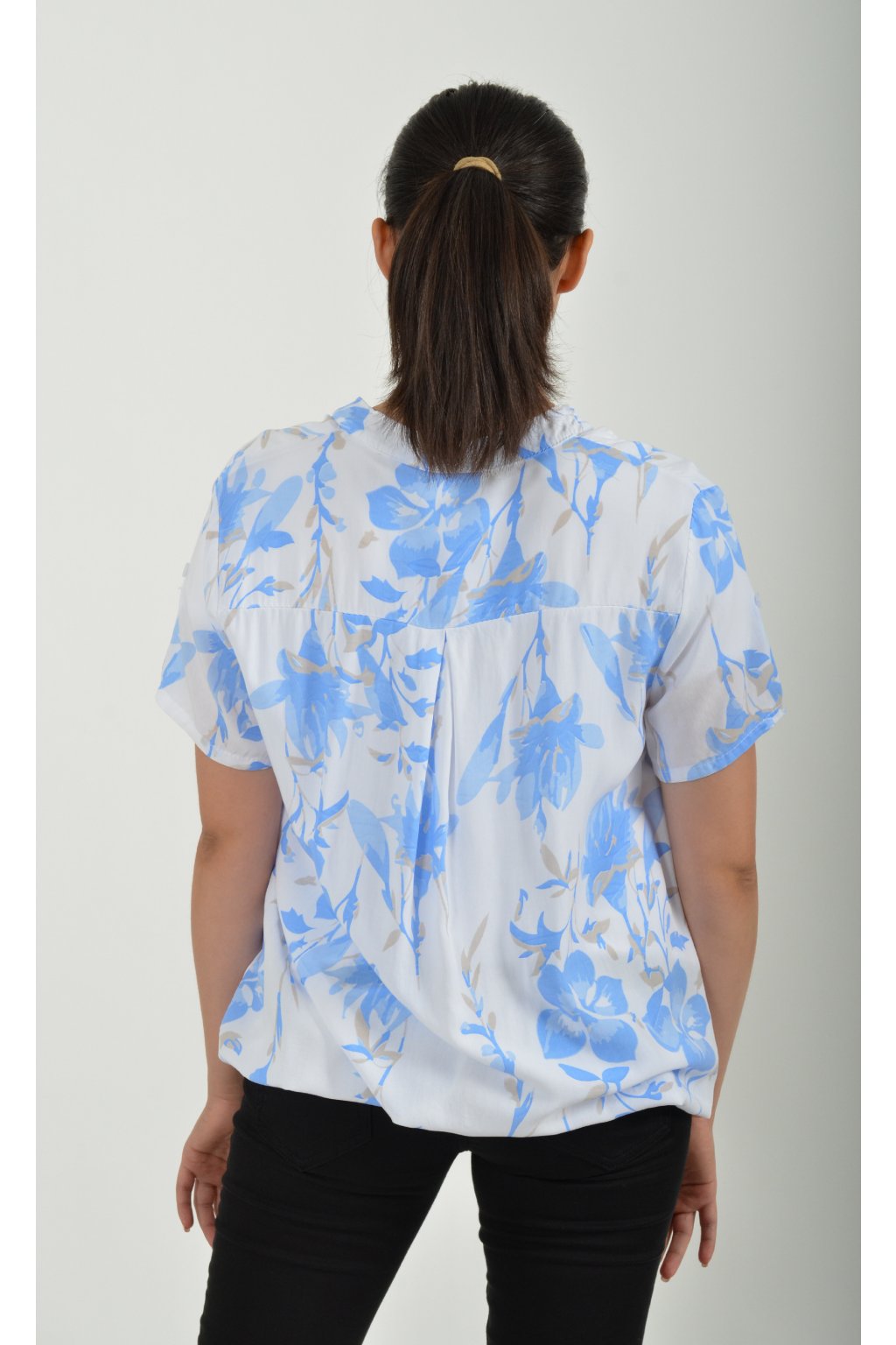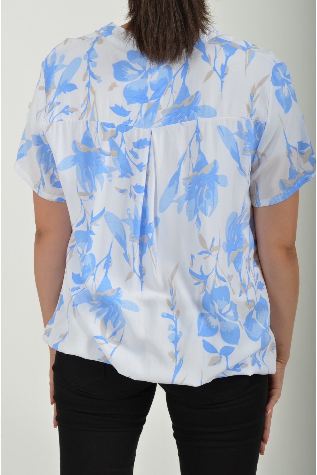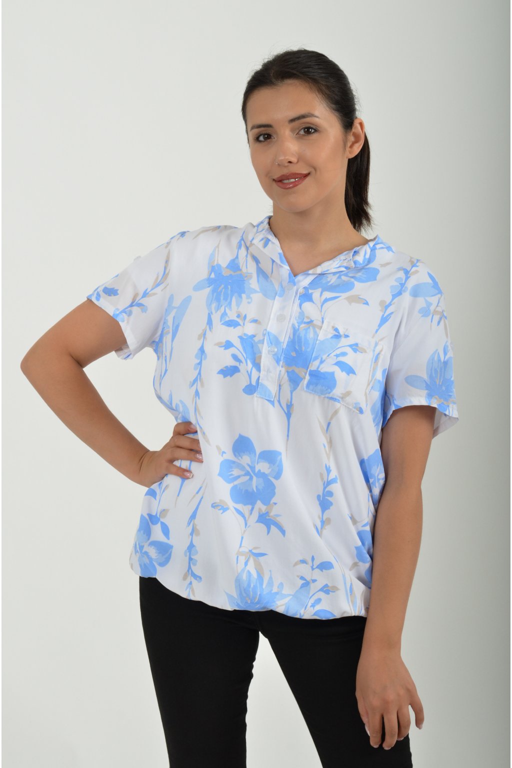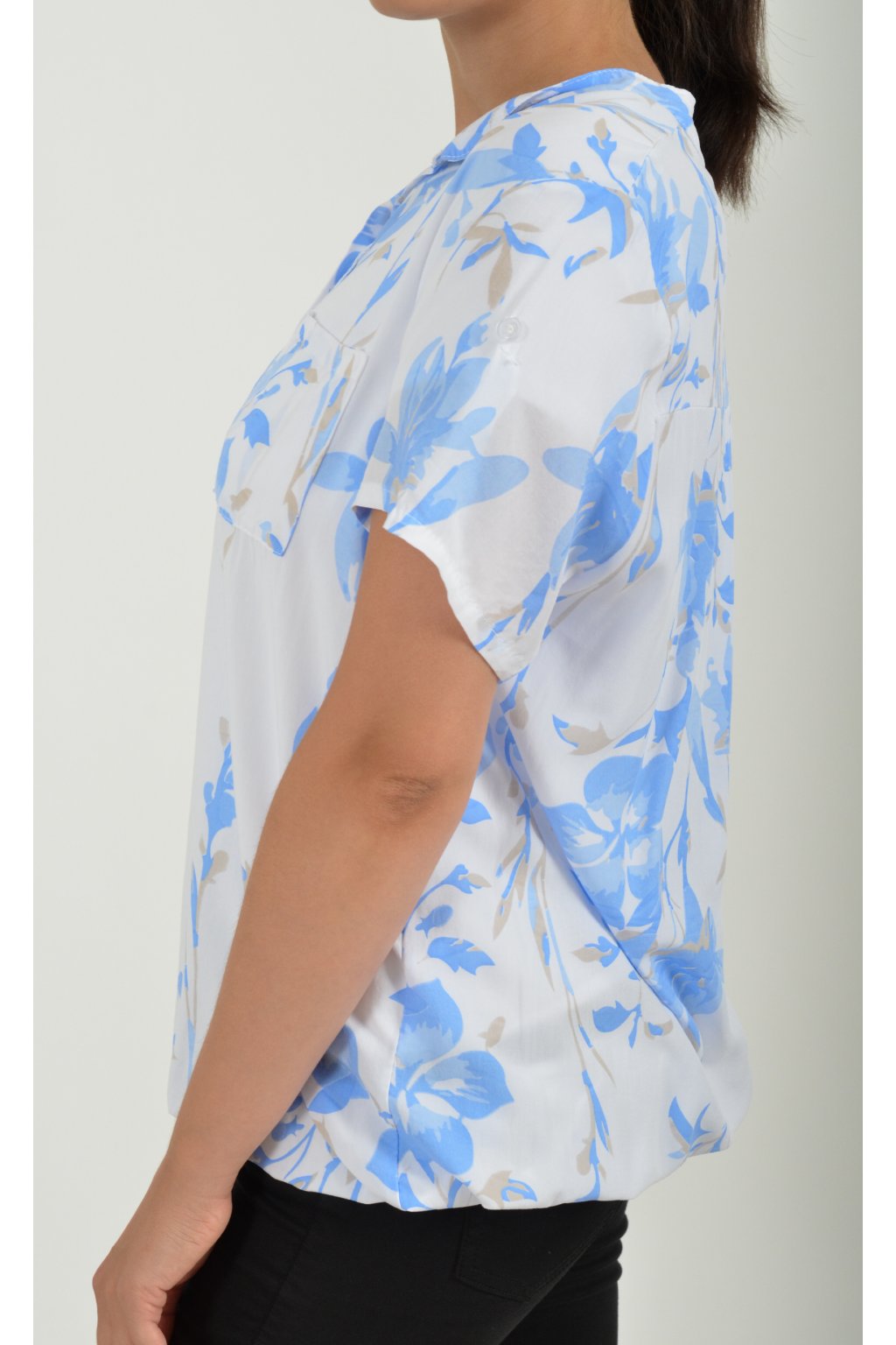 Vzorovaná halenka s krátkým rukávem a náprsní kapsou. Halenka má výstřih do V na 3 knoflíky. Je vyrobena z velice příjemného a vzdušného materiálu. Spodní část halenky je do gumy, lze tedy jednoduše podkasat.