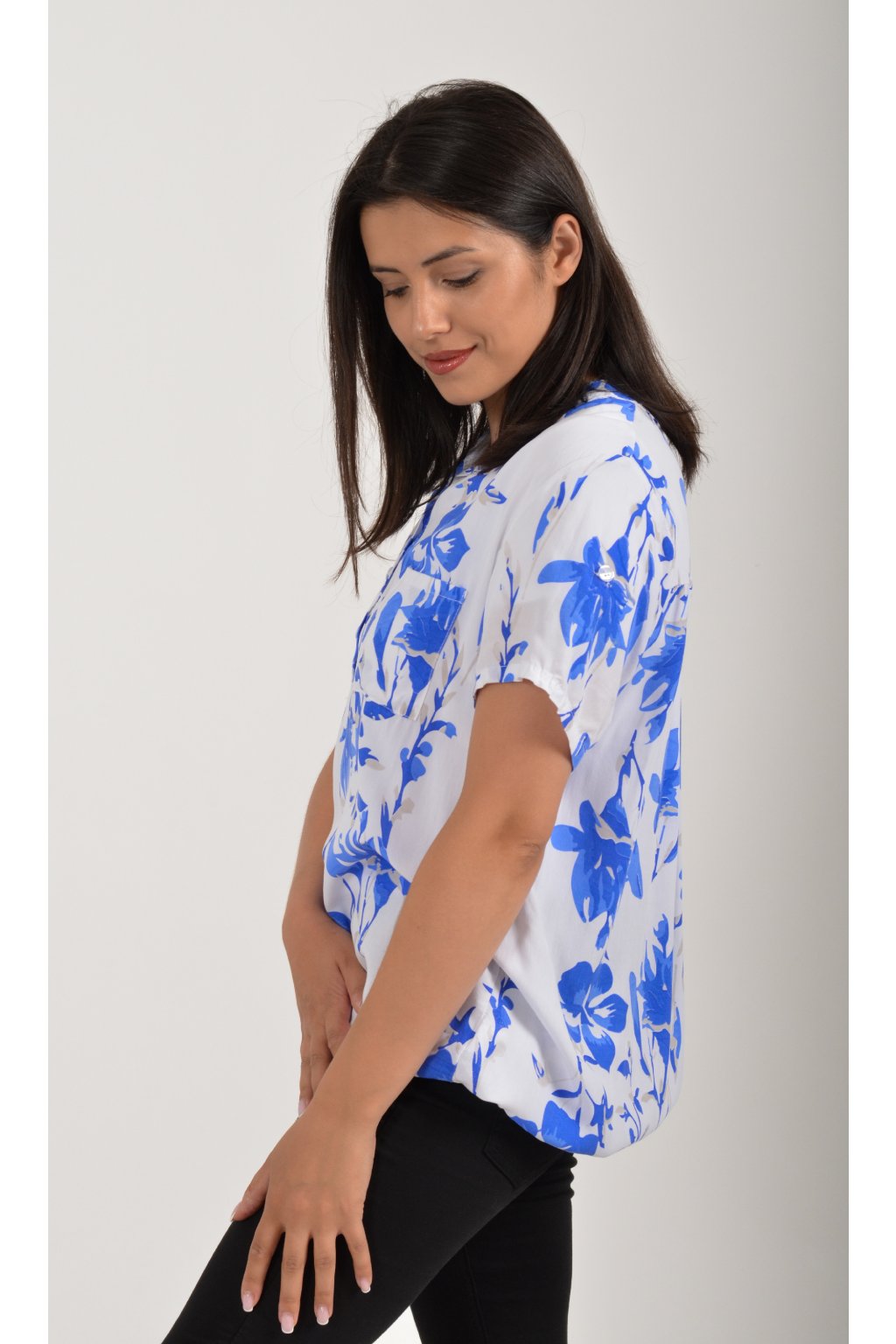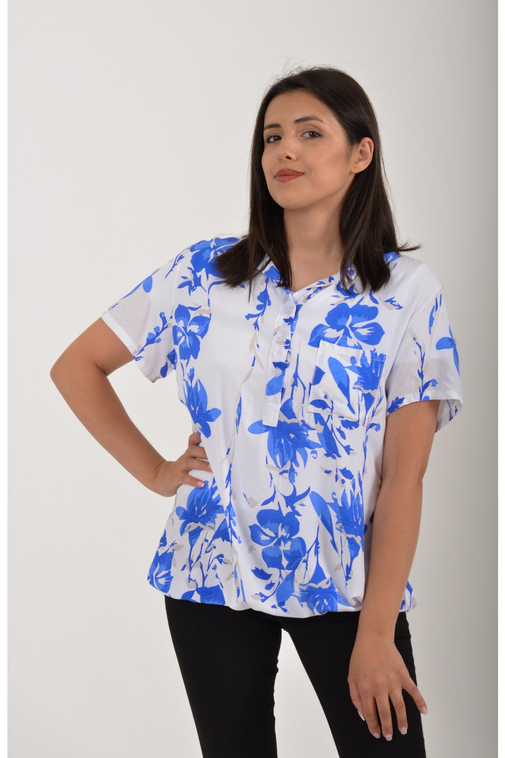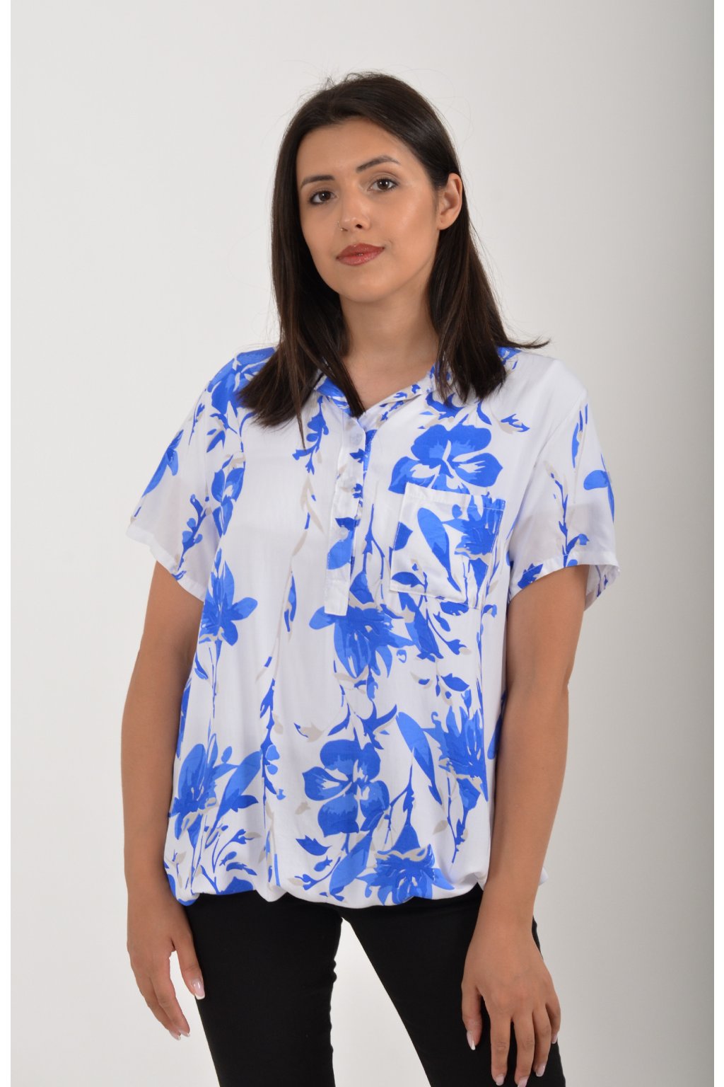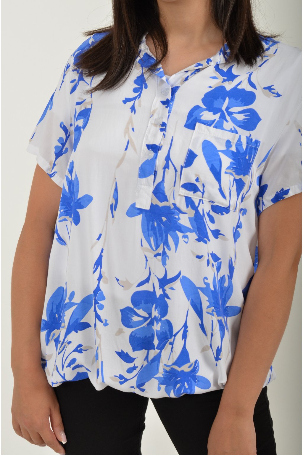 Vzorovaná halenka s krátkým rukávem a náprsní kapsou. Halenka má výstřih do V na 3 knoflíky. Je vyrobena z velice příjemného a vzdušného materiálu. Spodní část halenky je do gumy, lze tedy jednoduše podkasat.